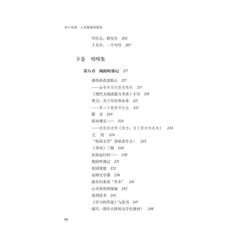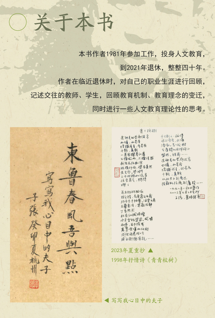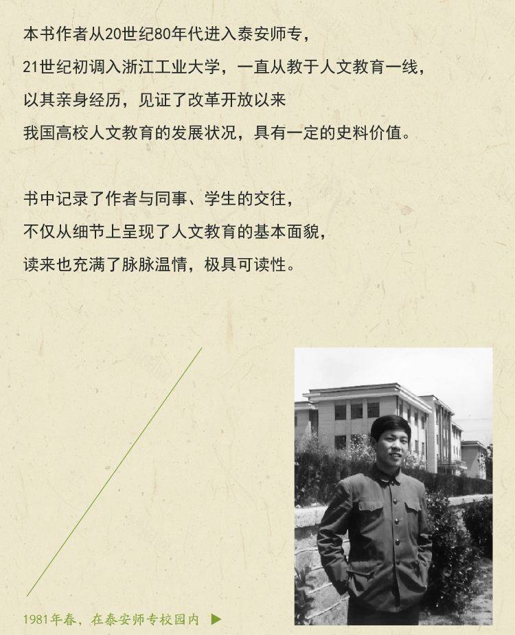 本书作者1981年参加工作,投身人文教育,到2021年退休,整整四十年。作者在临近退休时,对自己的职业生涯进行回顾,记述交往的教师、学生,回顾教育机制、教育理念的变迁,同时进行一些人文教育理论性的思考。本书作者从20世纪80年代进入泰安师专,21世纪初调入浙江工业大学,一直从教于人文教育一线,以其亲身经历,见证了改革开放以来我国高校人文教育的发展状况,具有一定的史料价值。书中记录了作者与同事、学生的交往,不仅从细节上呈现了人文教育的基本面貌,读来也充满了脉脉温情,极具可读性。