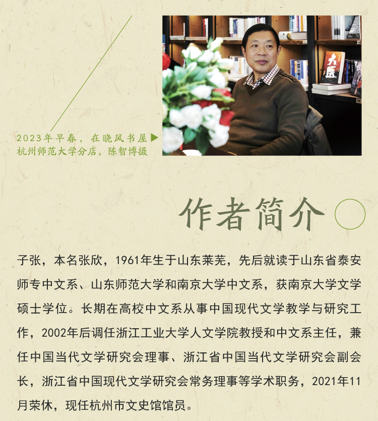 子张,本名张欣,1961年生于山东莱芜,先后就读于山东省泰安师专中文系、山东师范大学和南京大学中文系,获南京大学文学硕士学位。长期在高校中文系从事中国现代文学教学与研究工作,2002年后调任浙江工业大学人文学院教授和中文系主任,兼任中国当代文学研究会理事、浙江省中国当代文学研究会副会长,浙江省中国现代文学研究会常务理事等学术职务,2021年11月荣休,现任杭州市文史馆馆员。