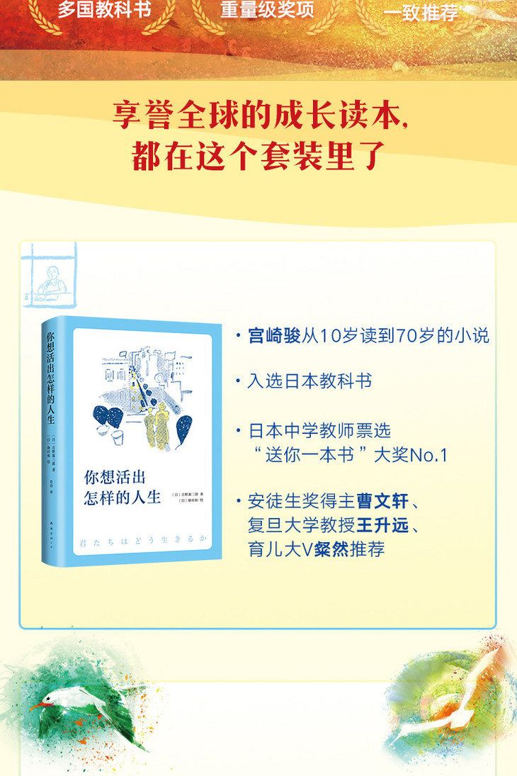 ★《你想活出怎样的人生》是宫崎骏从10岁读到70岁的经典小说,入选日本学校教科书,领衔日本中学教师票选“送你一本书大奖”,获安徒生奖得主曹文轩、东京大学教授丸山真男、复旦大学教授王升远、《教育报》特聘专家三川玲倾情推荐