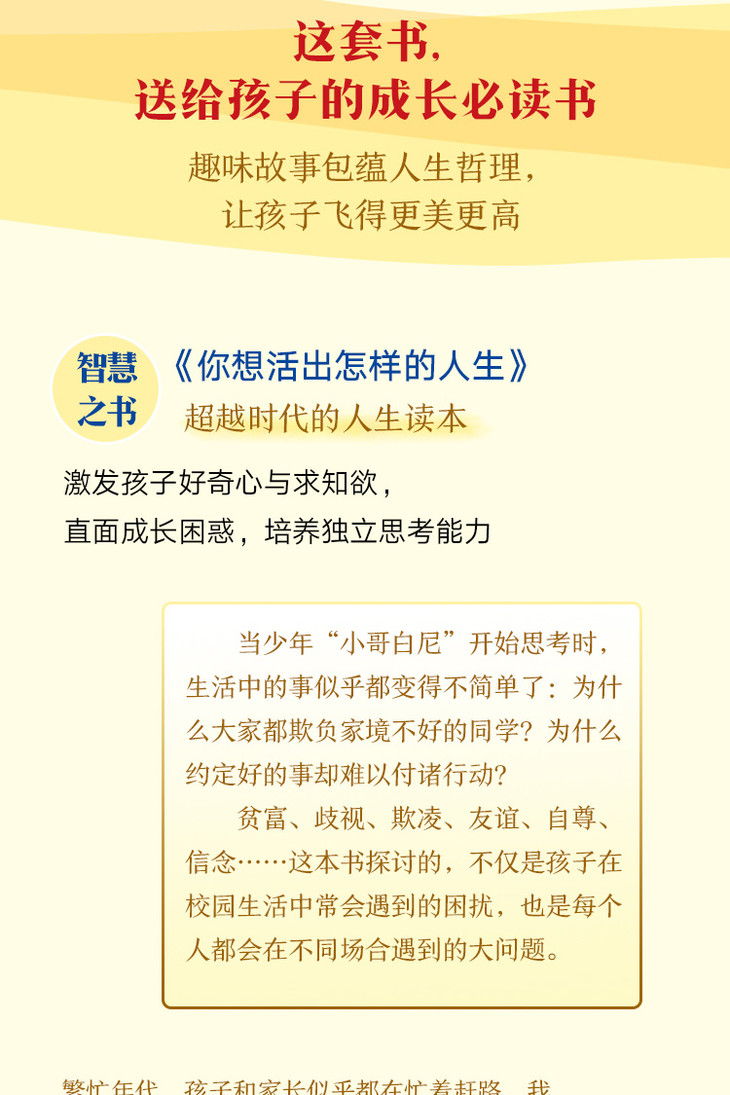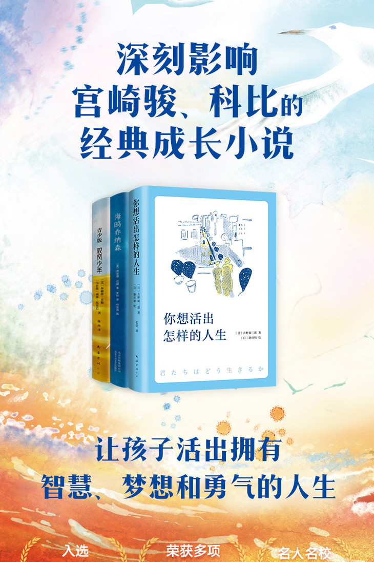 《你想活出怎样的人生(套装全3册)》精选享誉世界的杰出青少年文学代表作,含《你想活出怎样的人生》《驭风少年》《海鸥乔纳森》3本小说。《你想活出怎样的人生(套装全3册)》畅销数千万册,入选中美英法德日等国教科书,获多项权·威大奖,深刻影响了宫崎骏、科比等名人,是一套难得的经典成长读本。孩子可以从几位小主人公生动有趣的经历中收获独立思考、追求卓·越、勇于面对困难等宝贵品格,受益终生,活出拥有智慧、梦想和勇气的人生。
