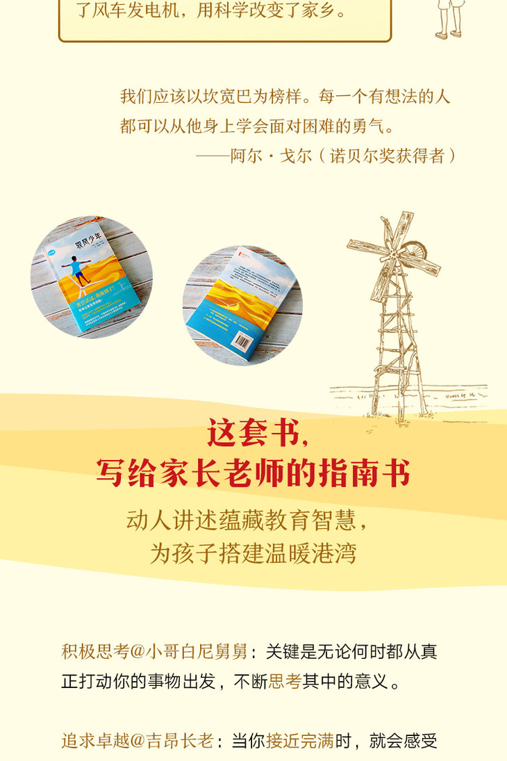 ★ 我们应该将《驭风少年》坎宽巴发明风车发电机的事情作为榜样,每一个有想法的人都可以从他身上学会面对困难的勇气。——阿尔·戈尔(诺贝尔奖得主)