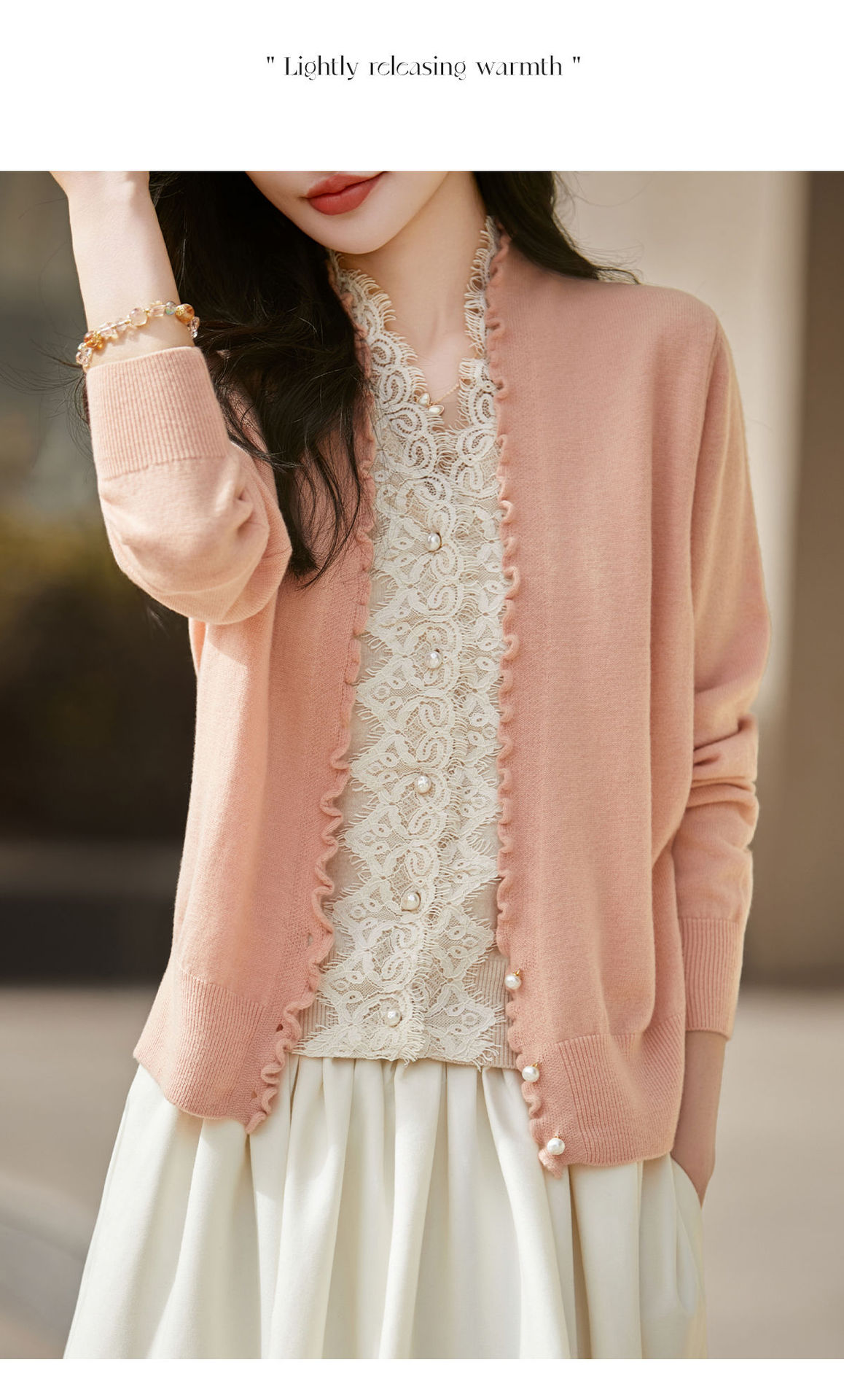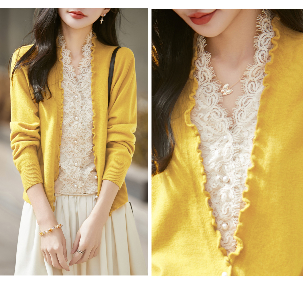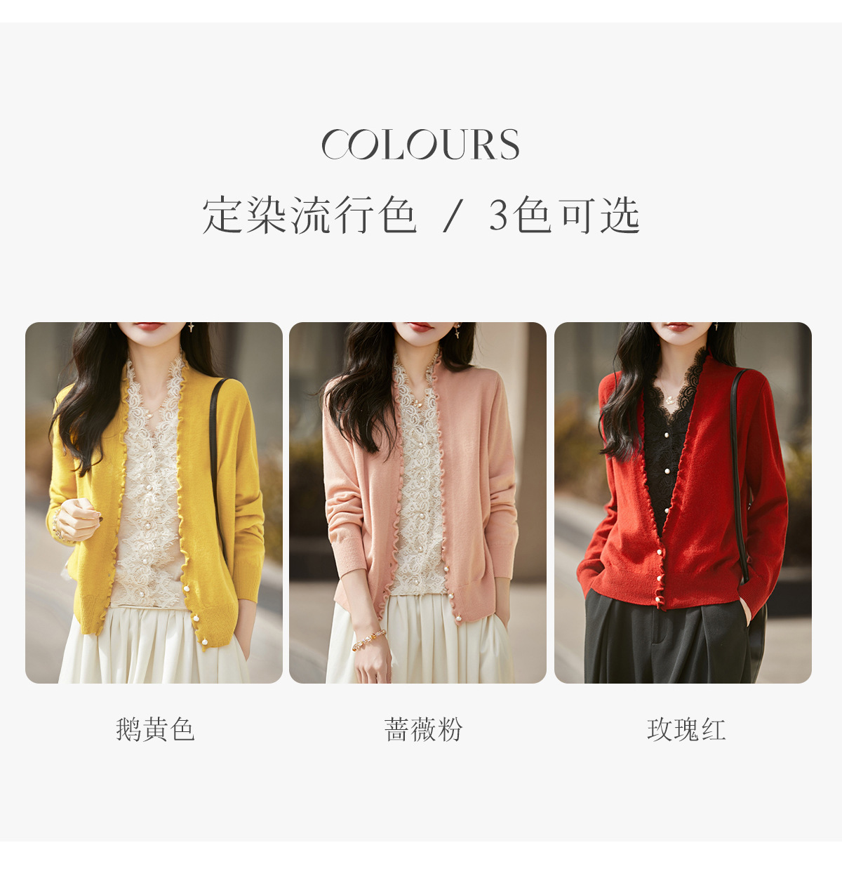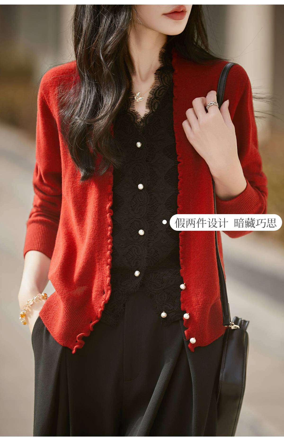 百媚生 蚕丝羊毛蕾丝假两件针织开衫外套V领上衣NS-6010A-70