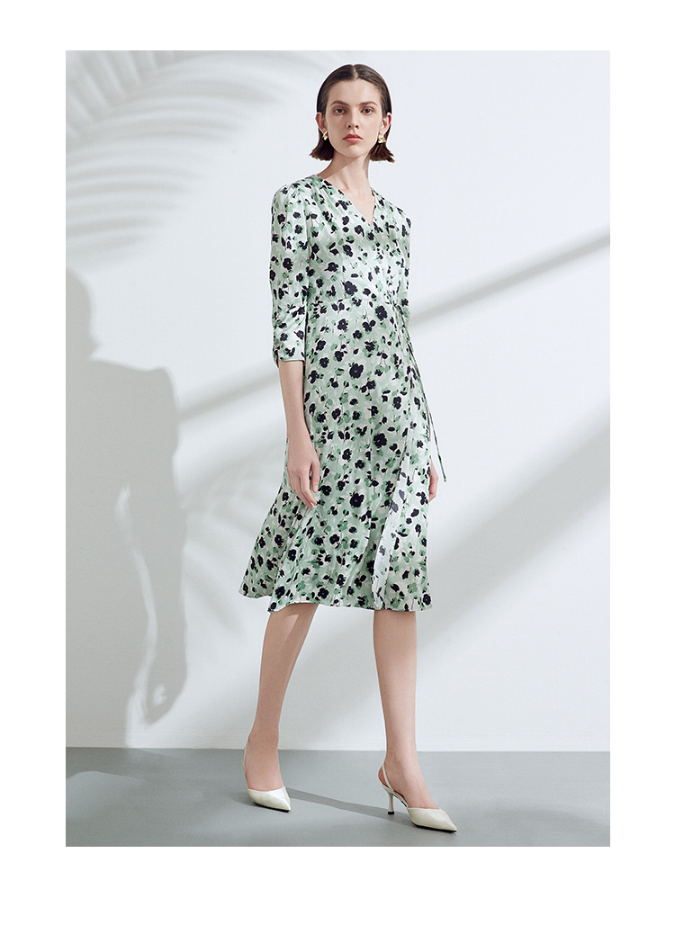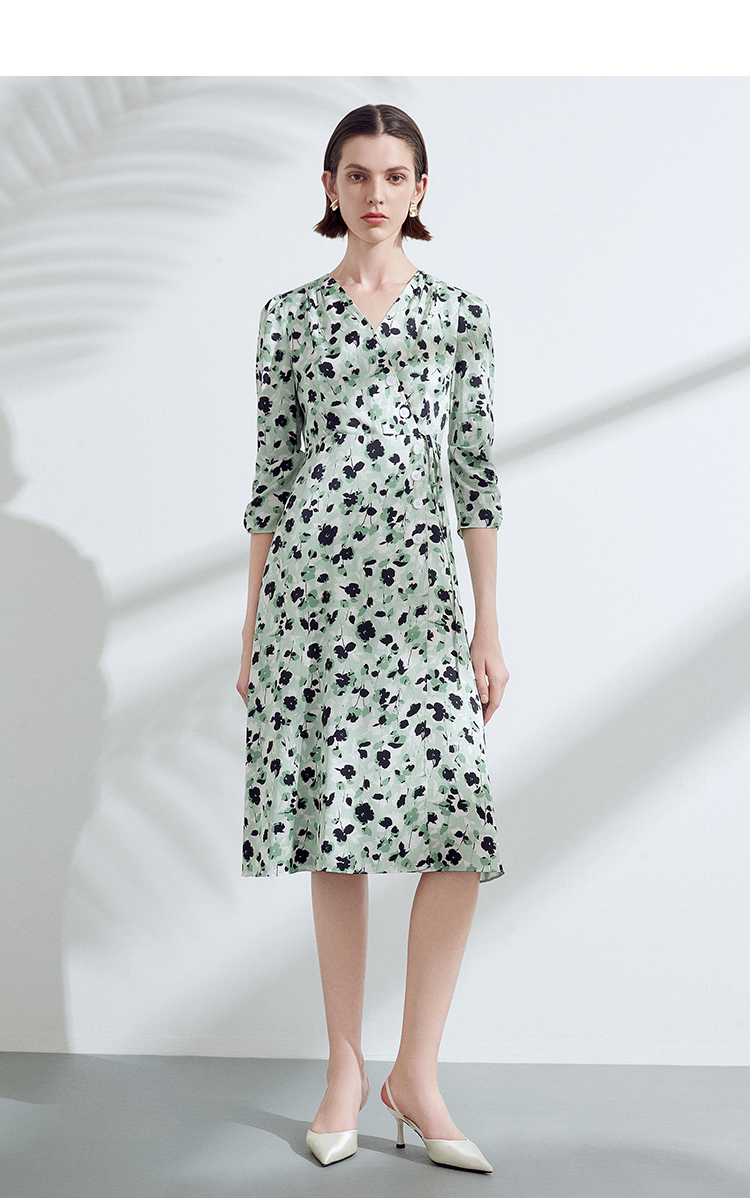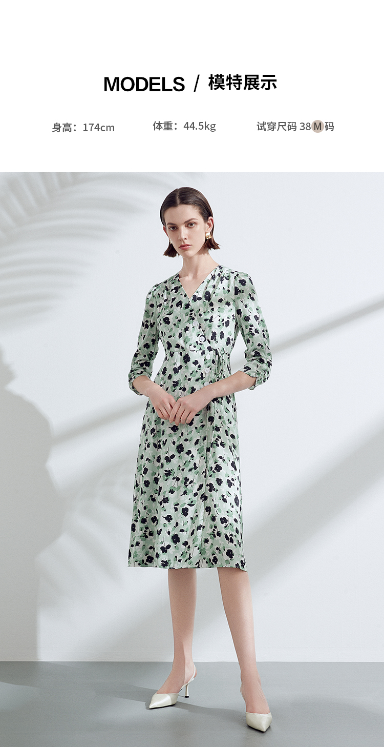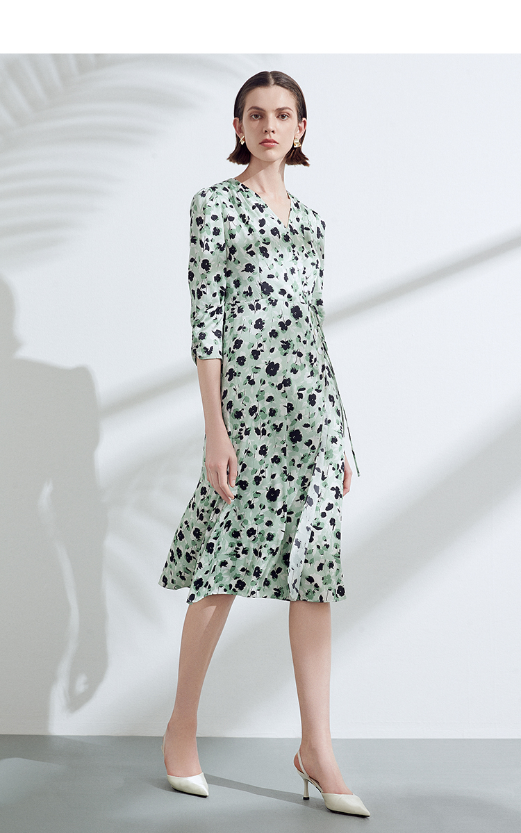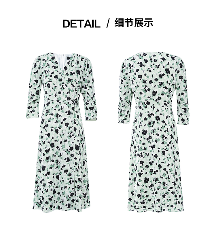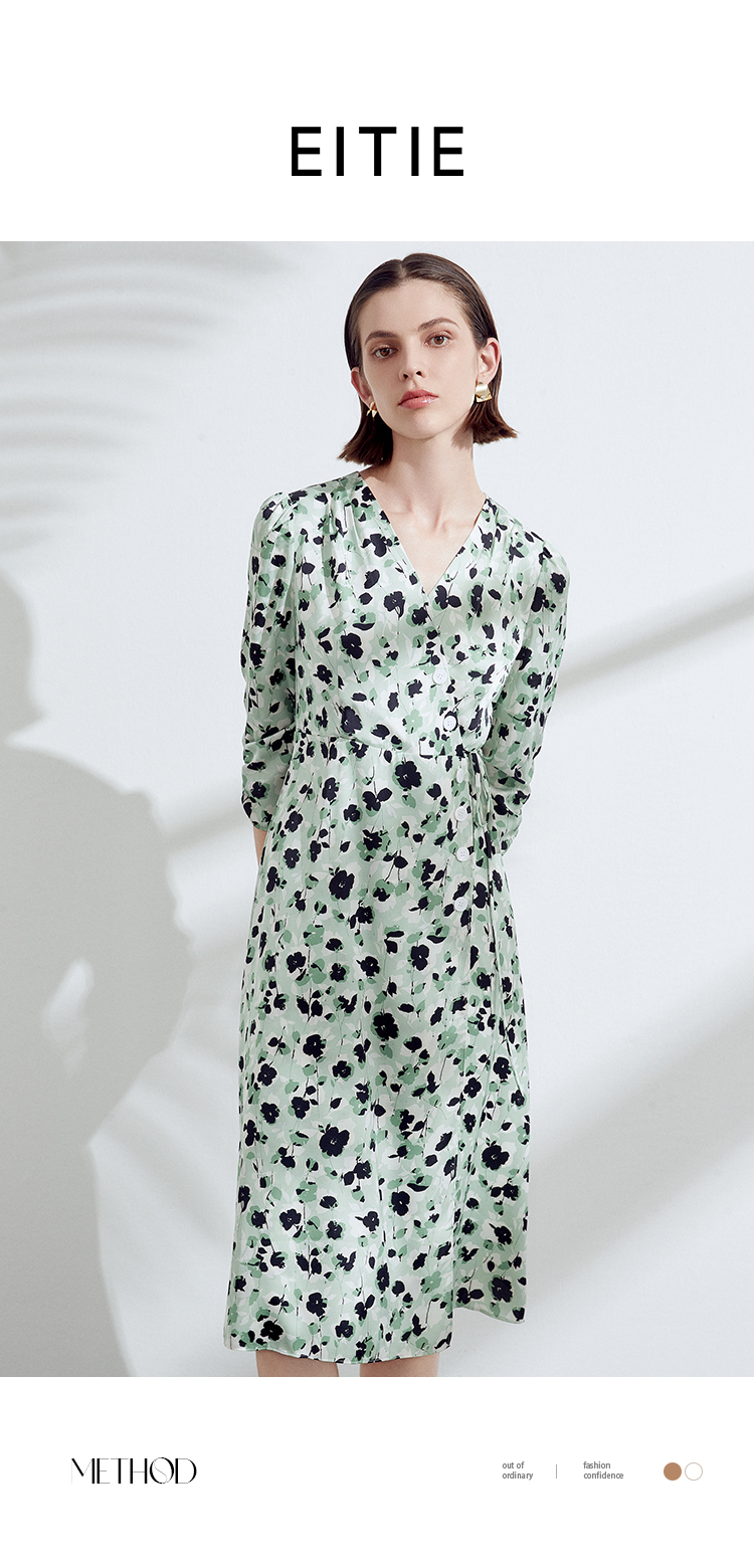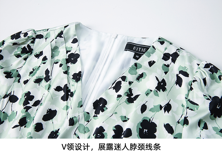 EITIE爱特爱夏季新款优雅法式V领收腰气质中袖印花连衣裙7807529