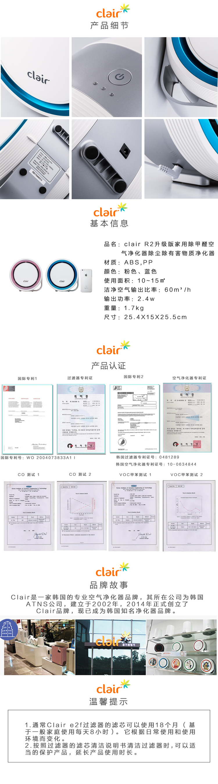韩国原产clair R2升级版家用除甲醛除尘除有害物质净化器