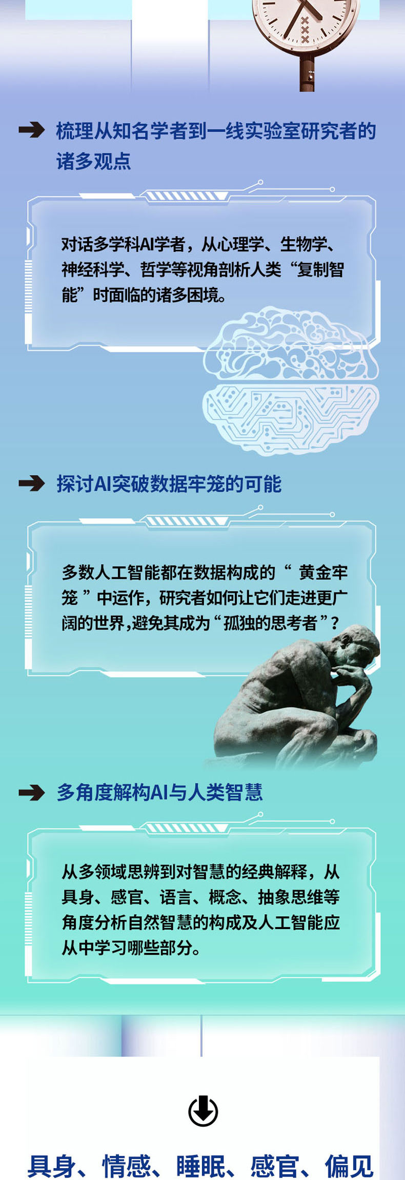 此外,本书着重探讨了人工智能与人类智慧之间的关系。目前人工智能还无法摆脱工具的标签,更遑论像人类一样进行思考。具身、情感、睡眠、感官……人类一次次为机器补上缺失的拼图,却在这个过程中逐渐理解何为人类智慧,并被自然智慧的复杂折服。