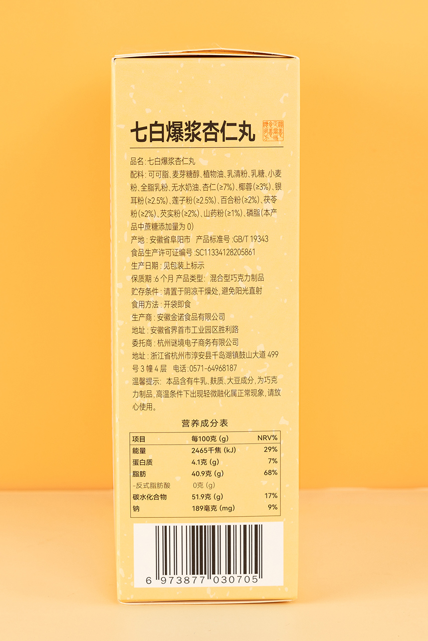 【配料表】:可可脂、麦芽糖醇、植物油、乳清粉、乳糖、小麦粉、全脂乳粉、无水奶油、杏仁(≥7%)、椰蓉(≥3%)、银耳粉(≥2.5%)、莲子粉(≥2.5%)、百合粉(≥2%)、茯苓粉(≥2%)、芡实粉(≥2%)、山药粉(≥1%)、磷脂(本产品中蔗糖添加量为0)