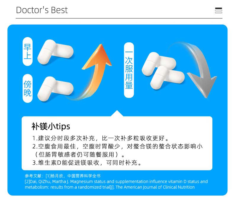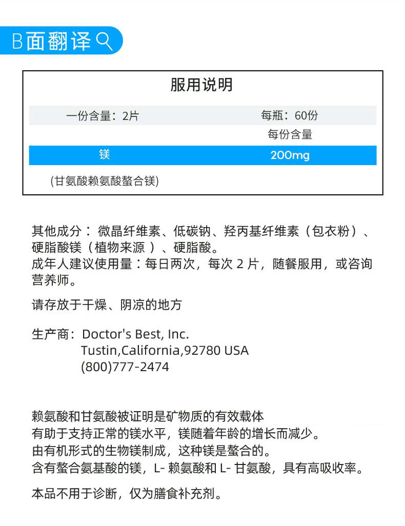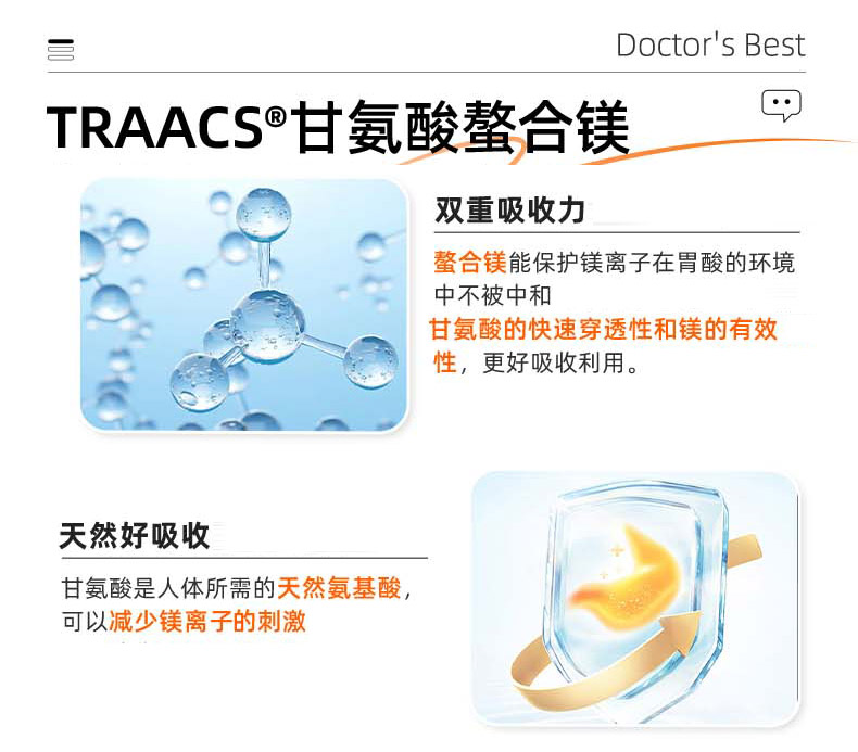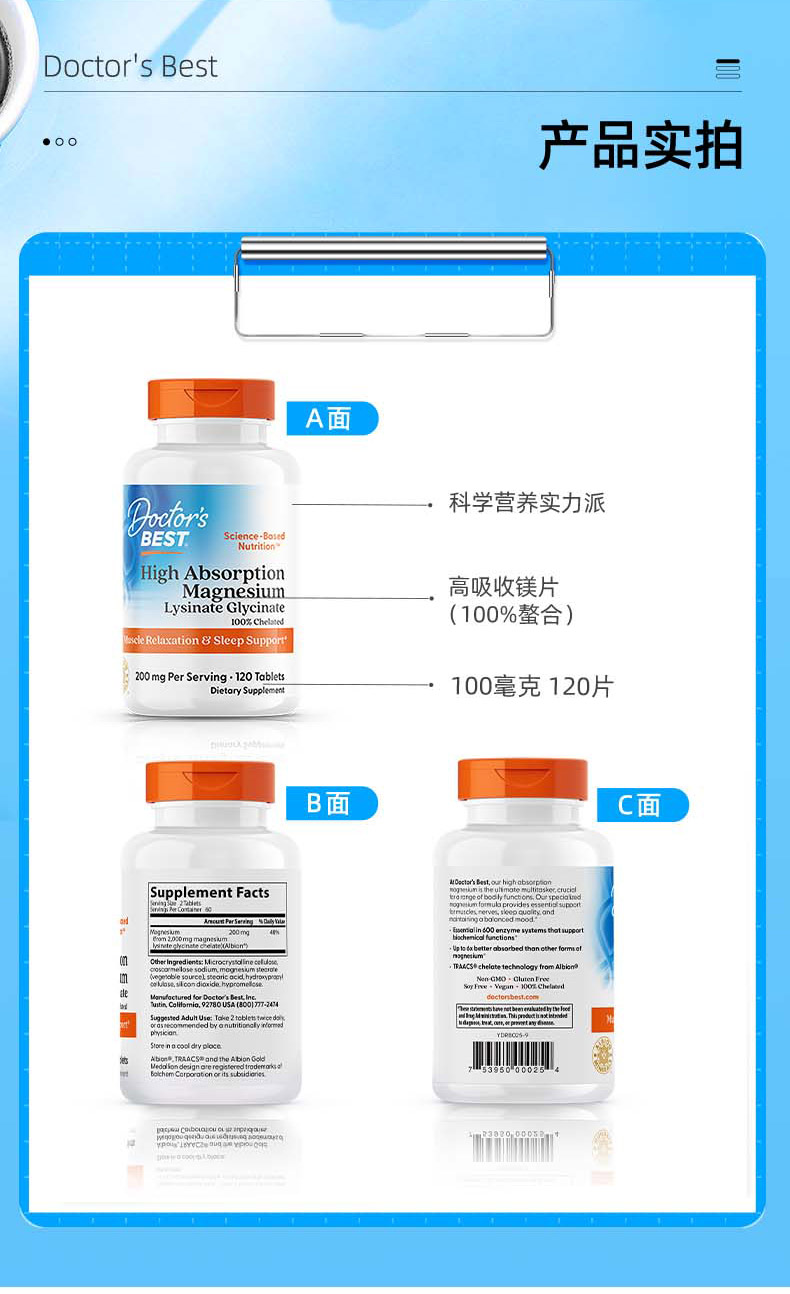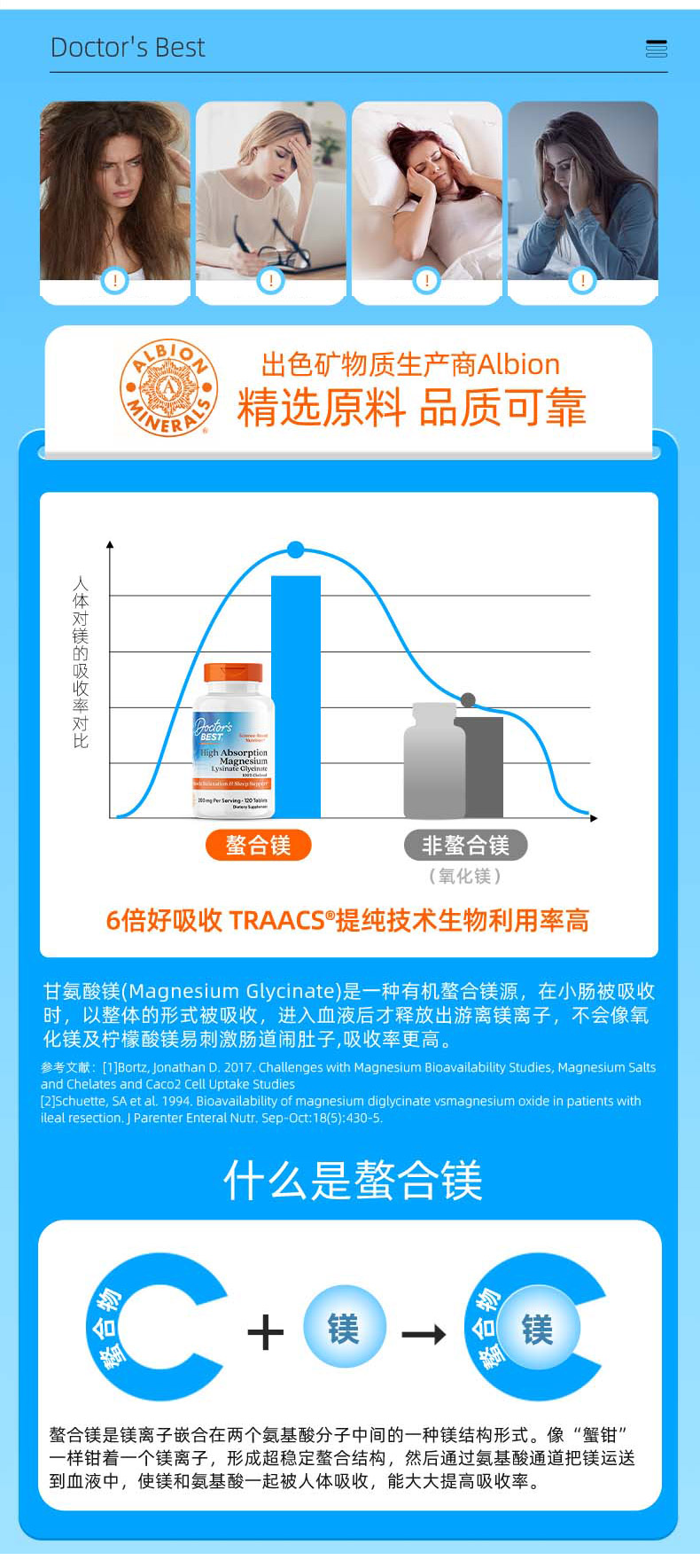 【多特贝斯】Doctor's Best多特倍斯高吸收甘氨酸镁片100mg*120片