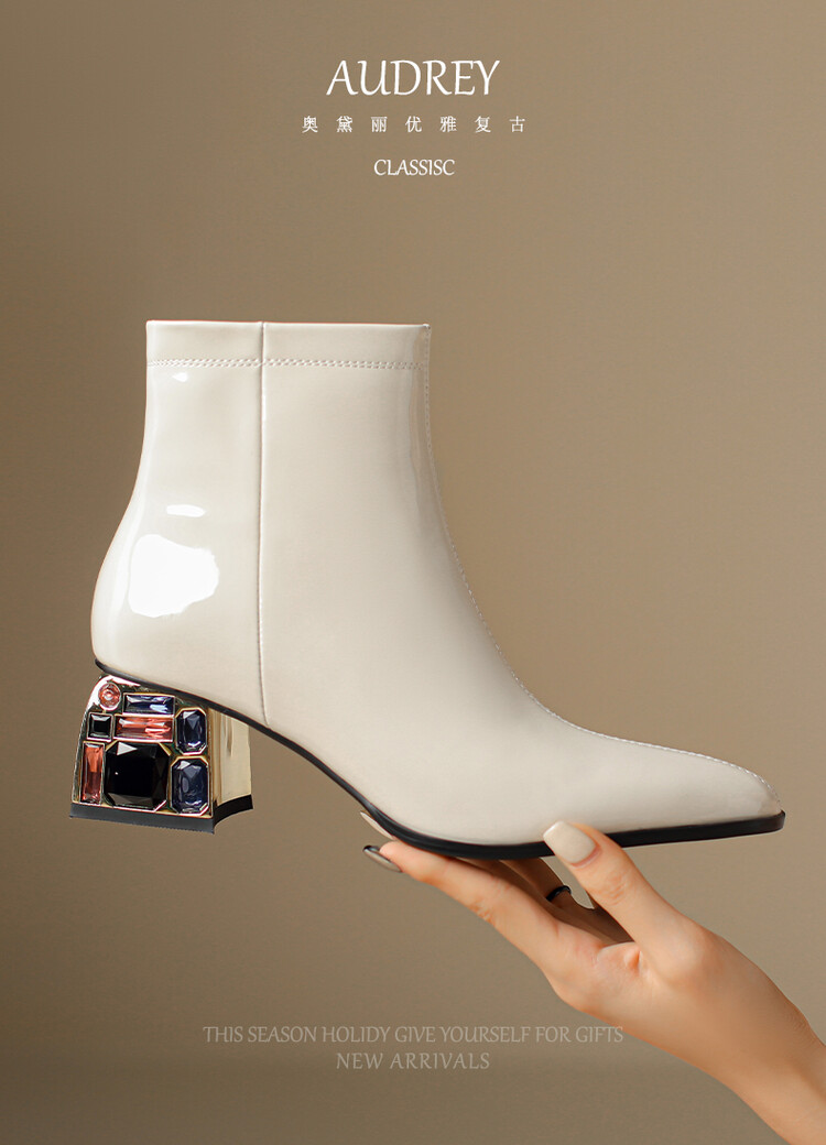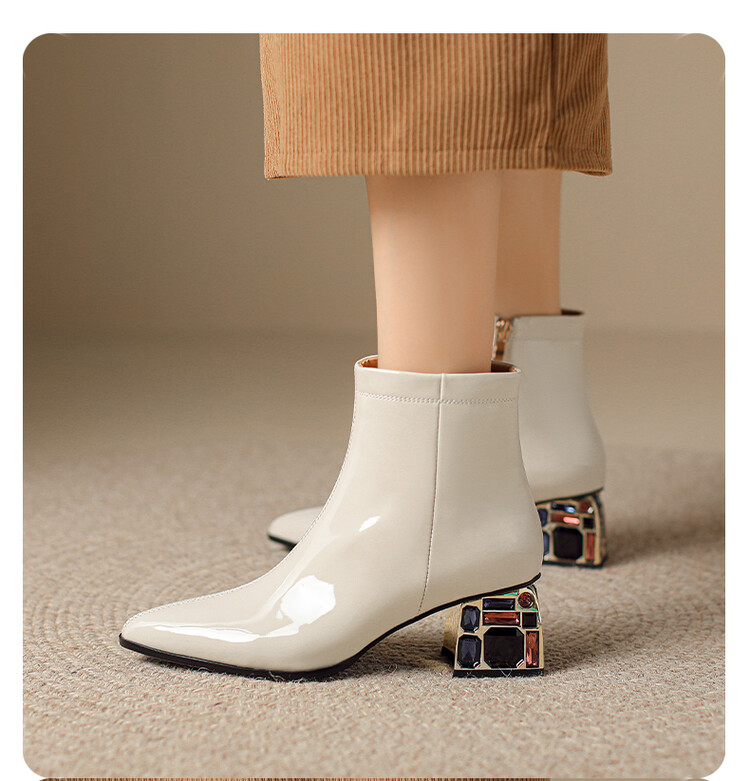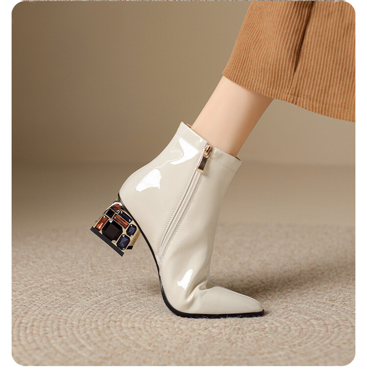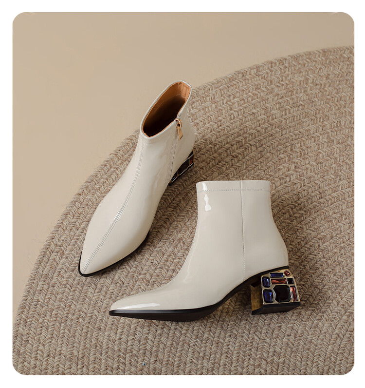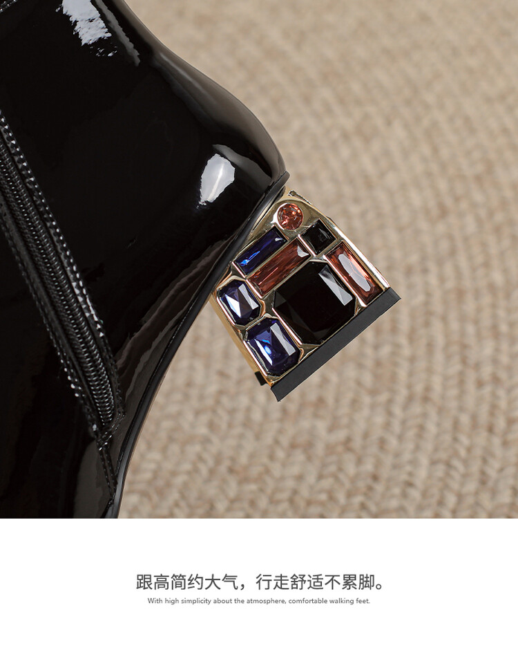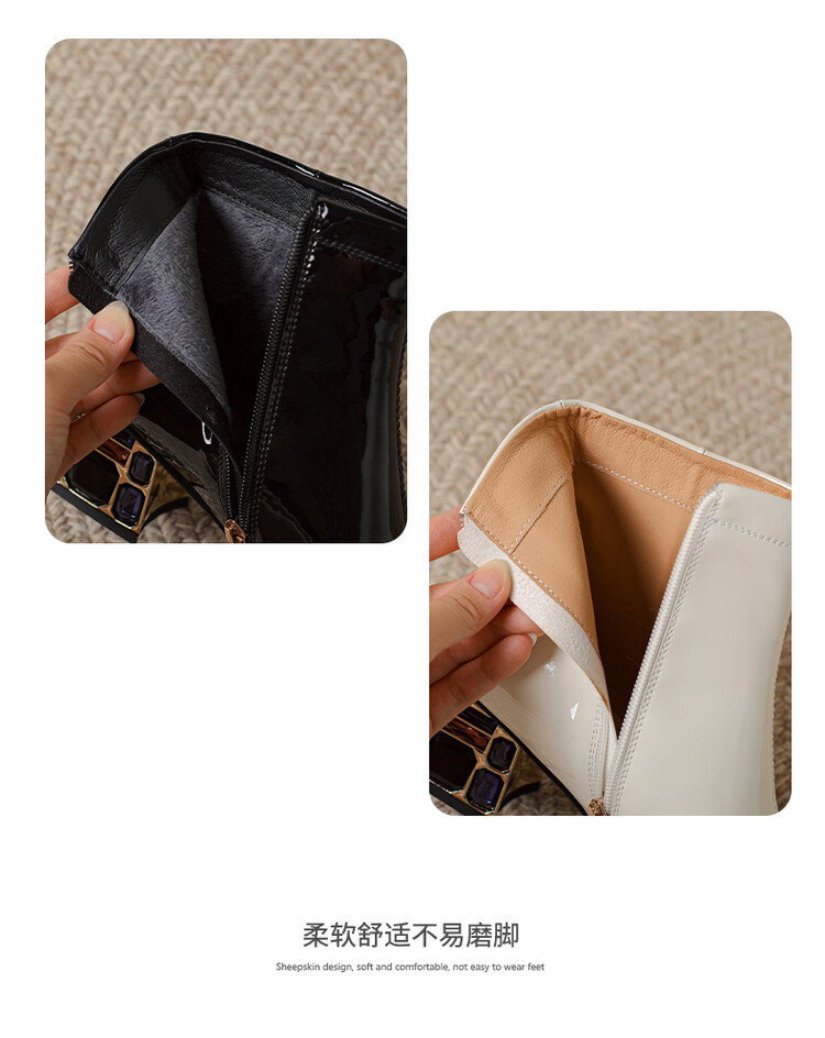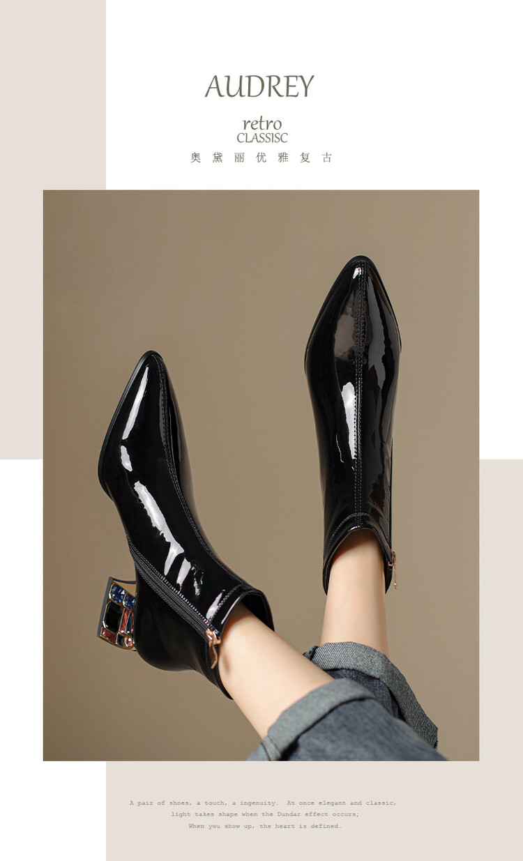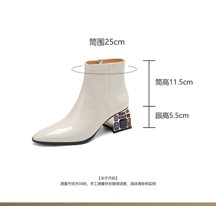 【预售5天】柔软漆皮白色春秋短靴女粗跟时尚尖头显瘦冬季水钻高跟马丁靴DSFG&1567