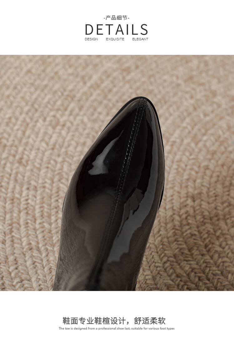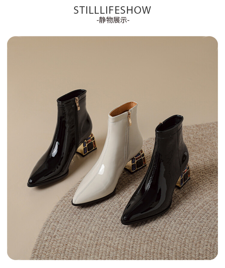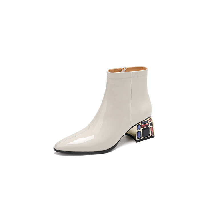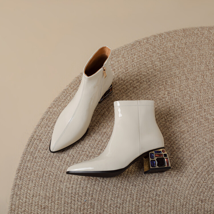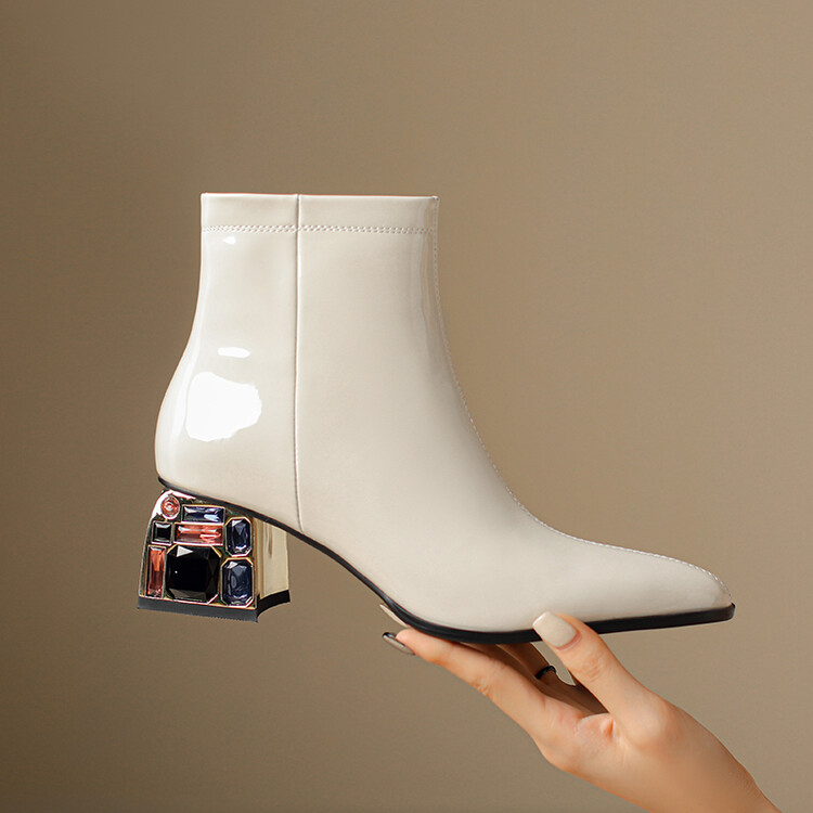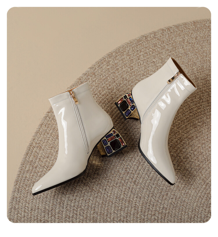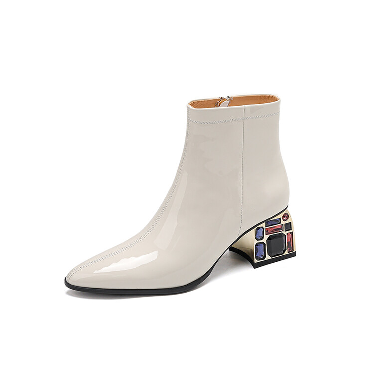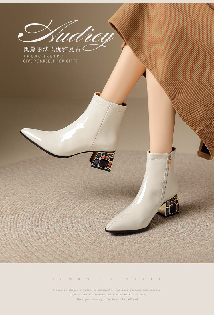 【预售5天】柔软漆皮白色春秋短靴女粗跟时尚尖头显瘦冬季水钻高跟马丁靴DSFG&1567