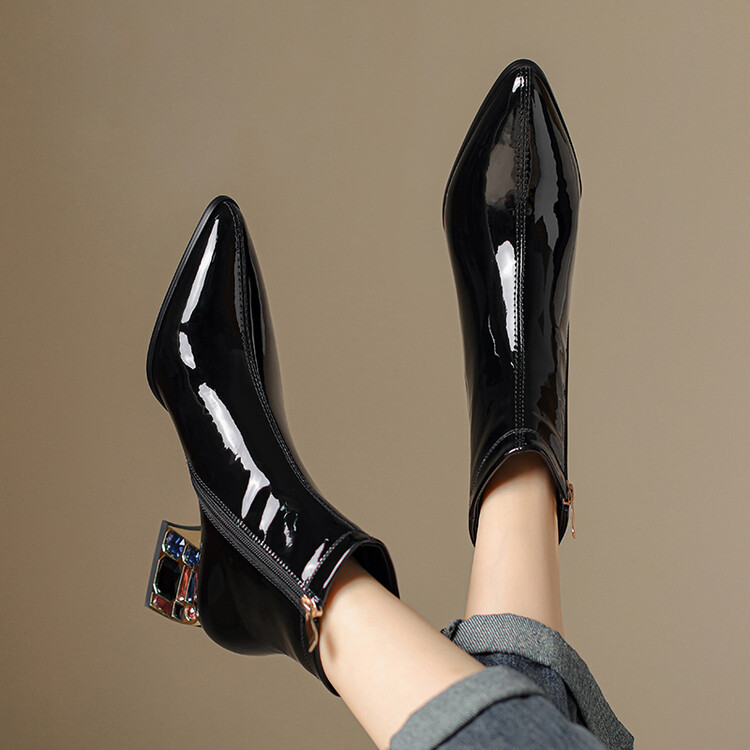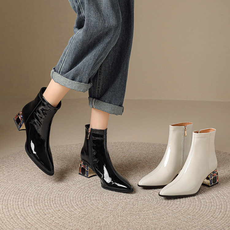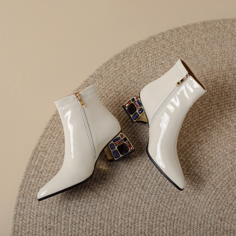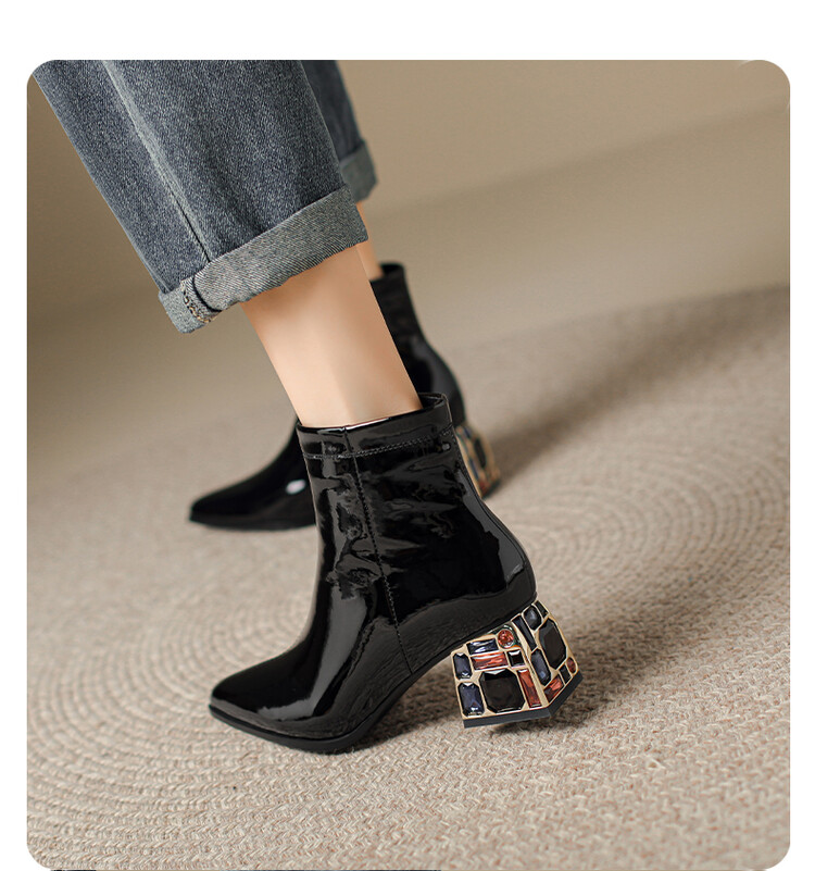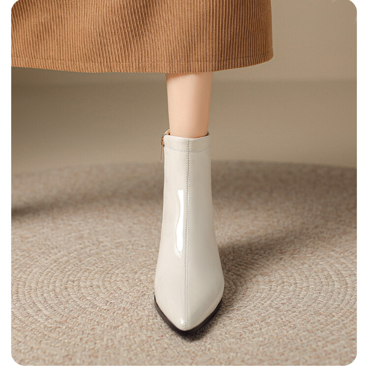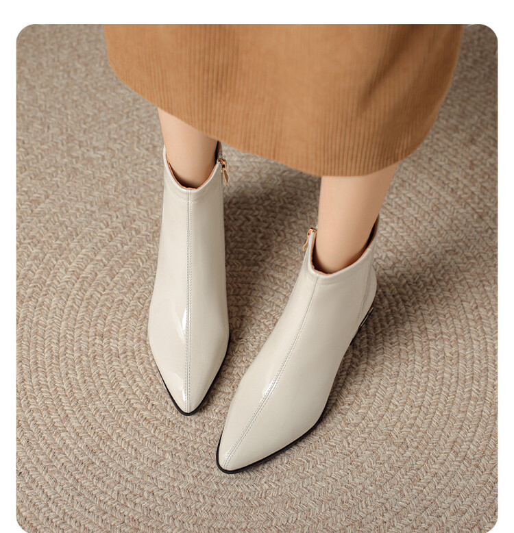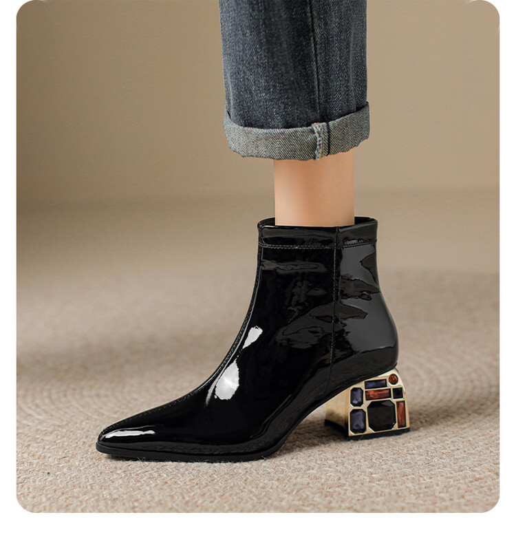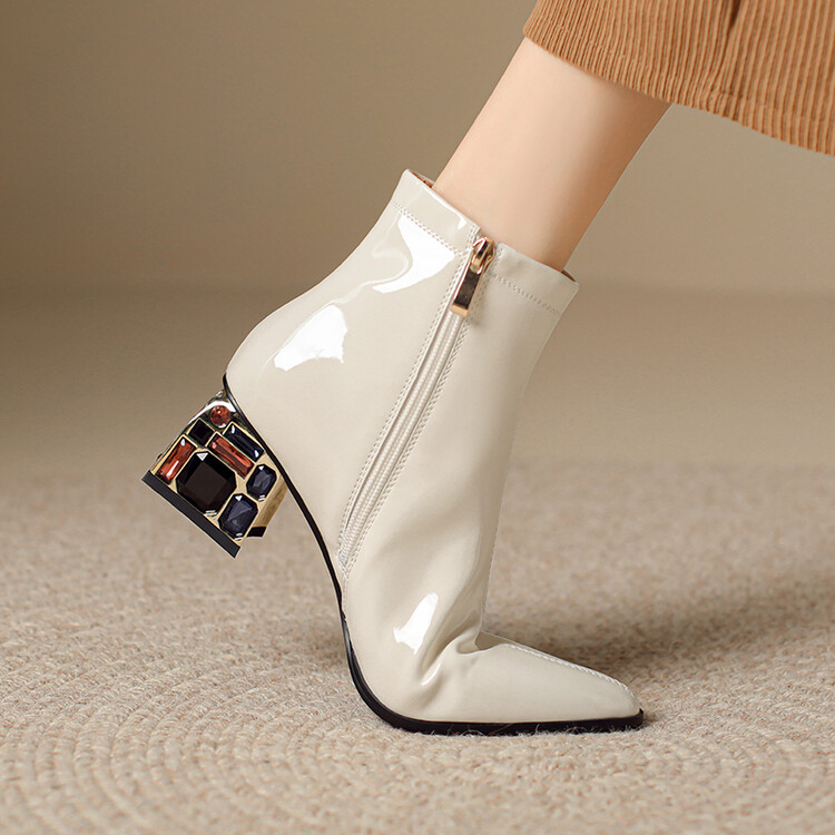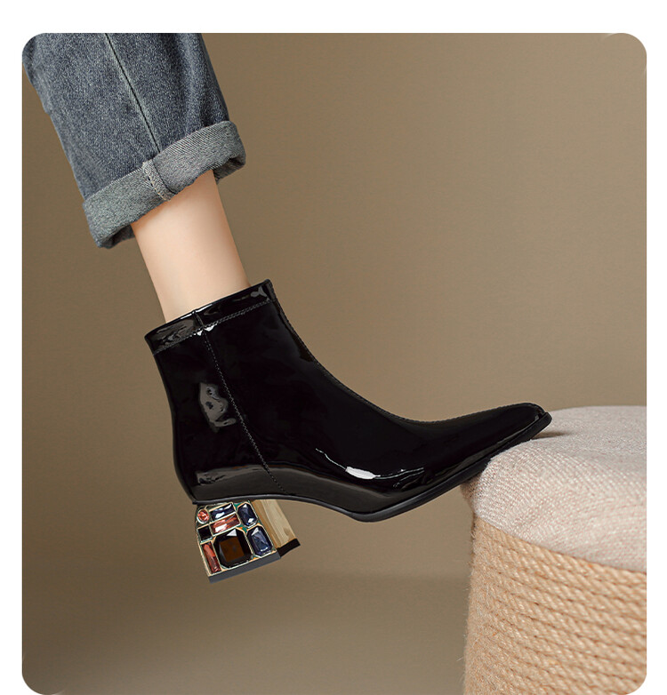 【预售5天】柔软漆皮白色春秋短靴女粗跟时尚尖头显瘦冬季水钻高跟马丁靴DSFG&1567