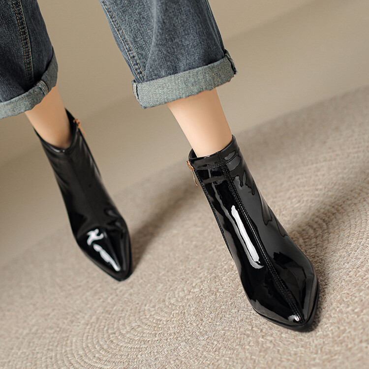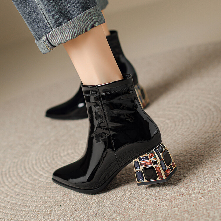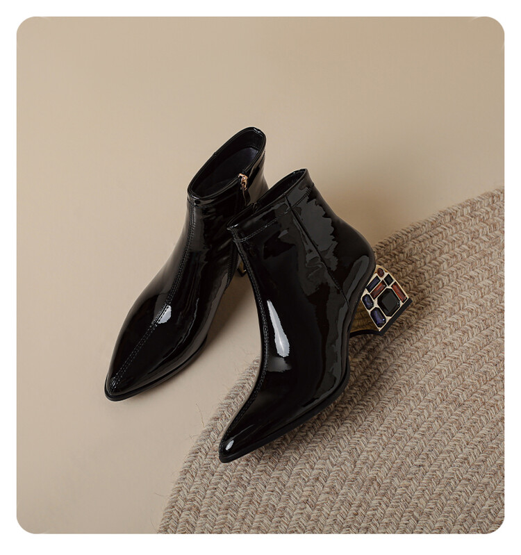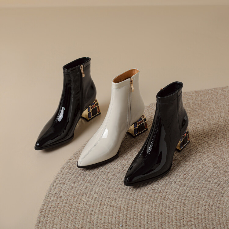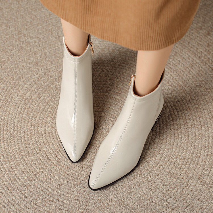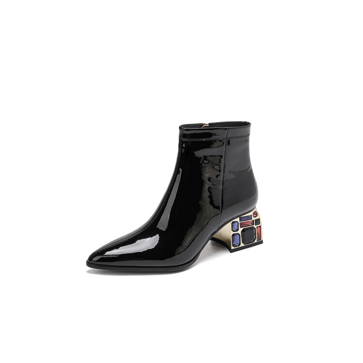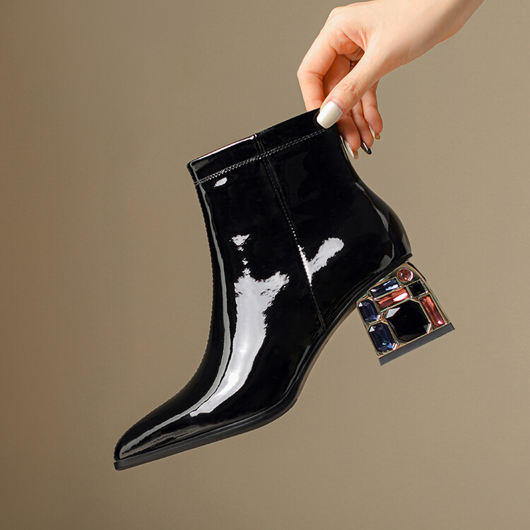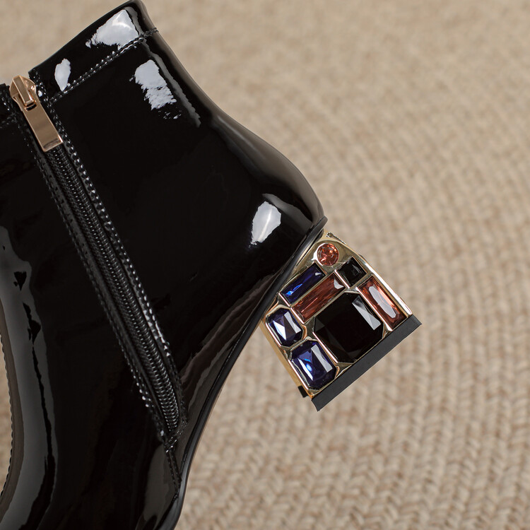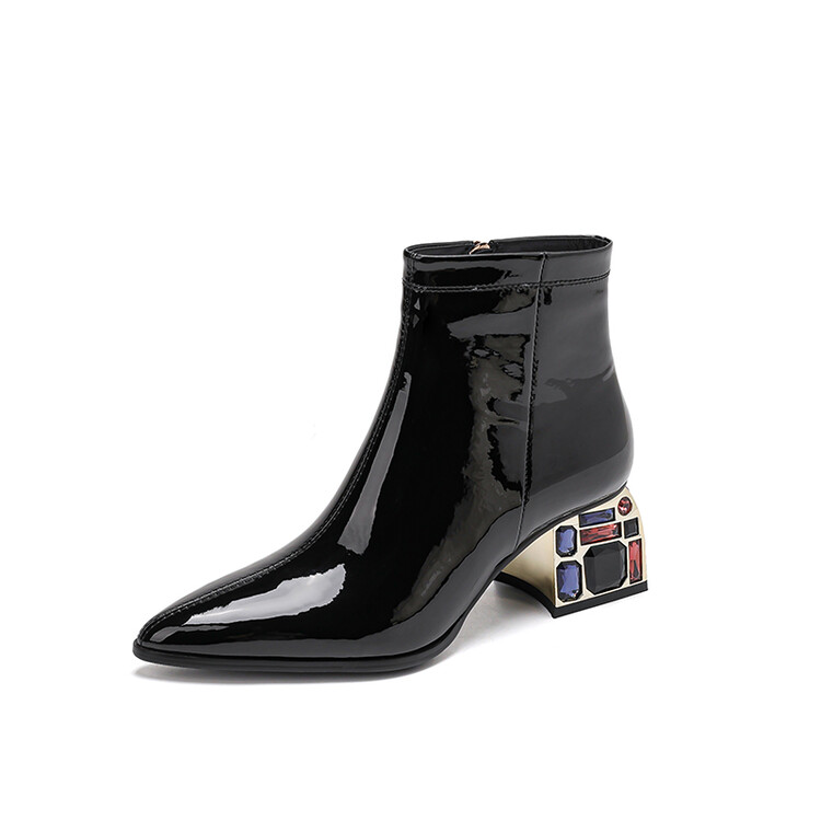 【预售5天】柔软漆皮白色春秋短靴女粗跟时尚尖头显瘦冬季水钻高跟马丁靴DSFG&1567