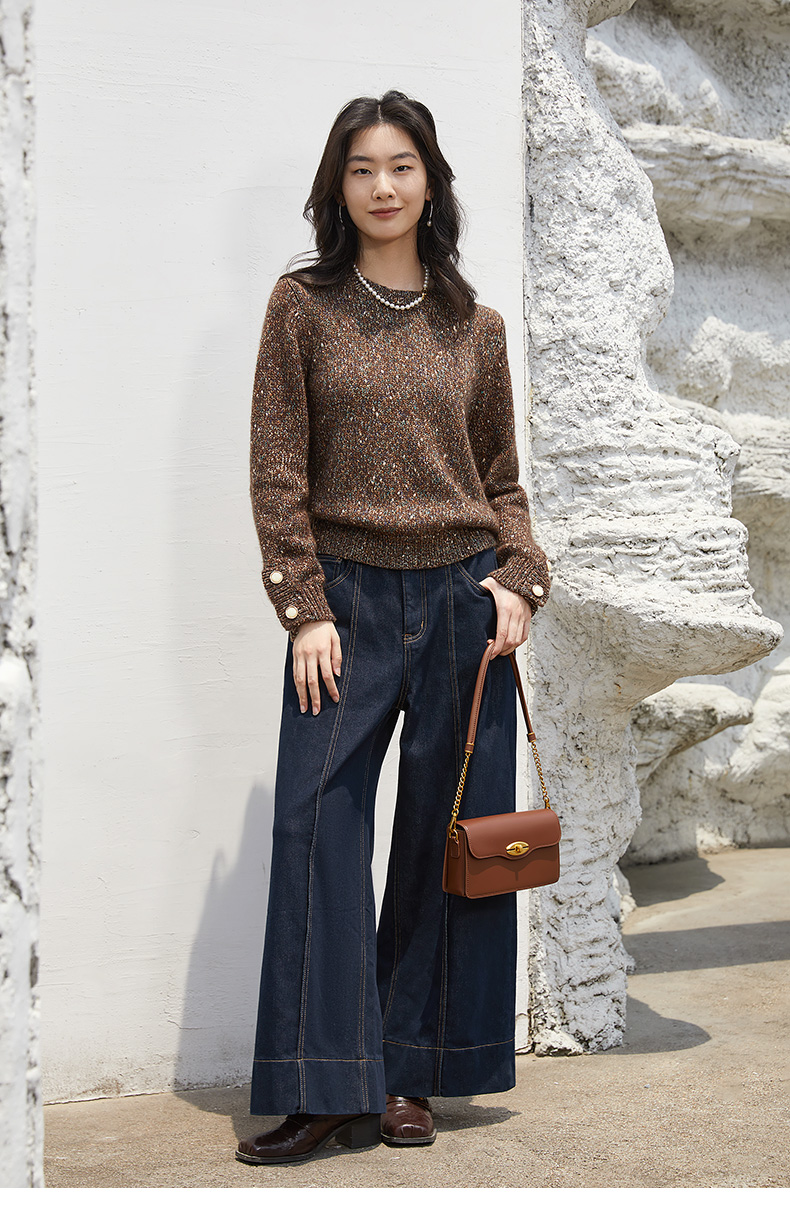 棕调彩点肌理感针织衫 圆领长袖双扣袖口休闲慵懒风毛衣