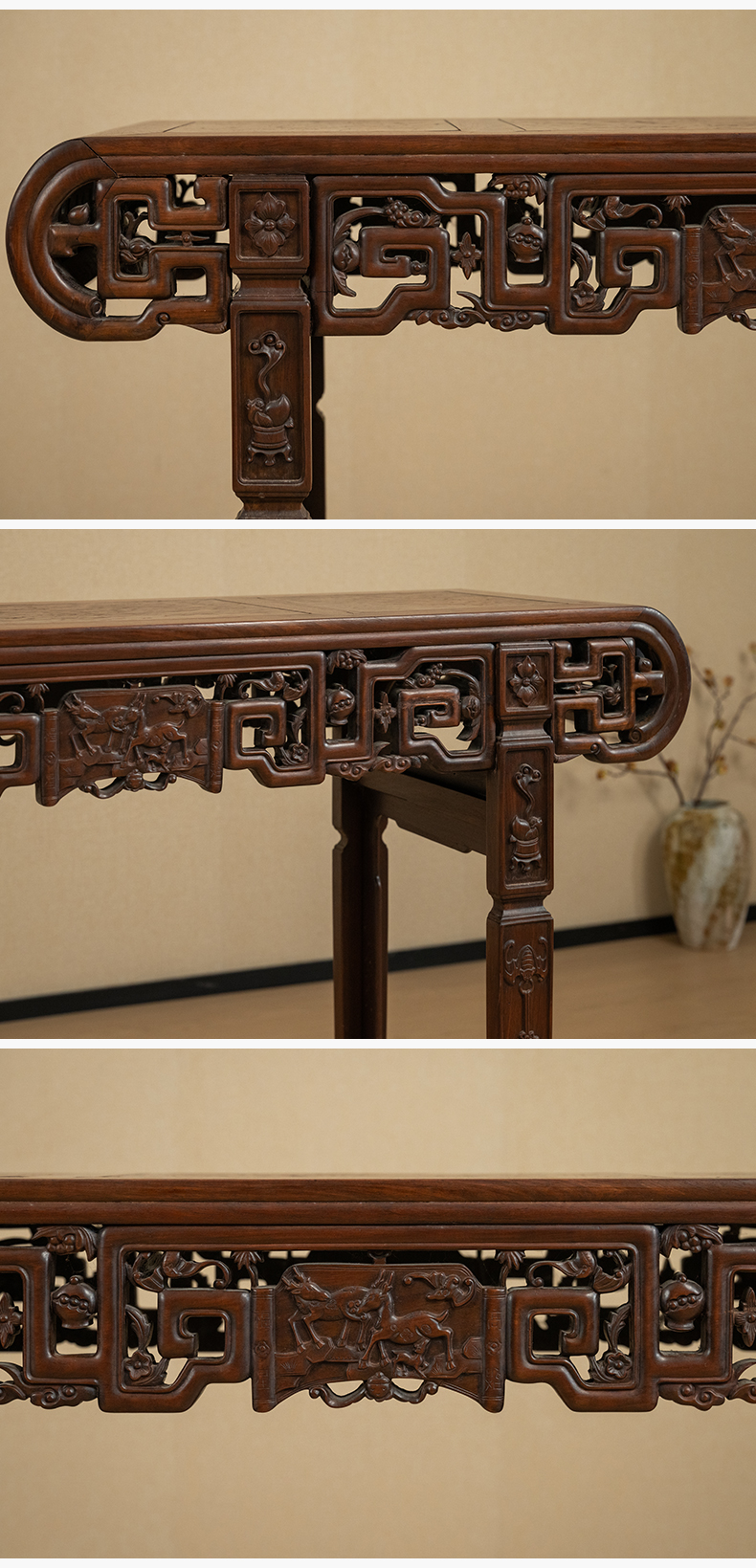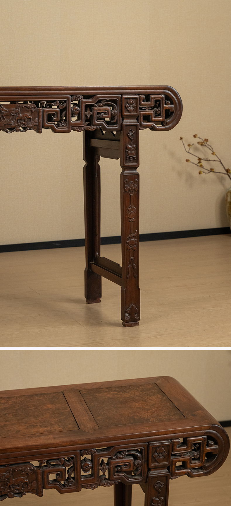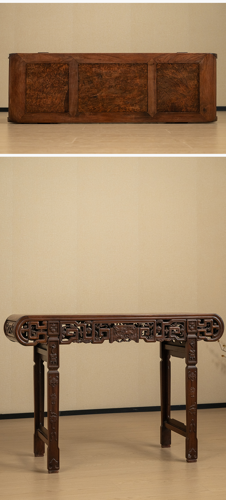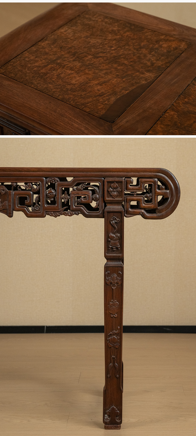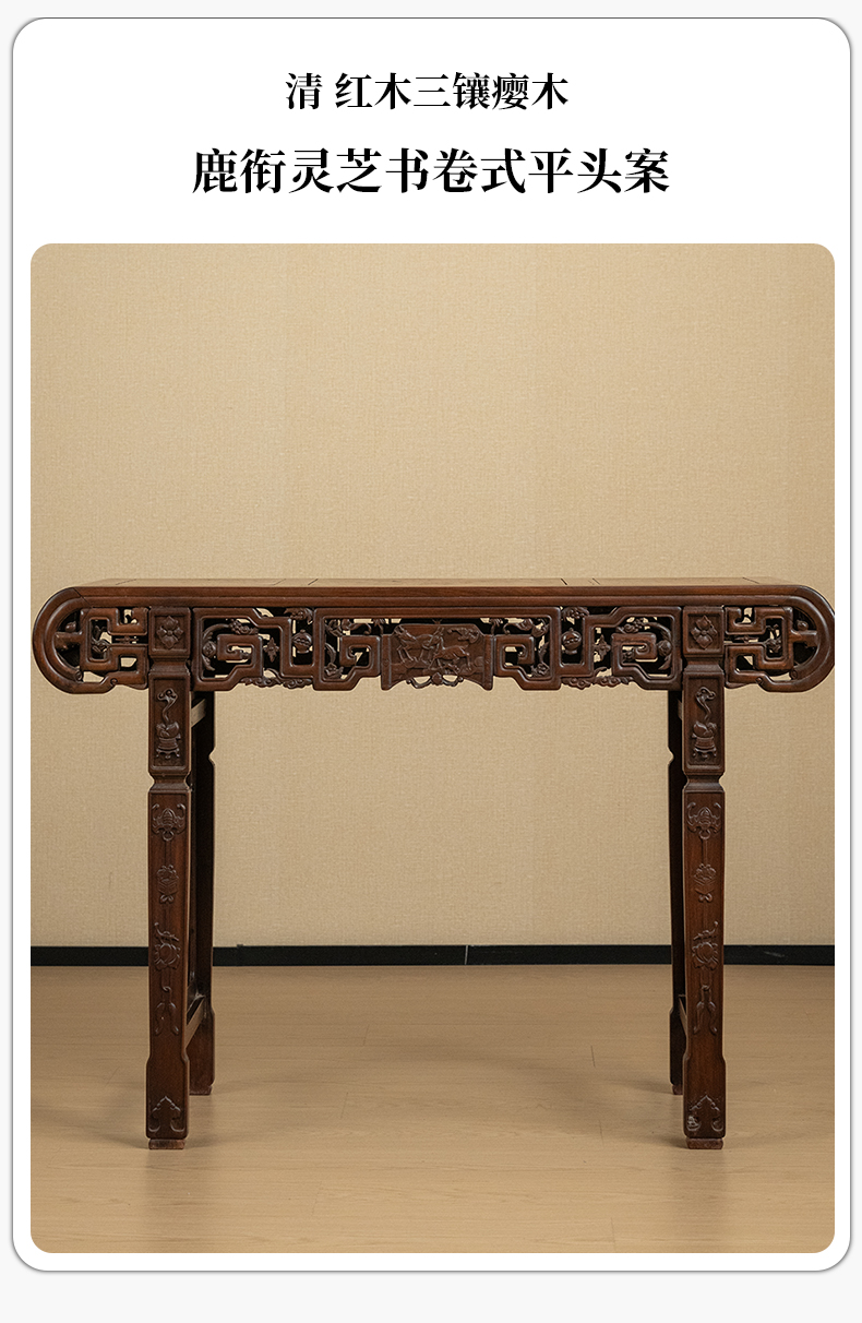 清 红木三镶瘿木鹿衔灵芝书卷式平头案