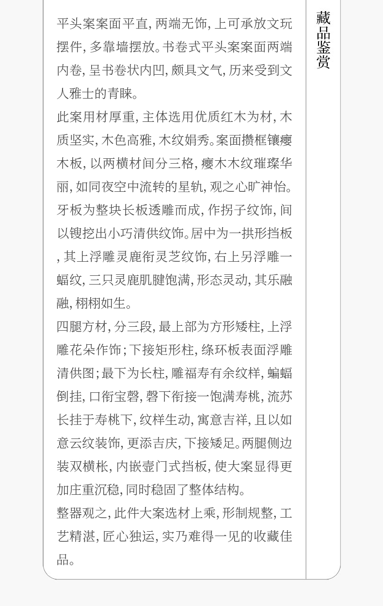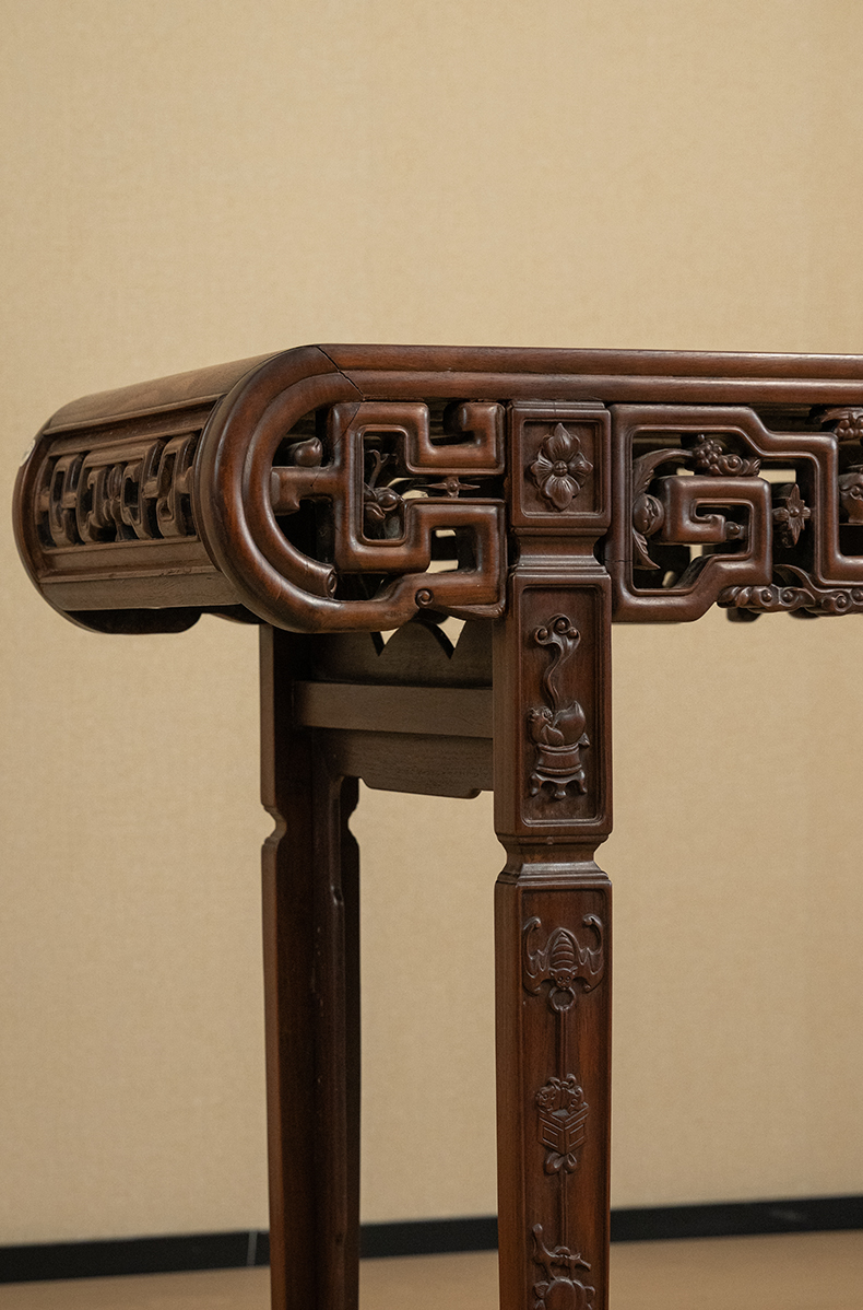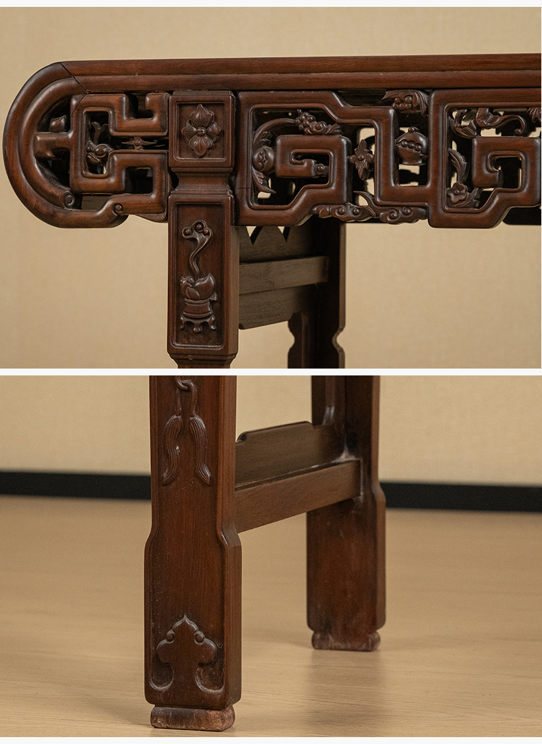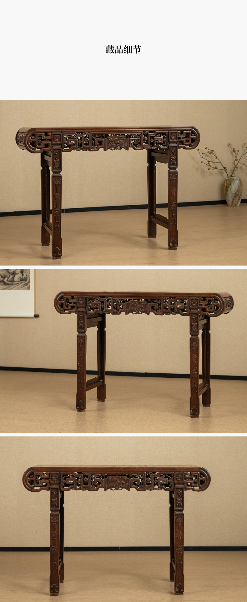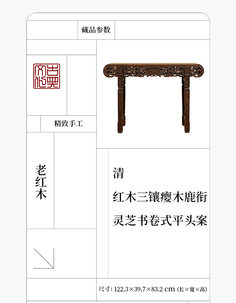 清 红木三镶瘿木鹿衔灵芝书卷式平头案
