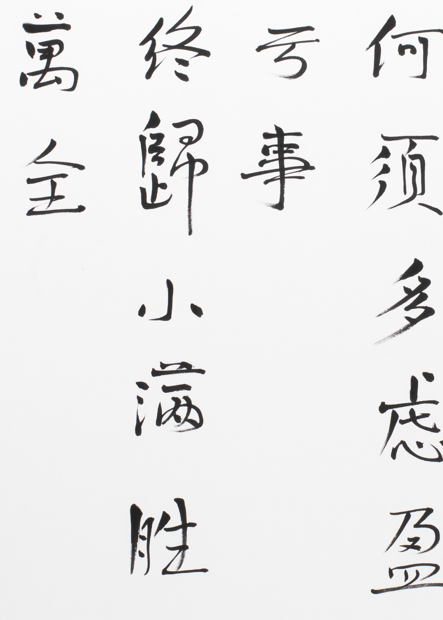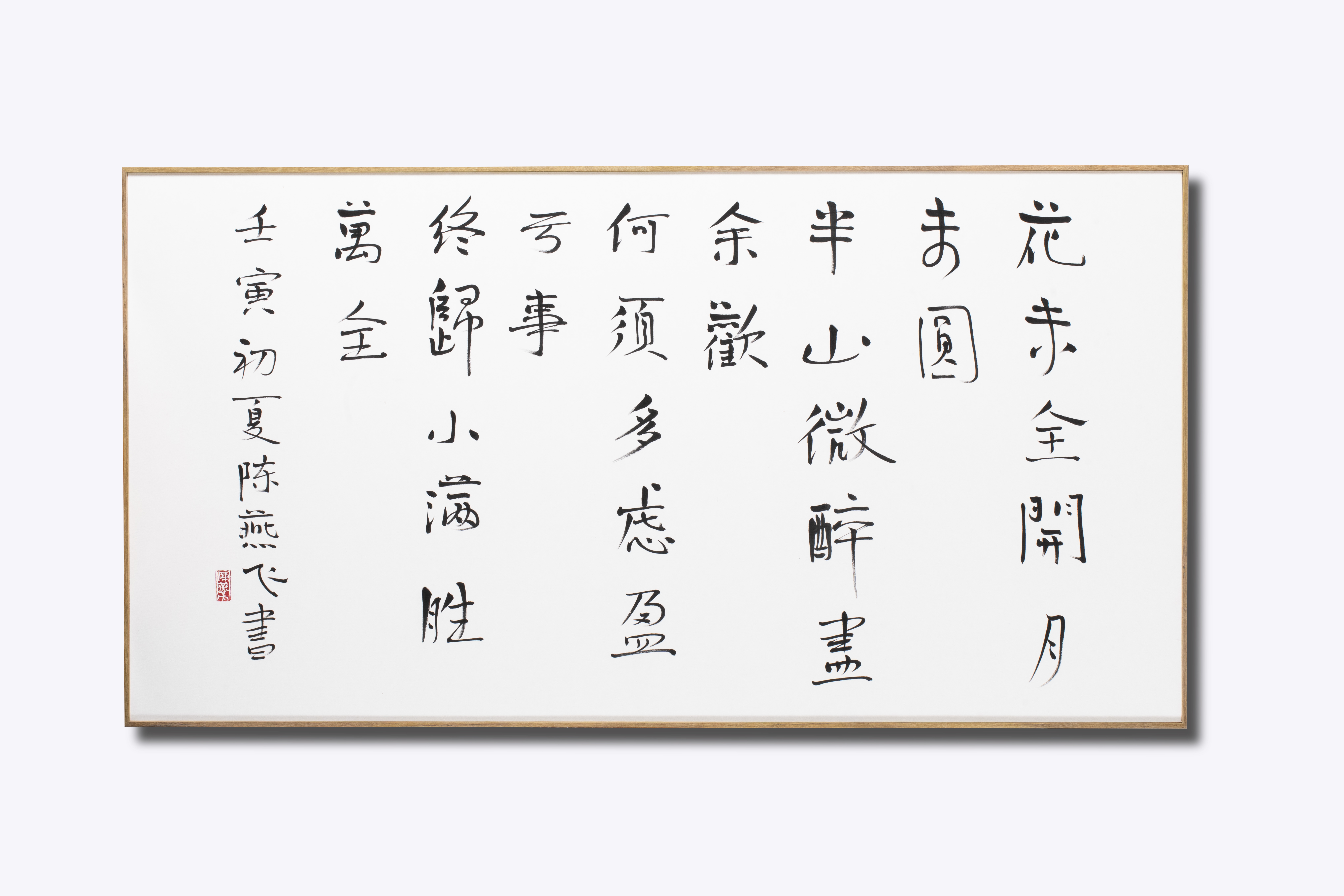 花未全开月未圆,半山微醉尽余欢。 何须多虑盈亏事,终究小满胜万全。我们说人生 最好的状态莫过于小满,不是一点点满足,而是 在微小的事情中也能够满足,这就很考验我们心 性的功夫。字体清秀内敛,用笔简淡,轻灵秀逸。