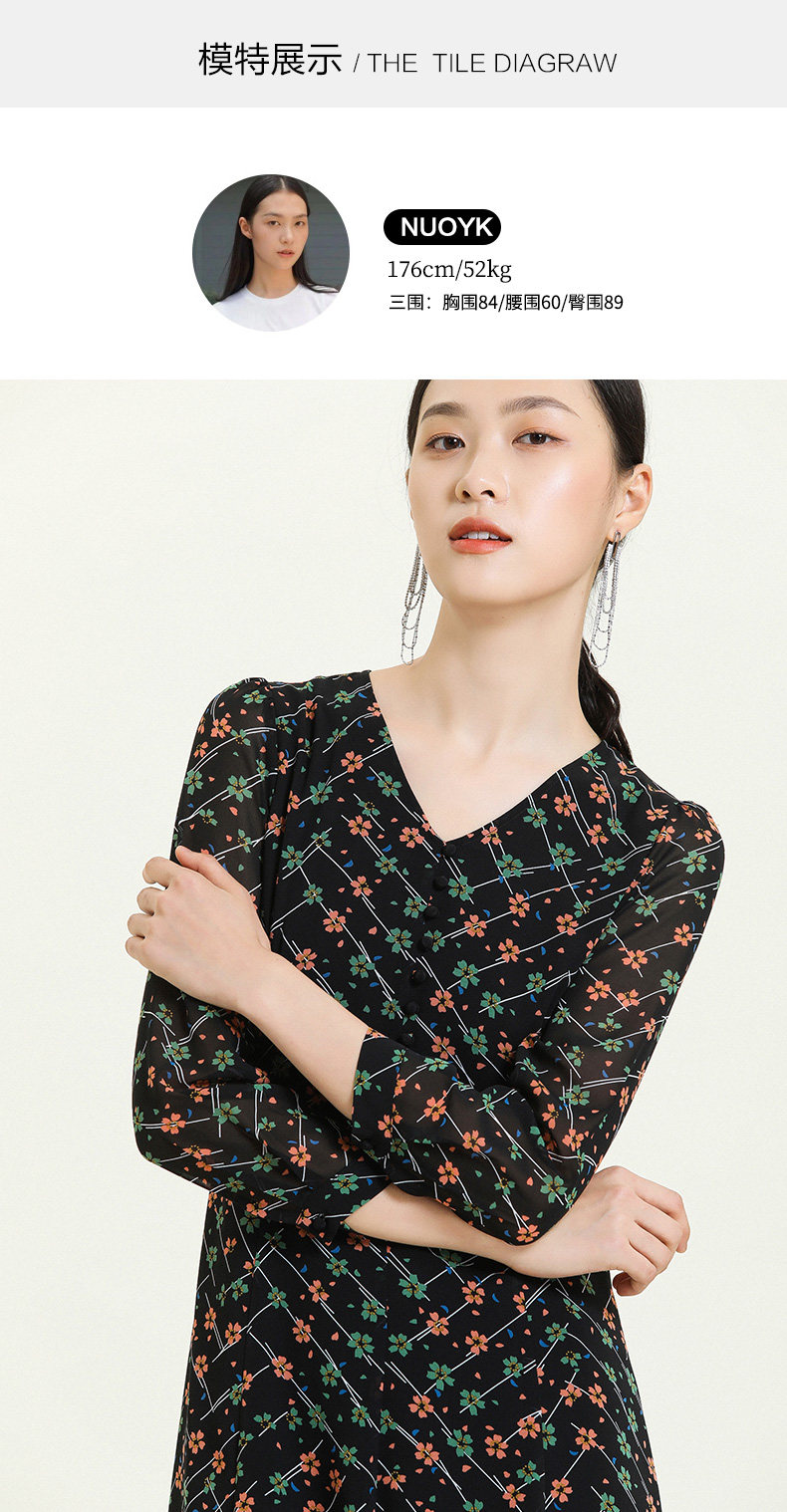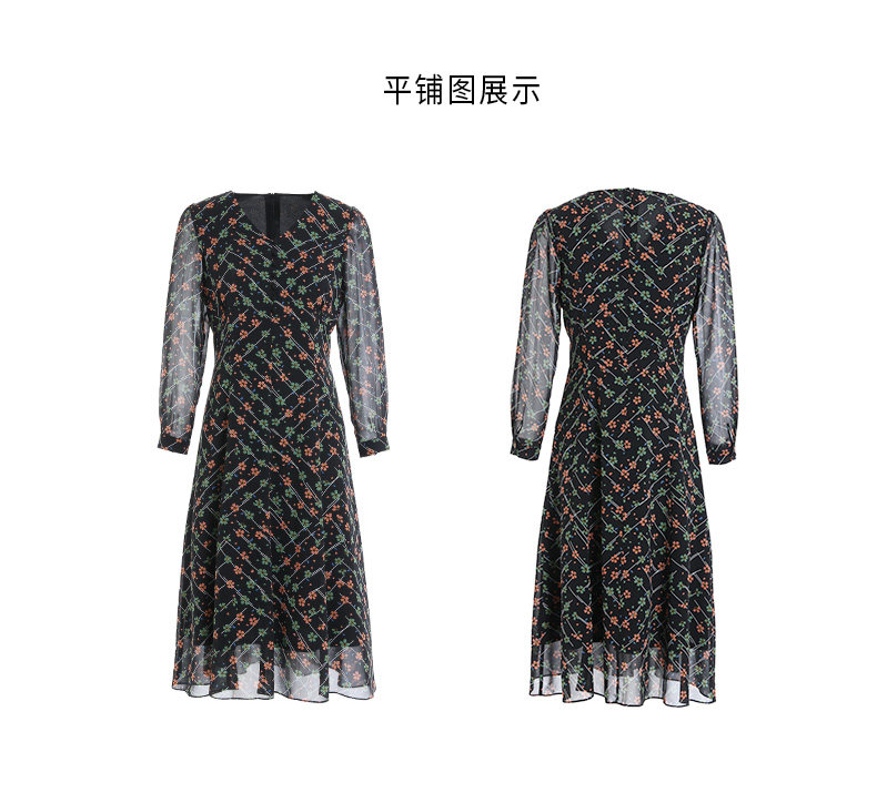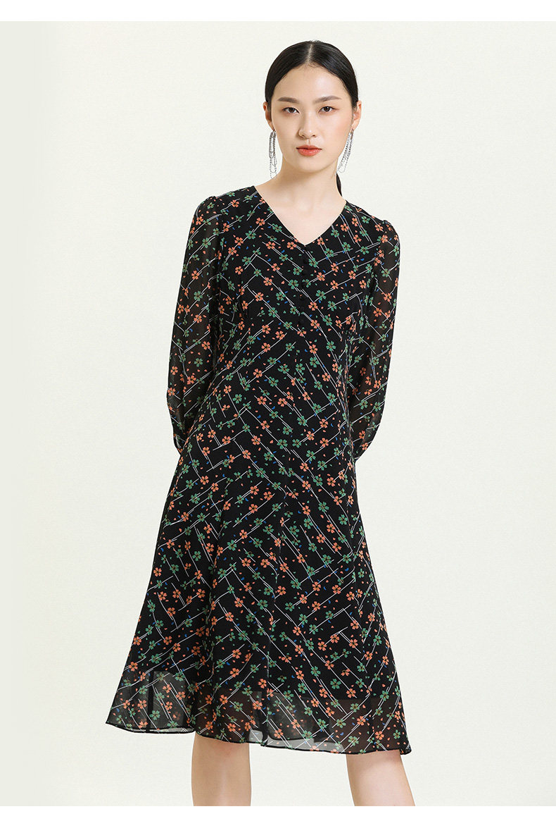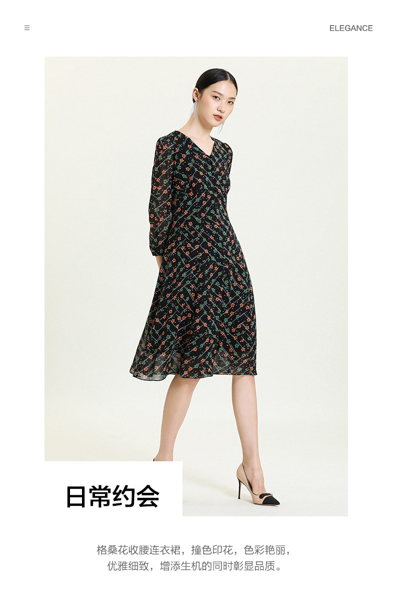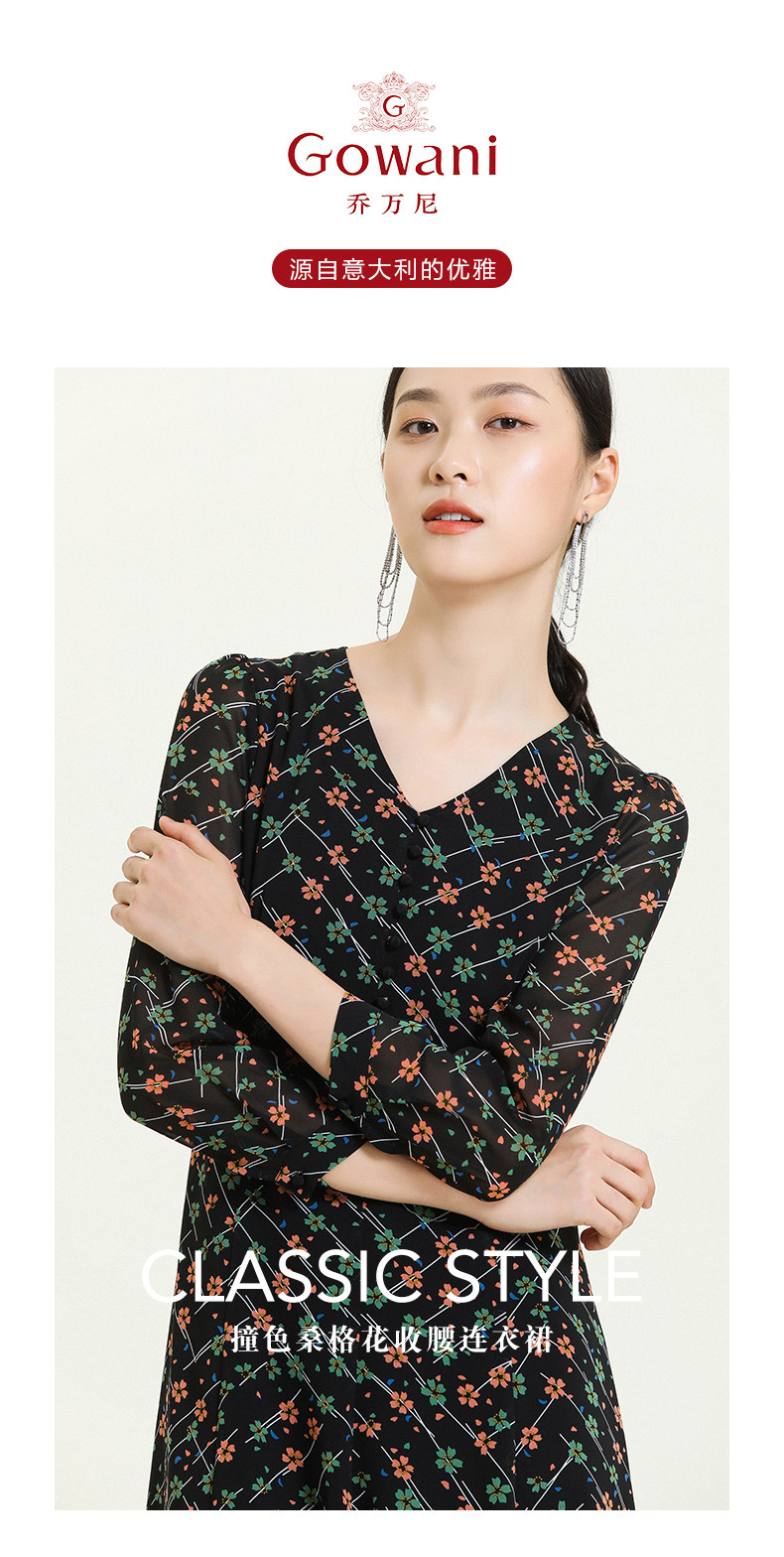 乔万尼新款秋V领显瘦长袖收腰洋气中长设计感气质连衣裙ES3E585