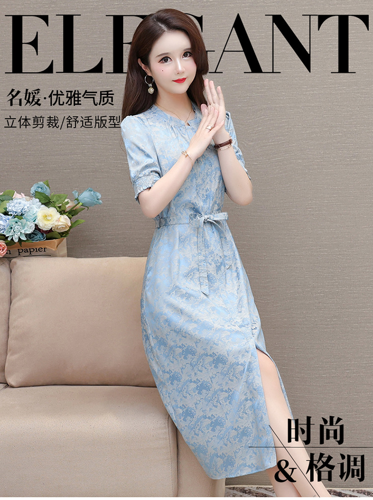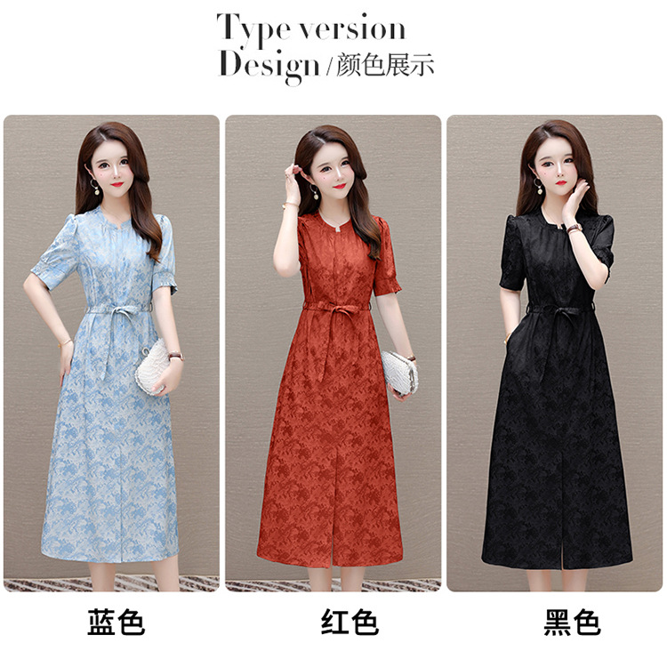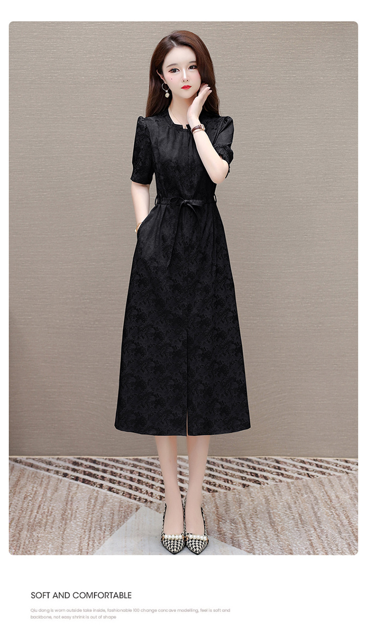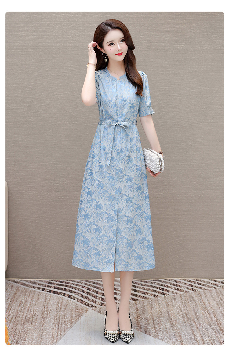 印花系带收腰显瘦,圆领短袖通勤气质A字裙QYM-XQD-7B2430-L