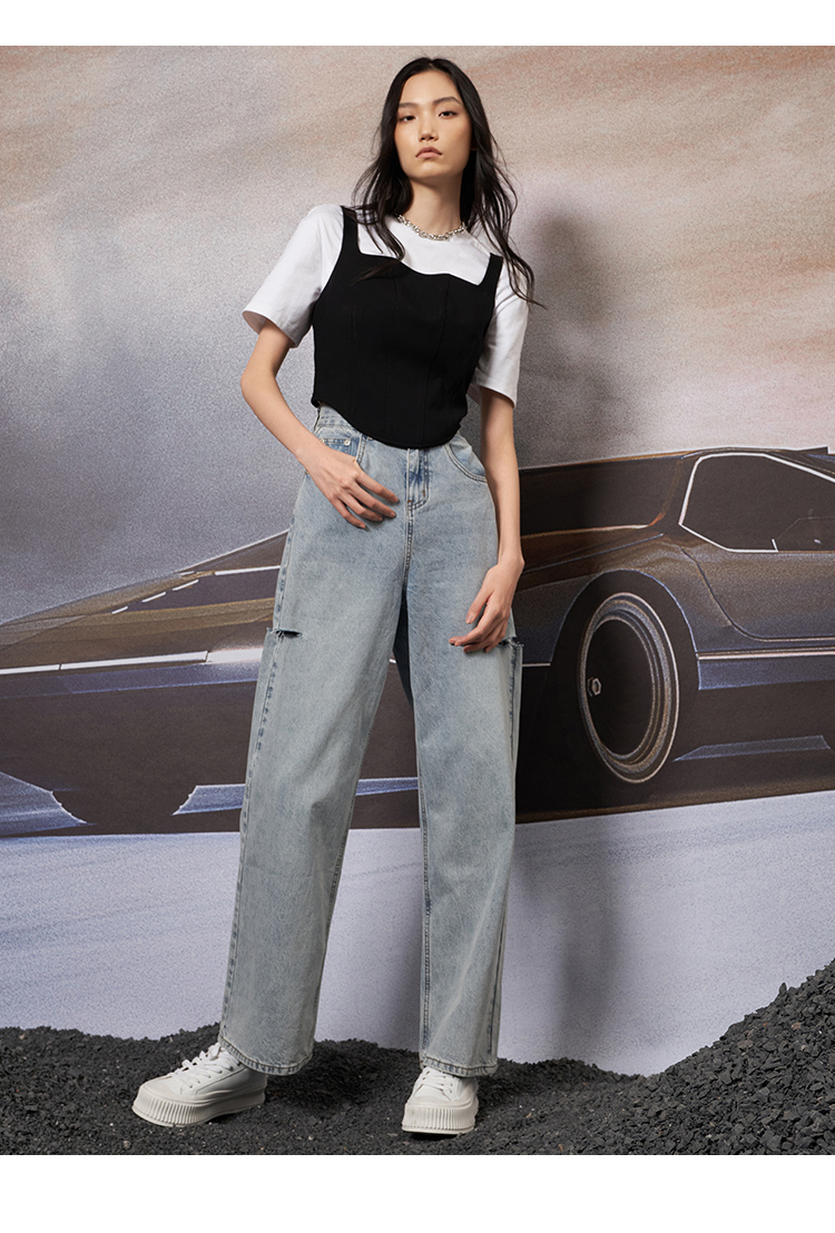 EITIE爱特爱春新款高腰黑色通勤显瘦干练百搭直筒长裤休闲裤A2305103