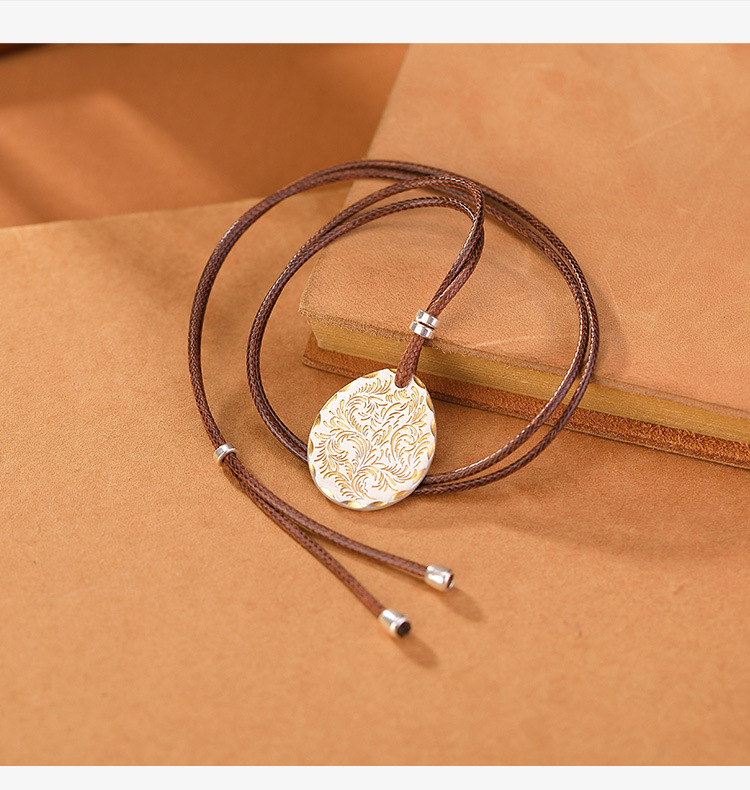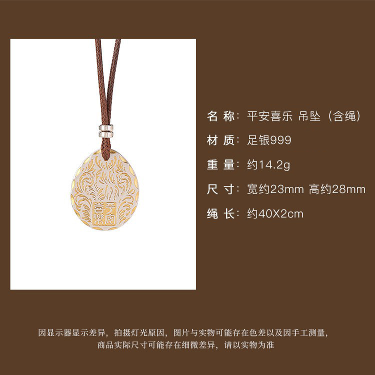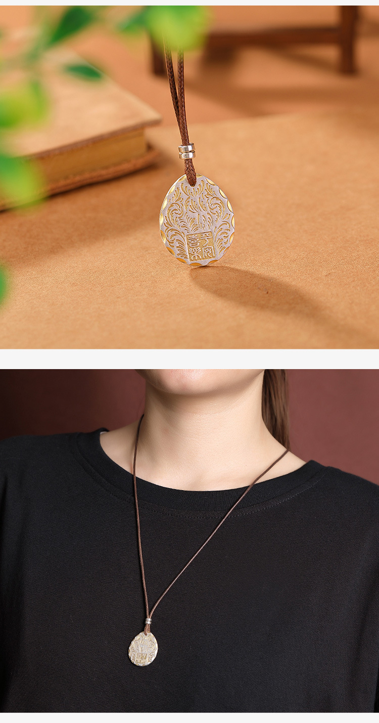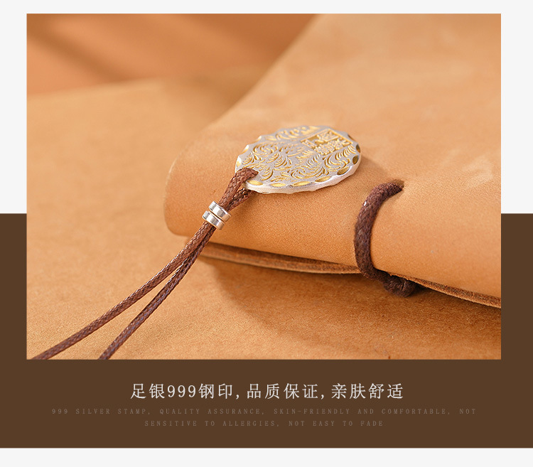 S999足银镀金复古描金平安喜乐唐草纹无事牌带绳吊坠CW