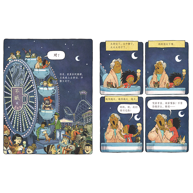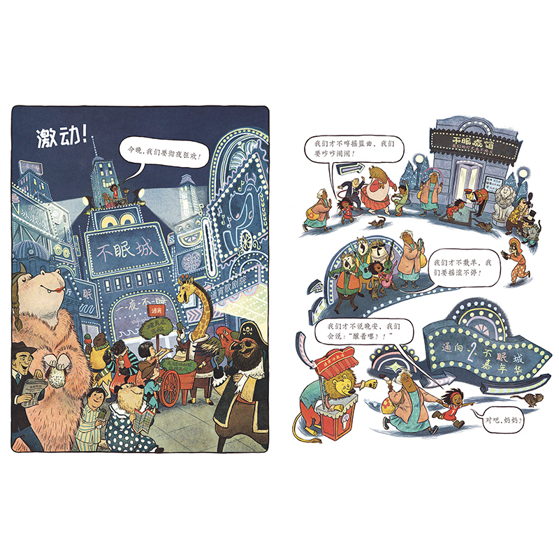 2020年凯迪克银奖得主的插画给这个热闹、欢腾的故事更增添了一份奇妙和想象,孩子们一下就会被不眠城里的世界吸引,但同时也会跟着不停地打哈欠,直到睡意十足……