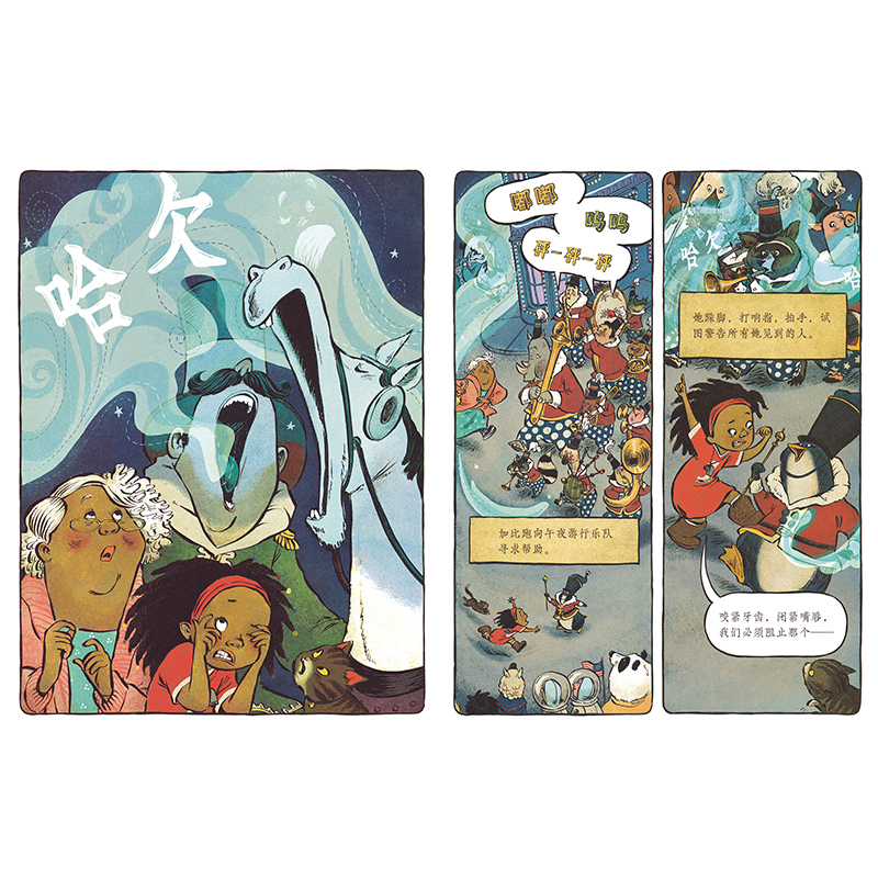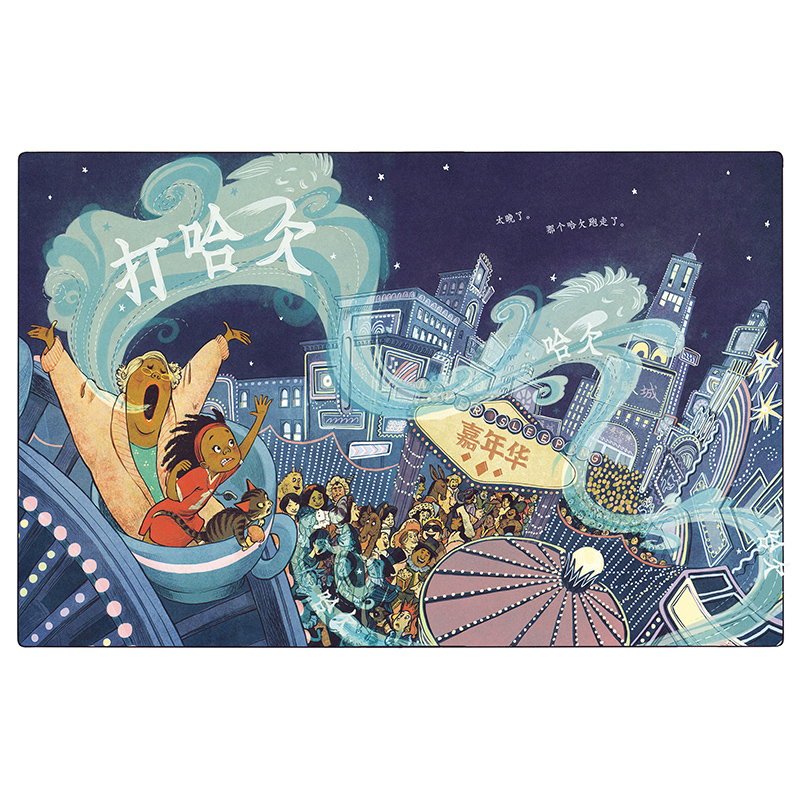 每个人都知道打哈欠会传染——在睡前时间没什么,但在不眠城的梦幻世界里就不得了了。当奶奶不小心打了个哈欠,就轮到加比试图唤醒他们周围所有突然昏昏欲睡的狂欢者了……一个精力充沛、喜欢冒险的小女孩开始了她的超现实夜间冒险。——《号角书杂志》