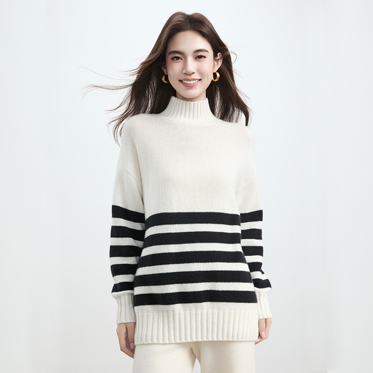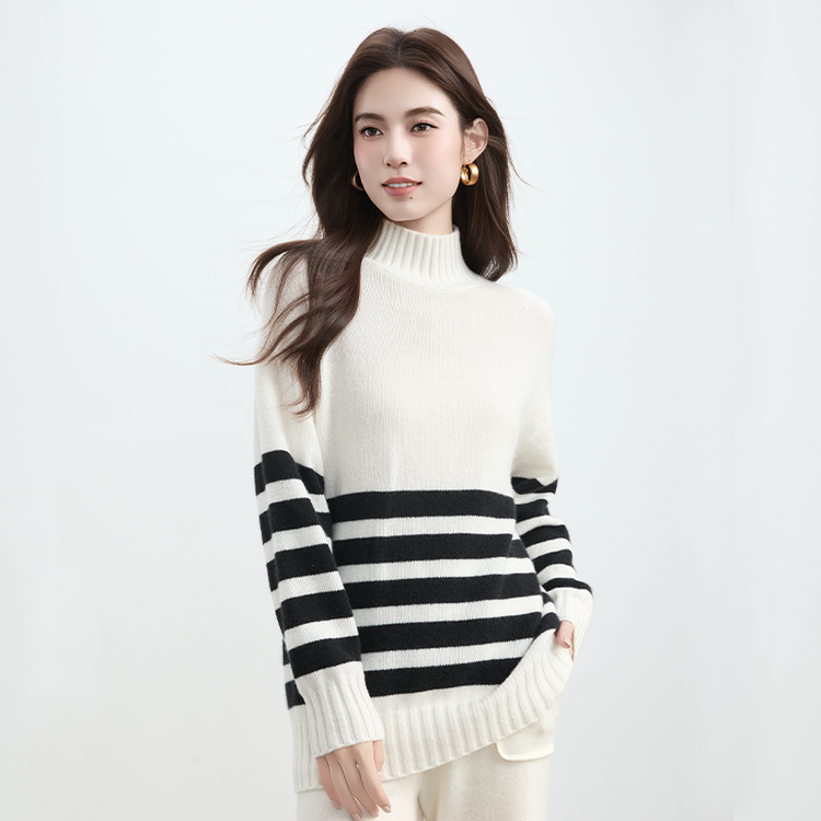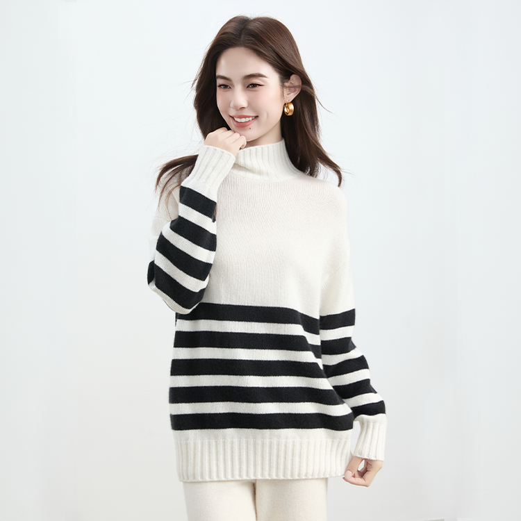 VogoPetite100%山羊绒半高领条纹宽松套头衫上衣 BP141F1701