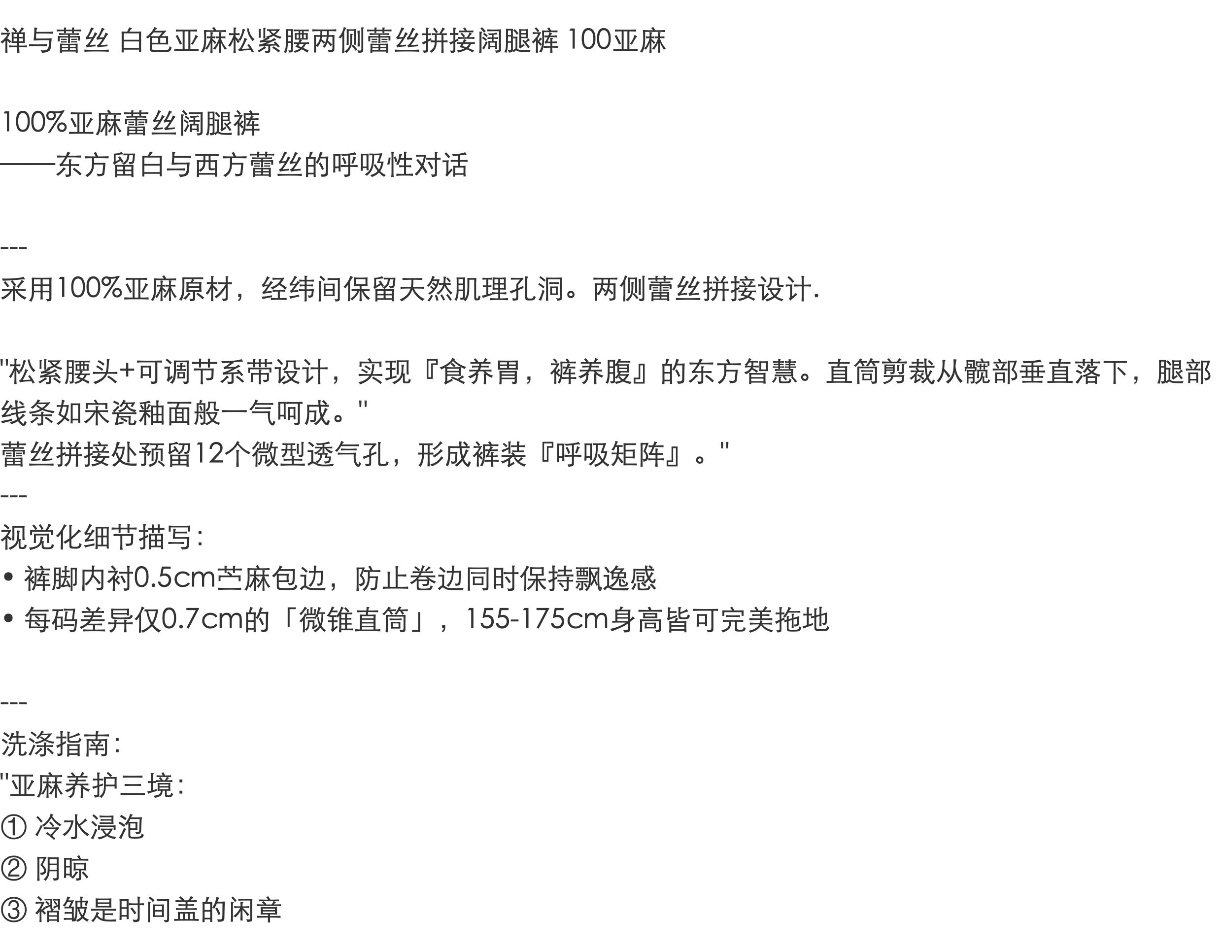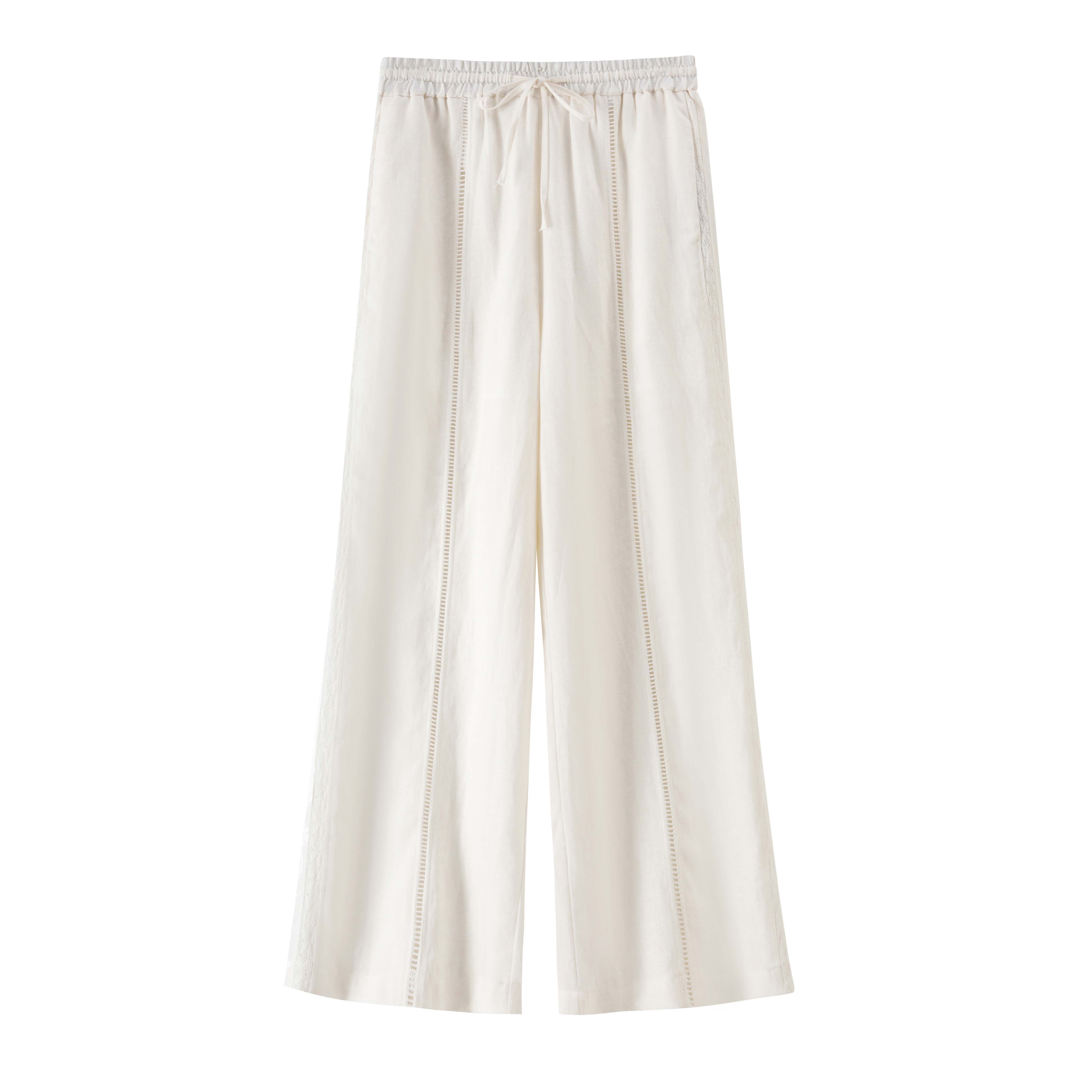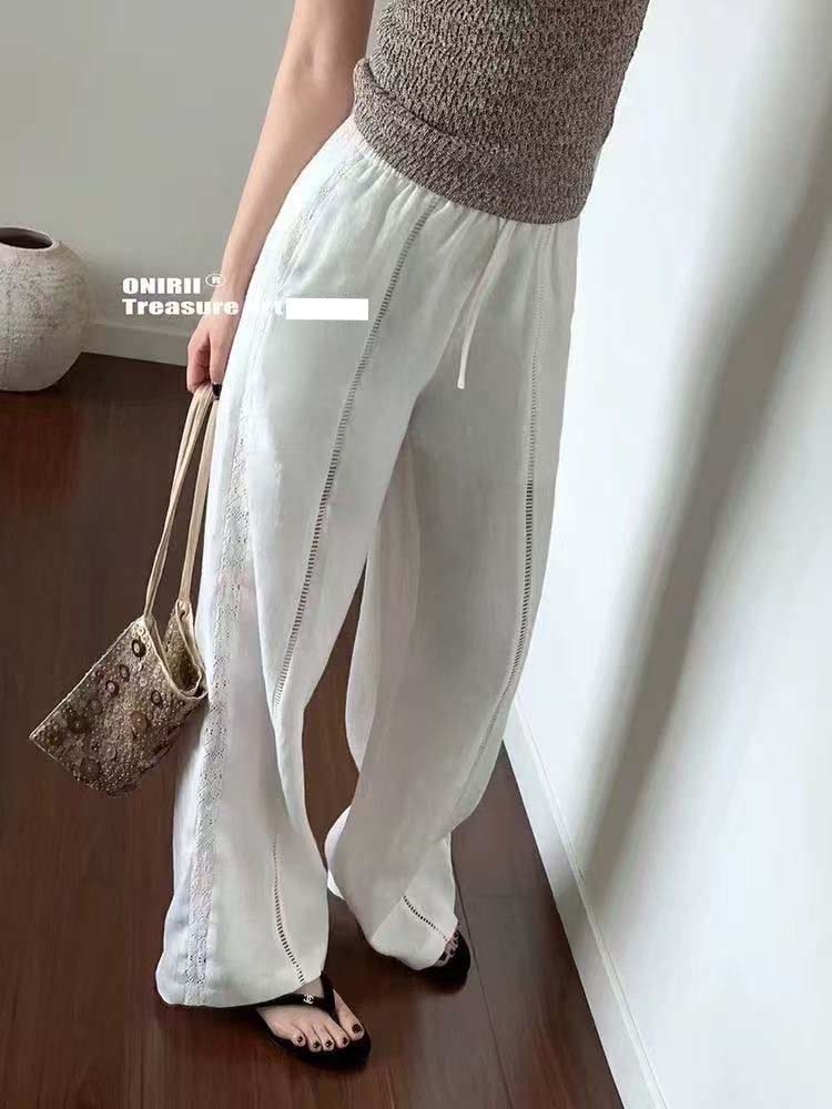「K」洛诗琳35655夏季新款亚麻松紧腰蕾丝拼接休闲阔腿裤10369