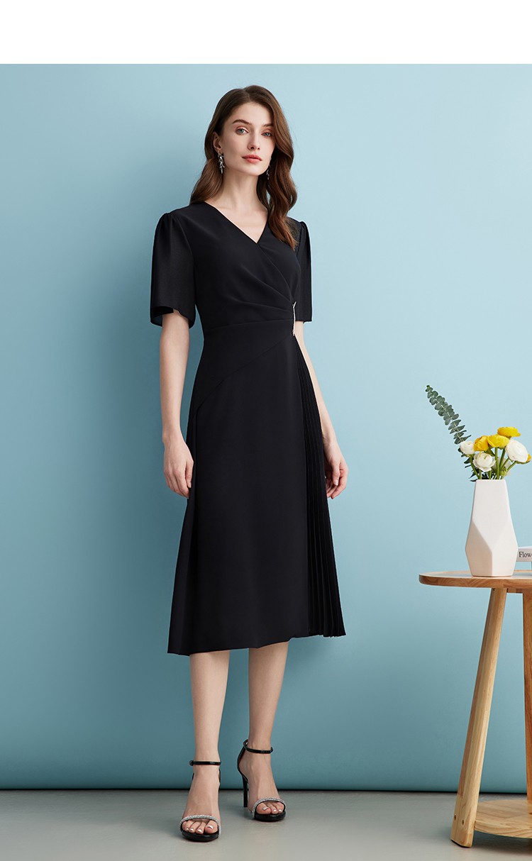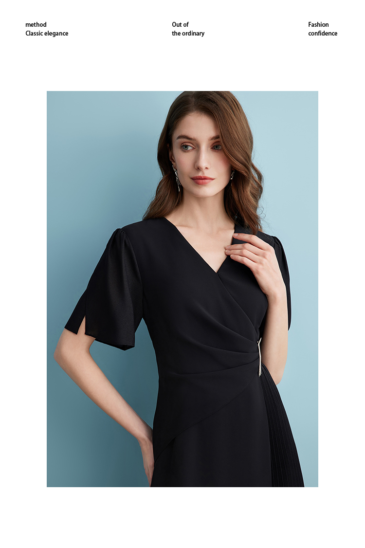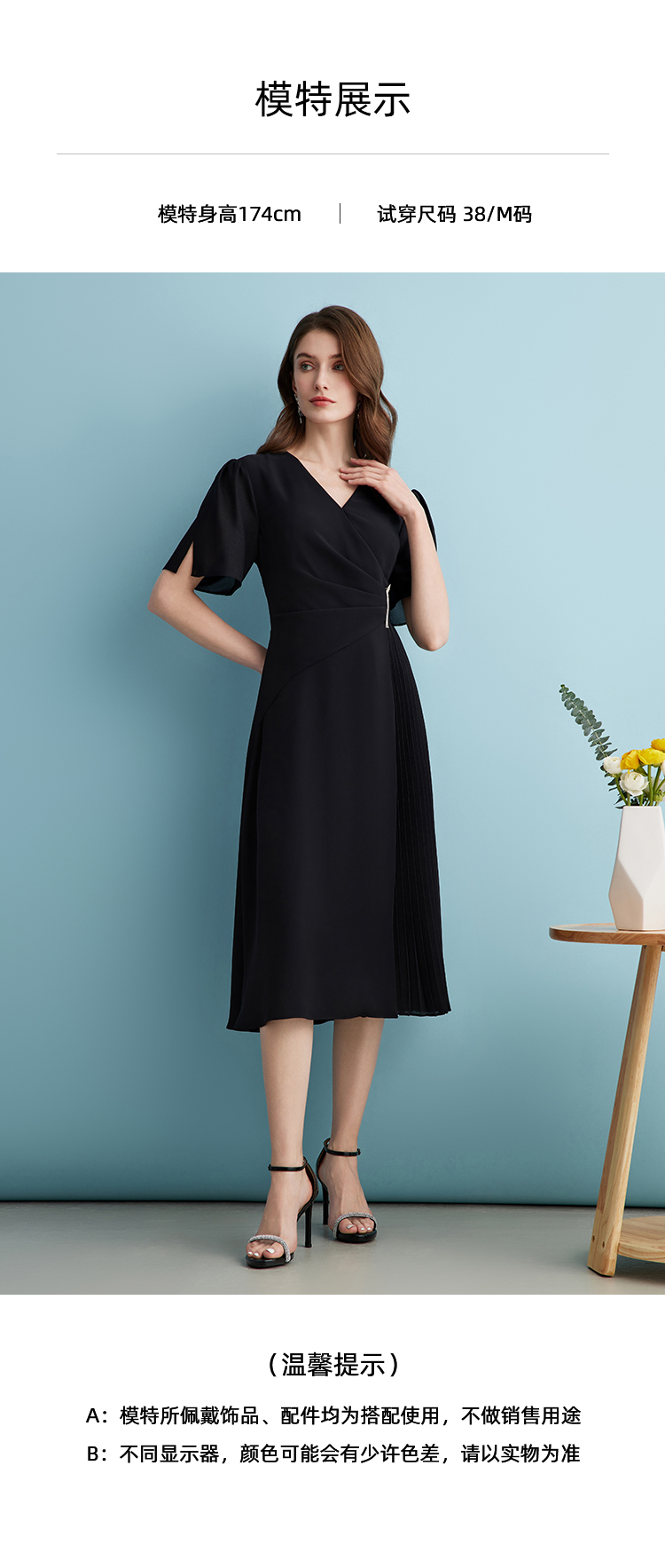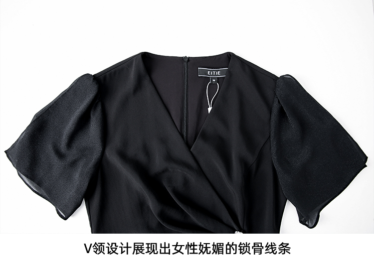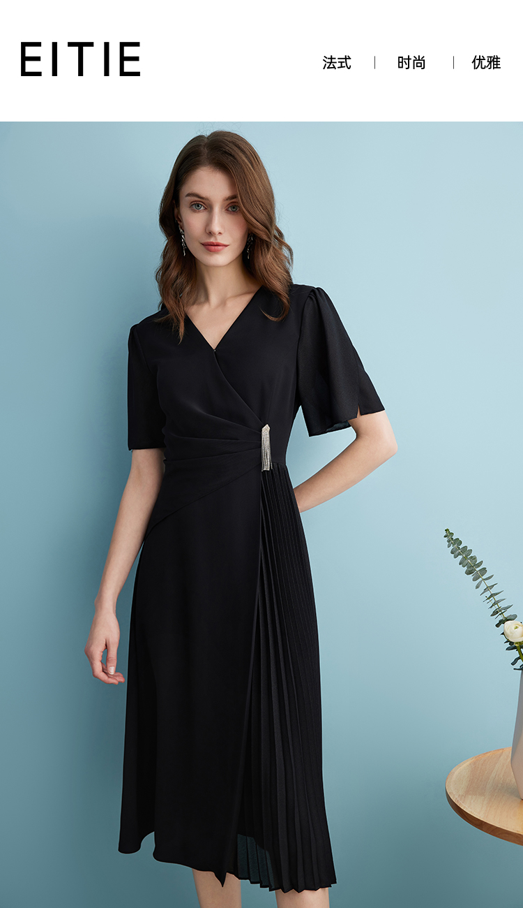 EITIE爱特爱气质优雅流苏腰饰压褶V领通勤黑色连衣裙夏季新款B2407340