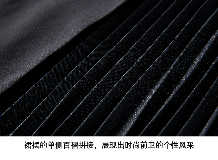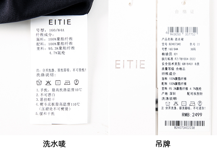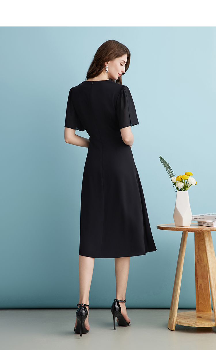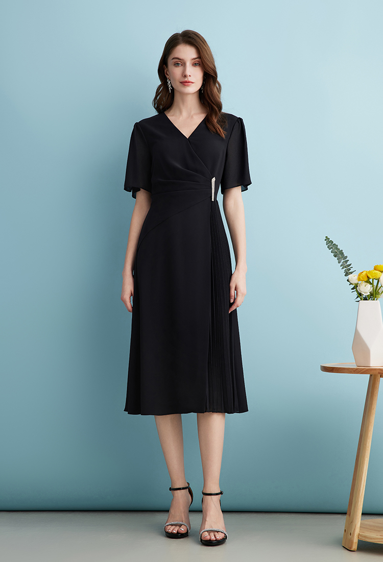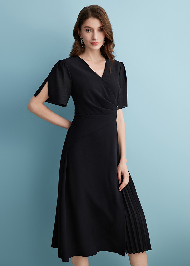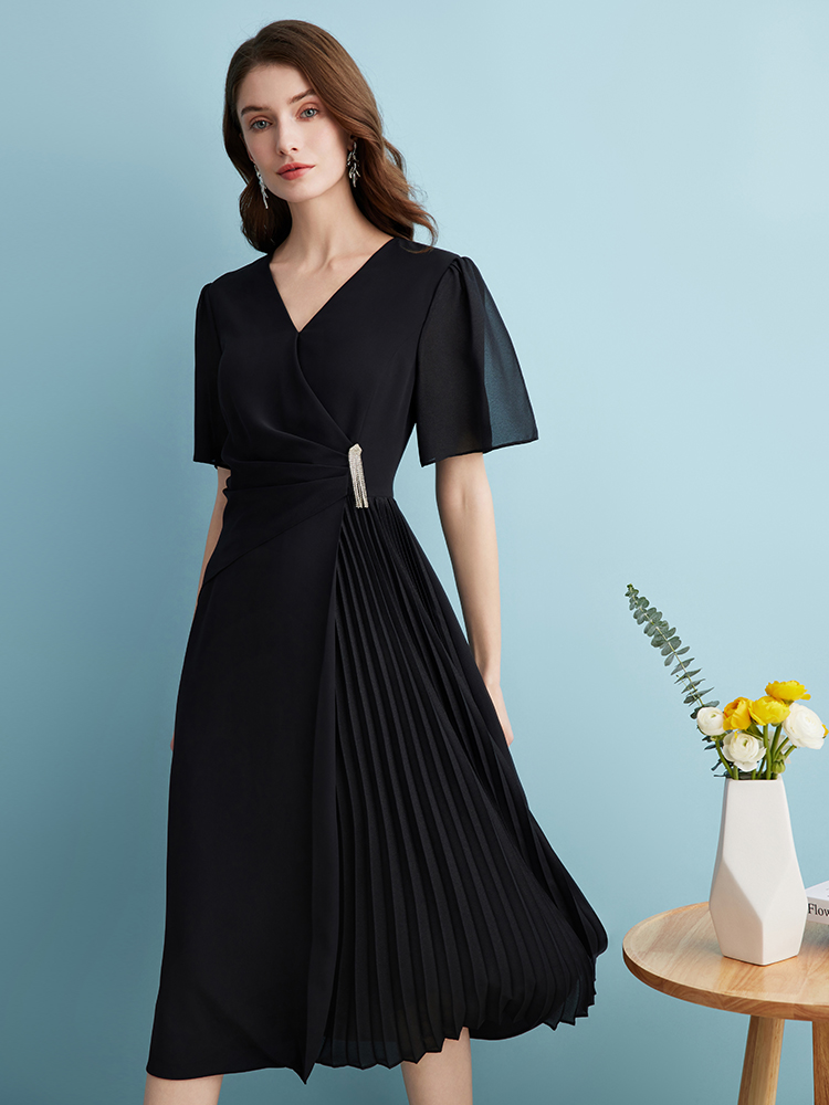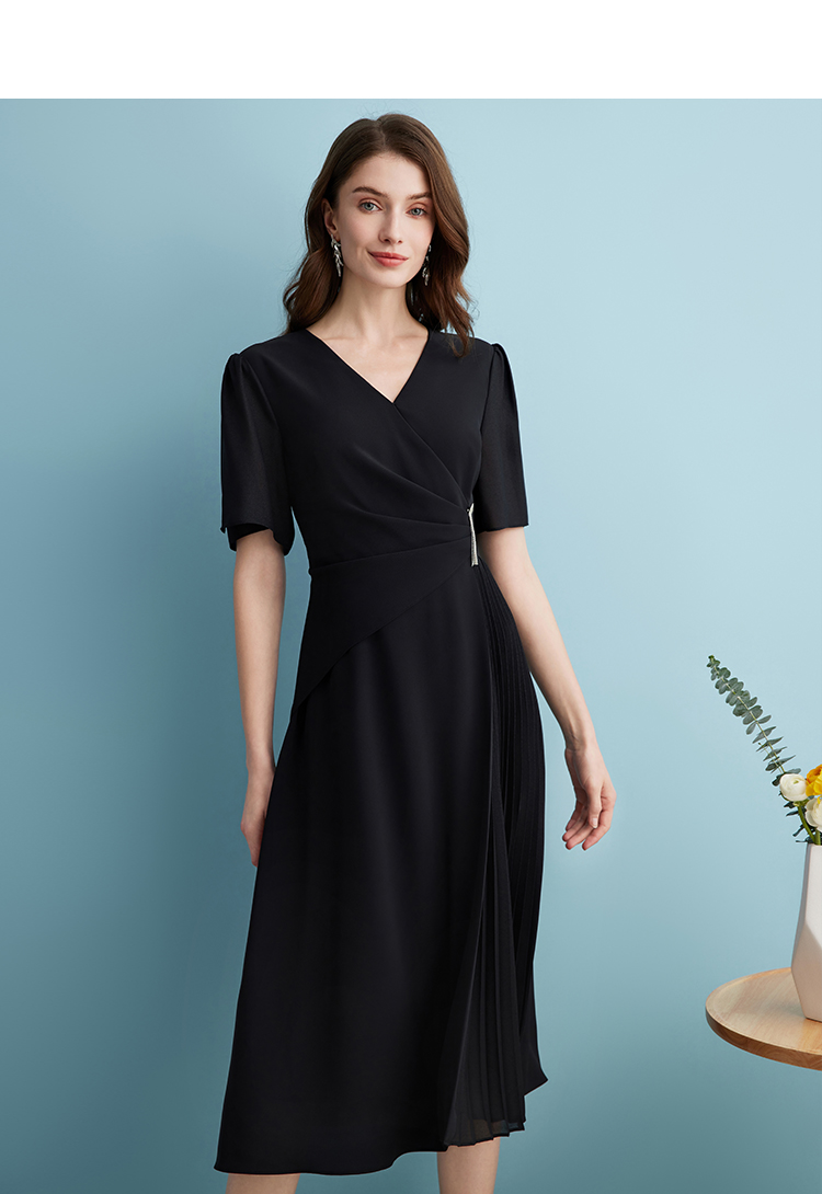 EITIE爱特爱气质优雅流苏腰饰压褶V领通勤黑色连衣裙夏季新款B2407340