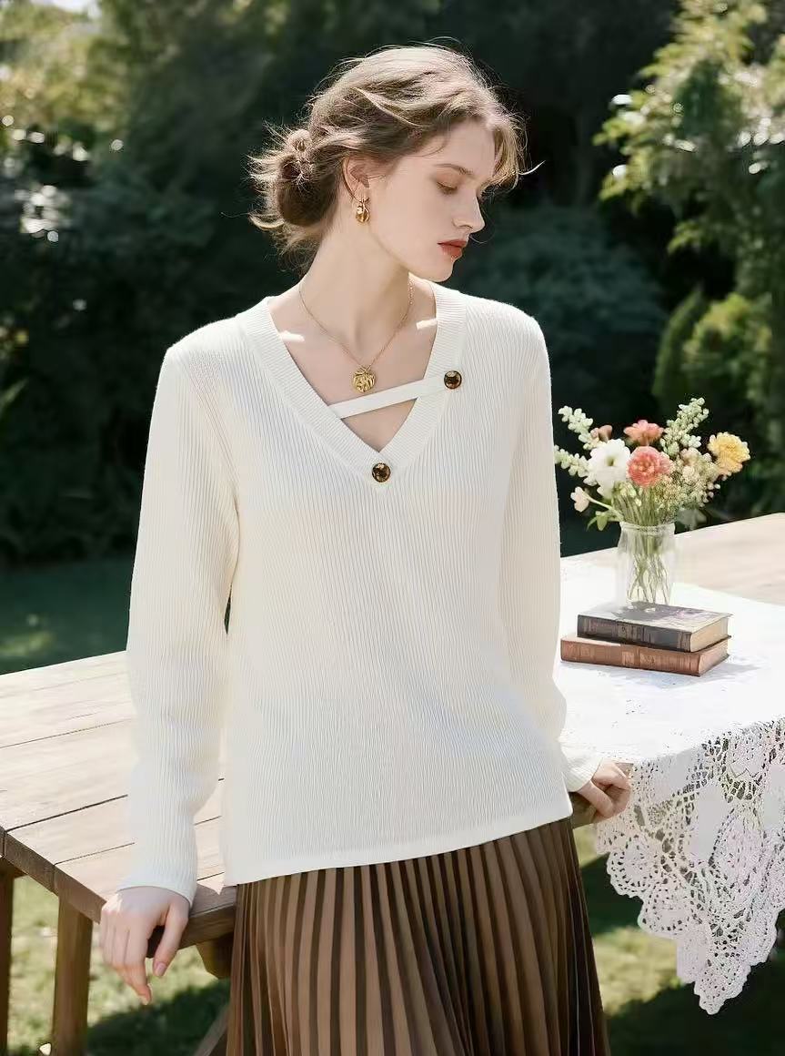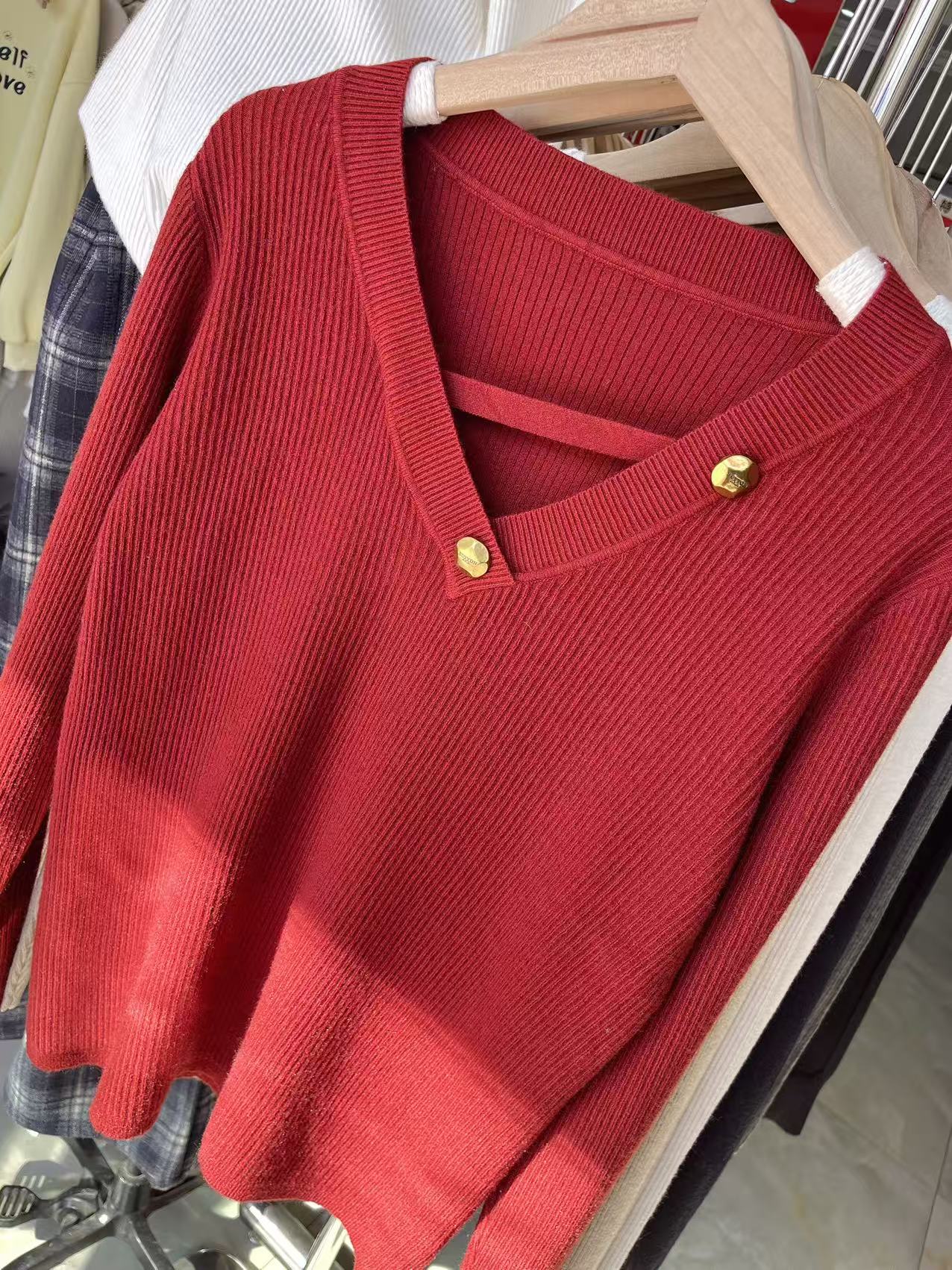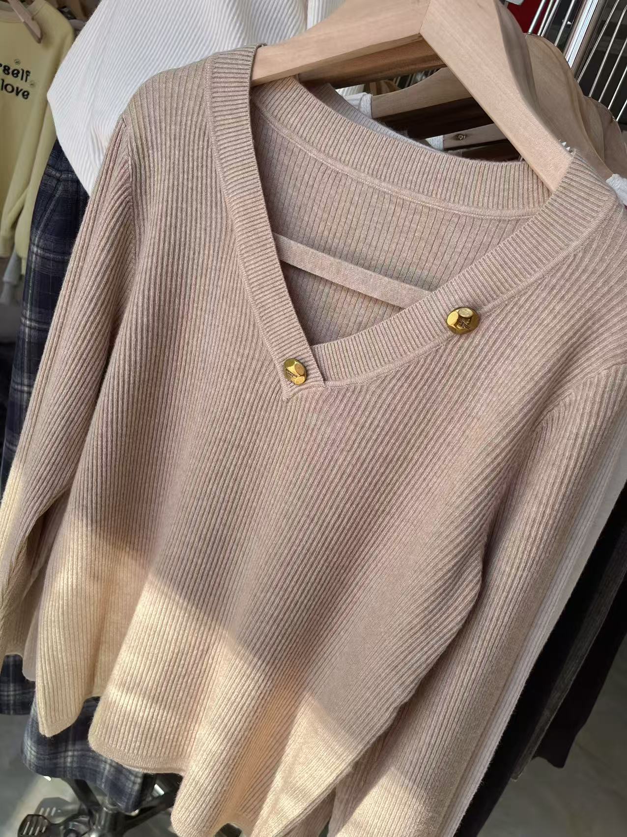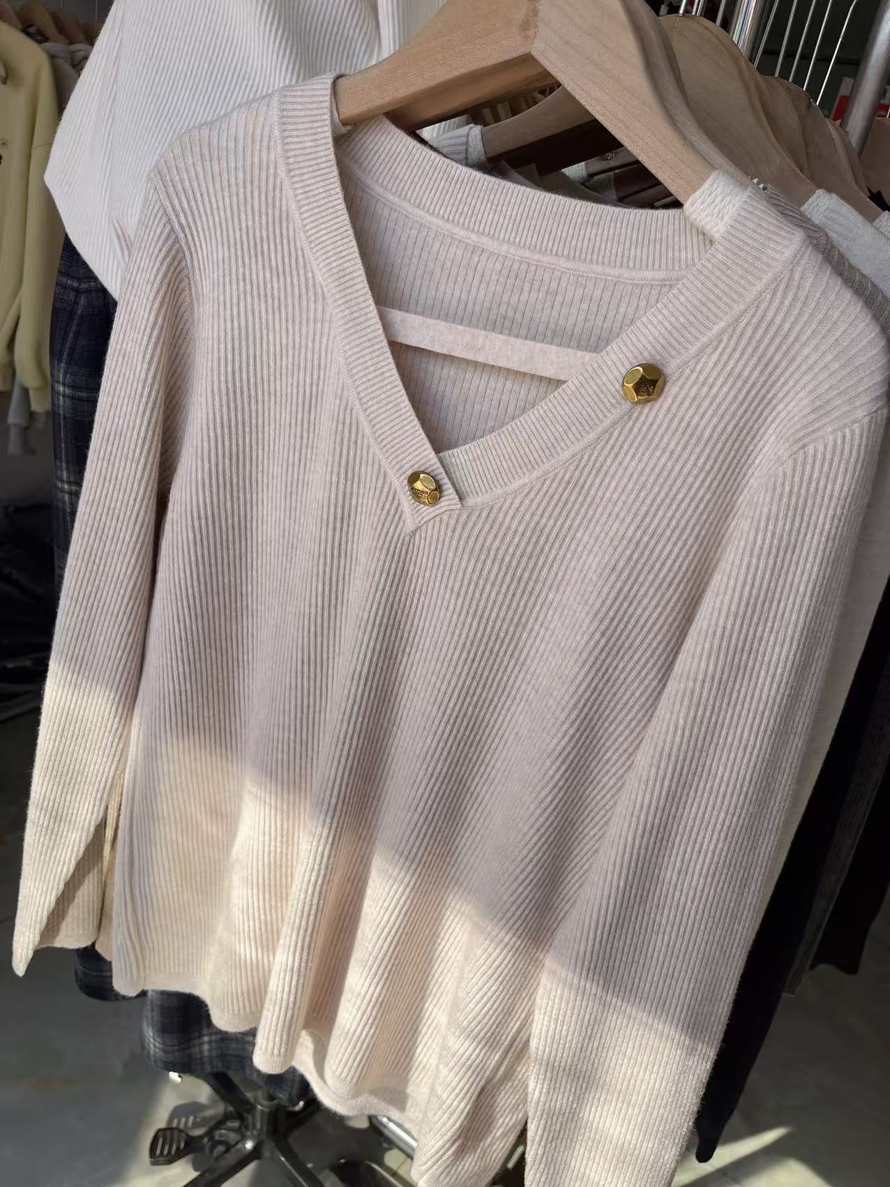 女王节抢购价-不支持退【极简毛衣】V领金扣~百搭气质针织弹力毛衫-喜出