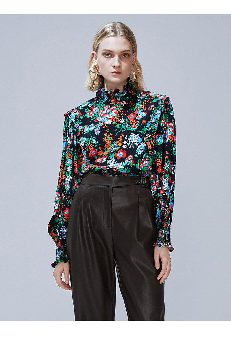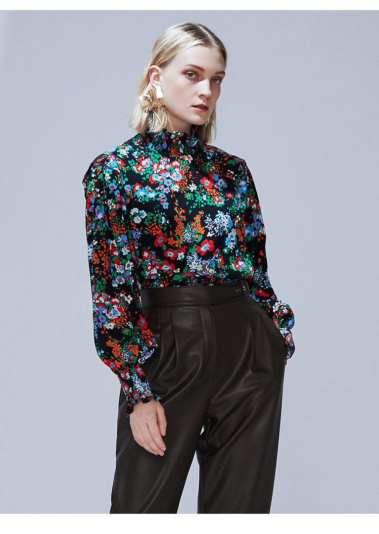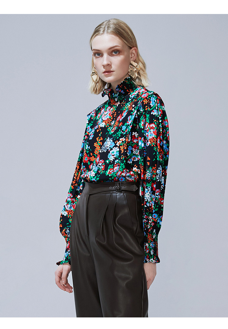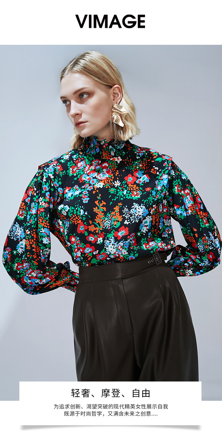 VIMAGE纬漫纪秋款个性复古高领宫廷泡泡袖印花衬衫女上衣V1413007