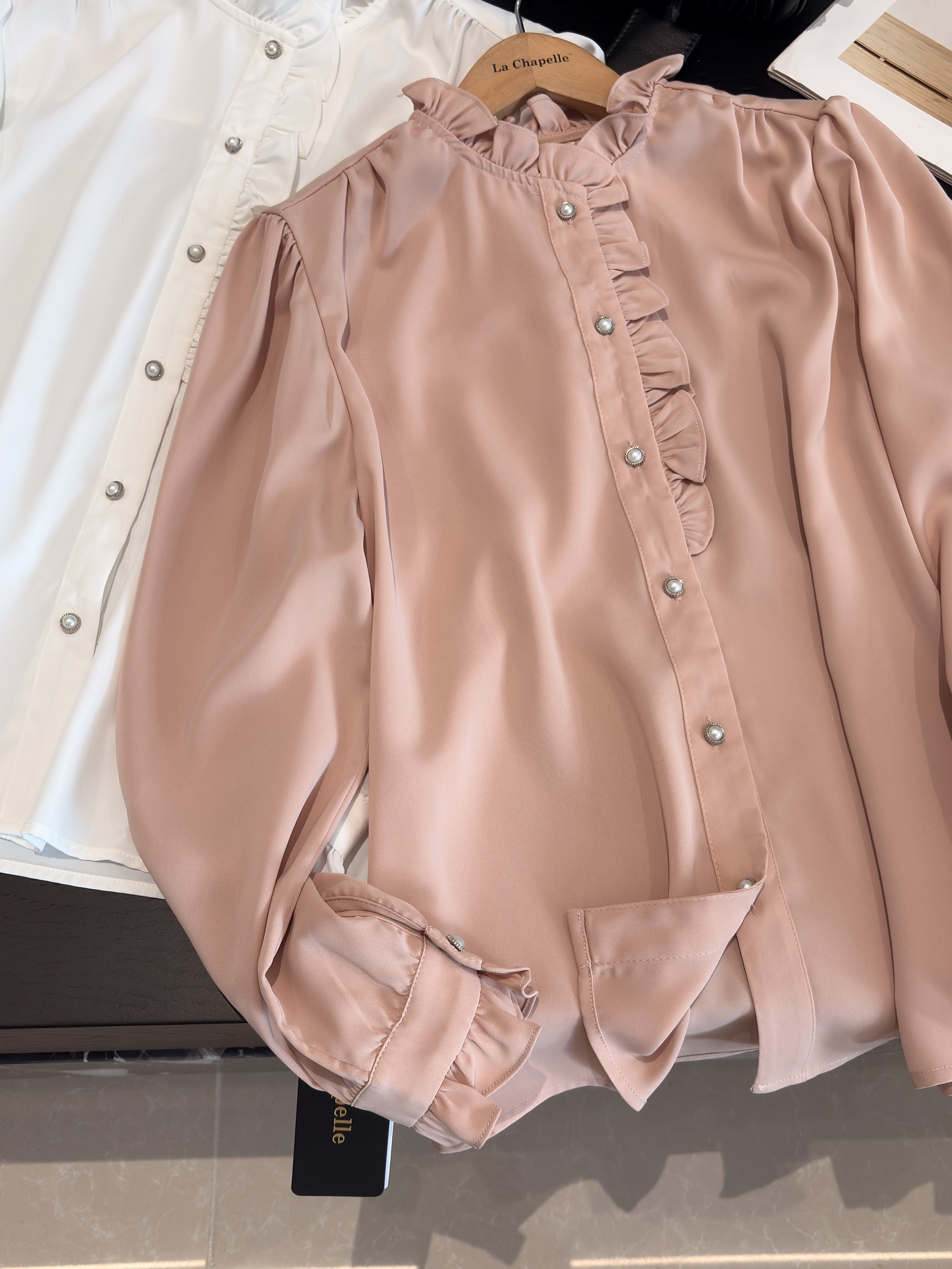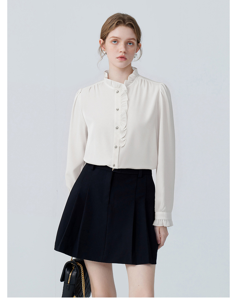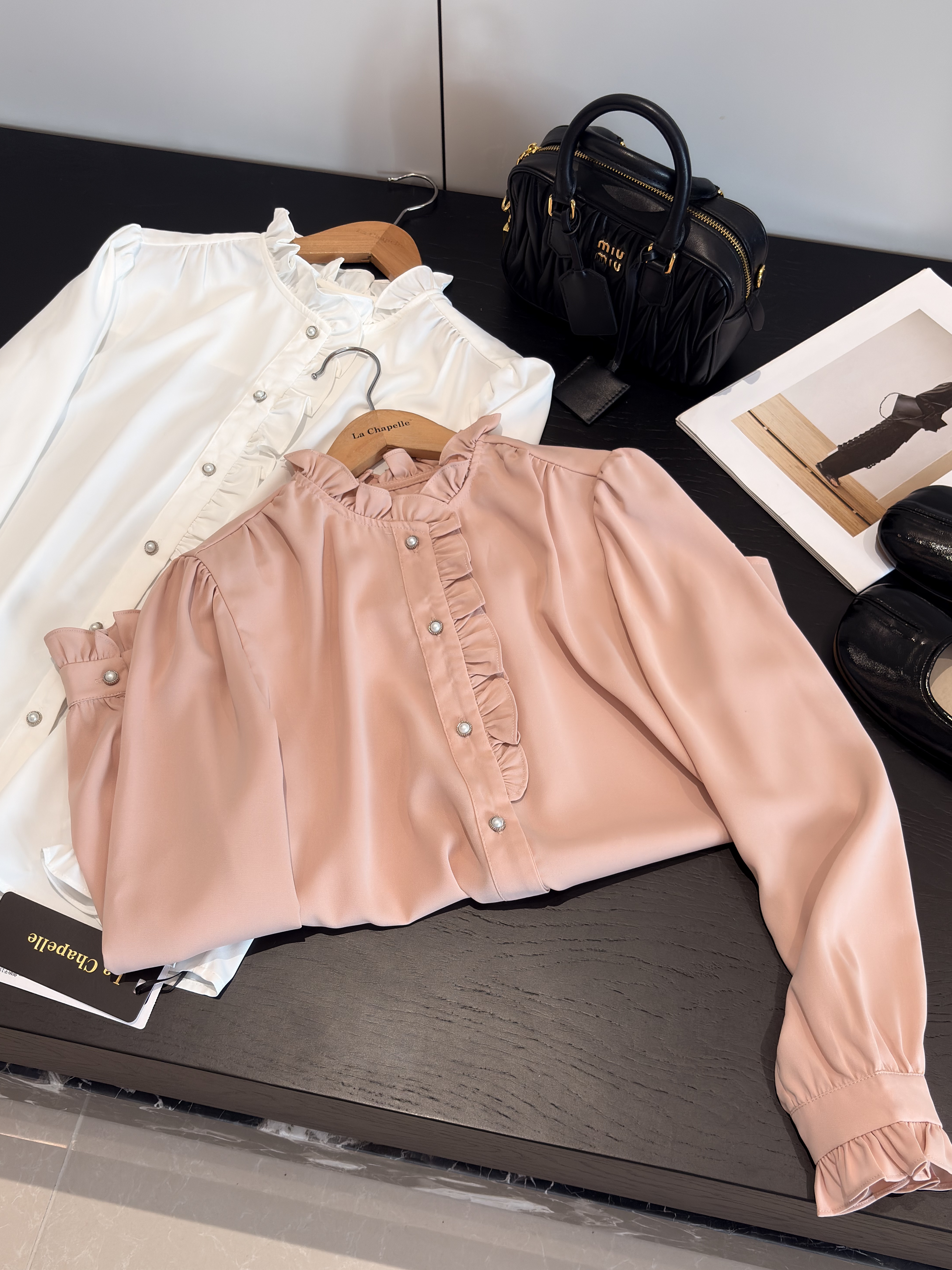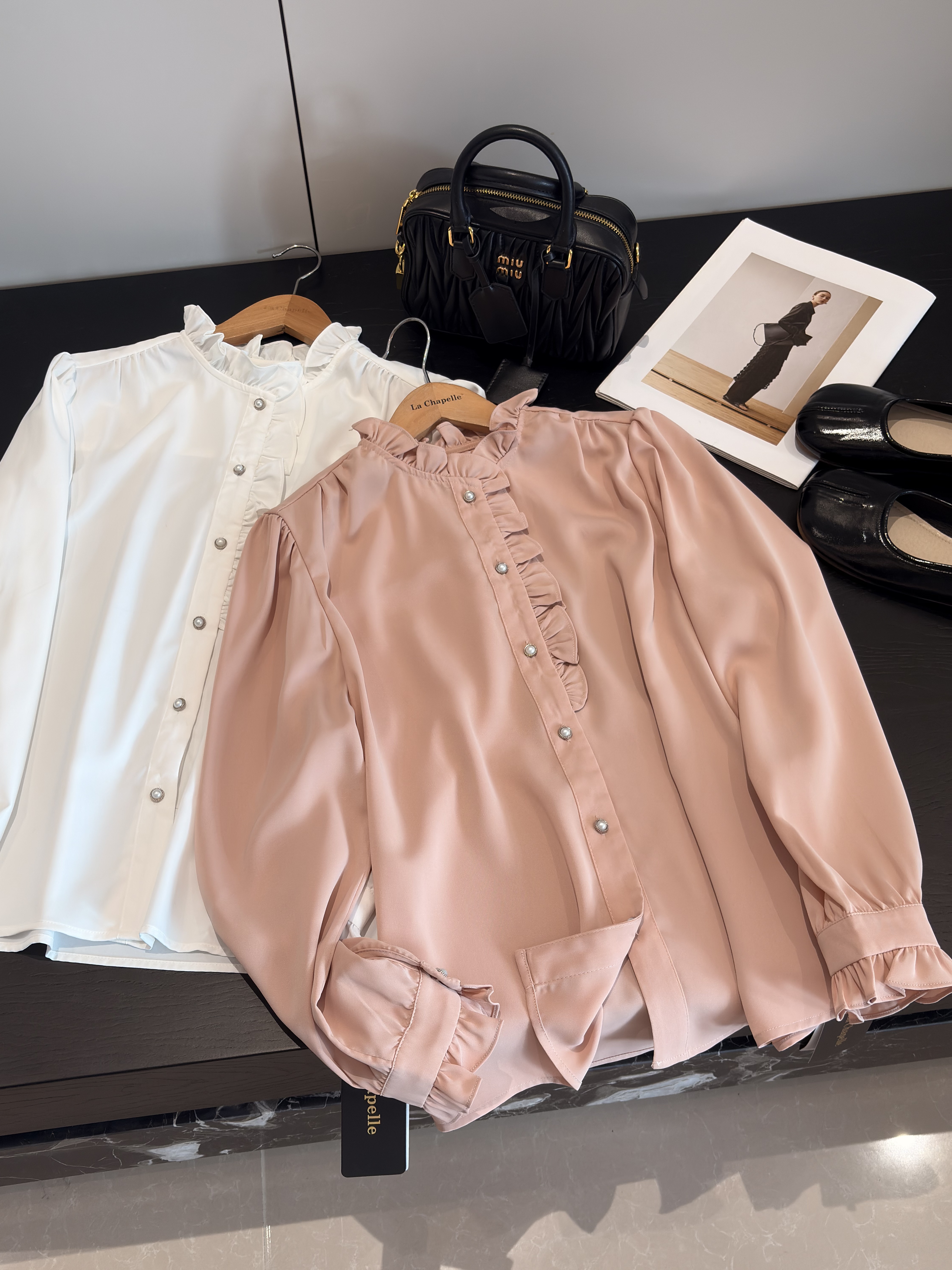 会员福利【顺滑/垂坠】拉夏贝尔/La Chapelle法式温柔甜美设计感小众木耳边门襟长袖衬衫女气质衬衣秋