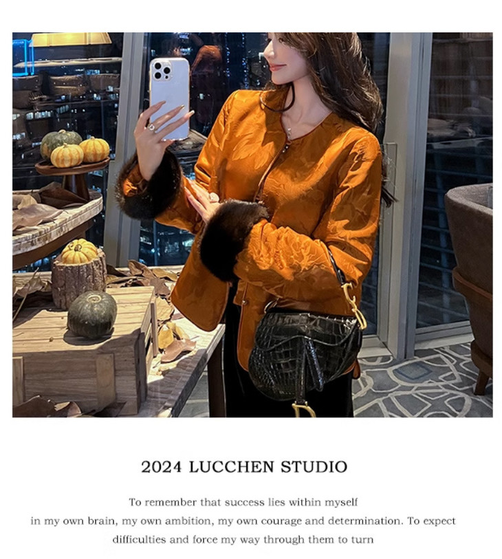 红云纱~袖口拼兔毛高级感上衣,新中式45姆米重磅桑蚕丝棉服外套F4660 商品图4