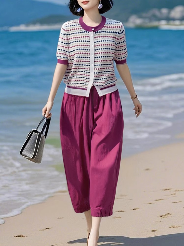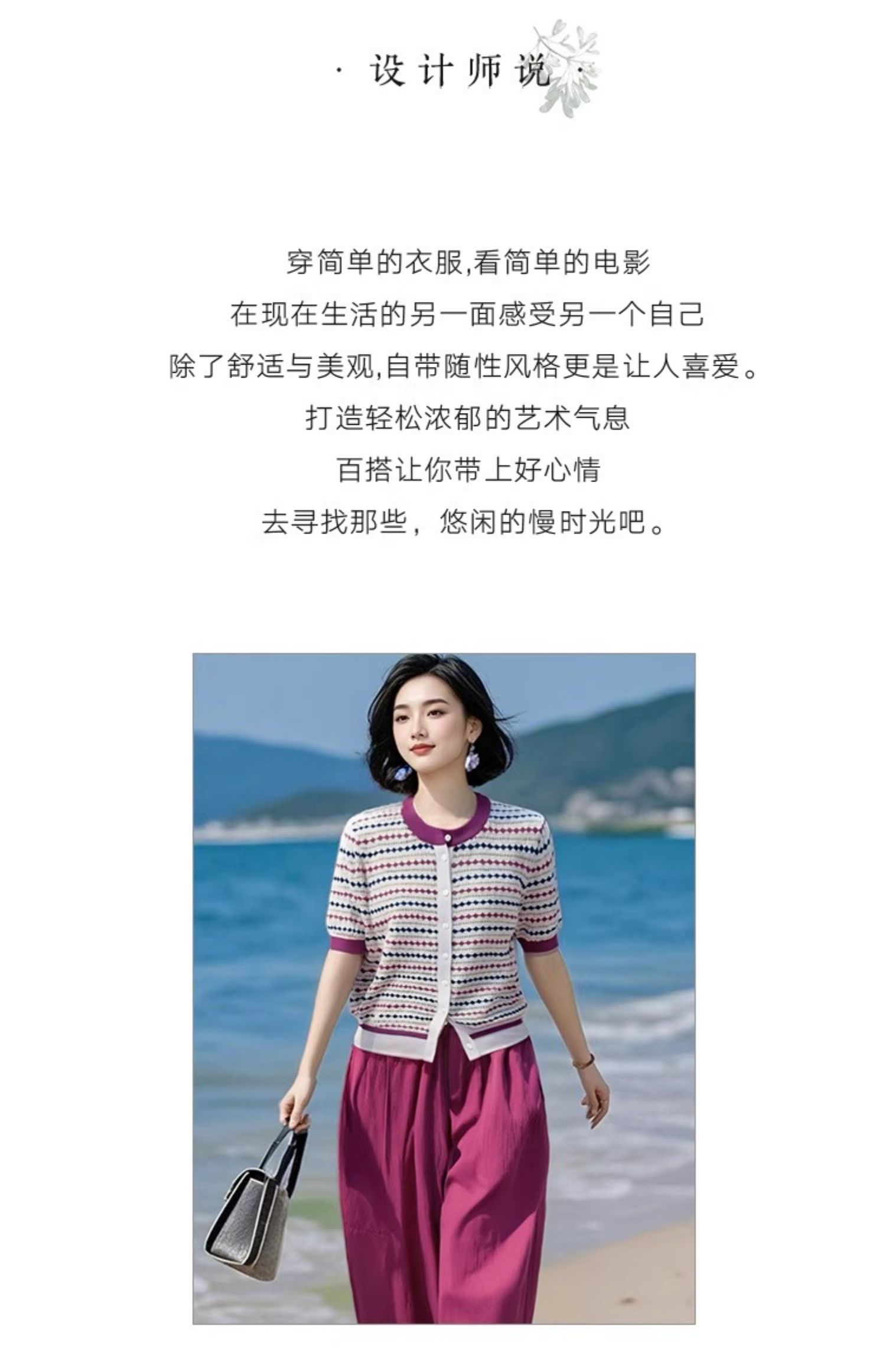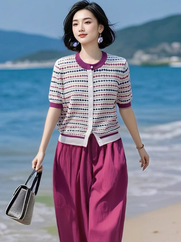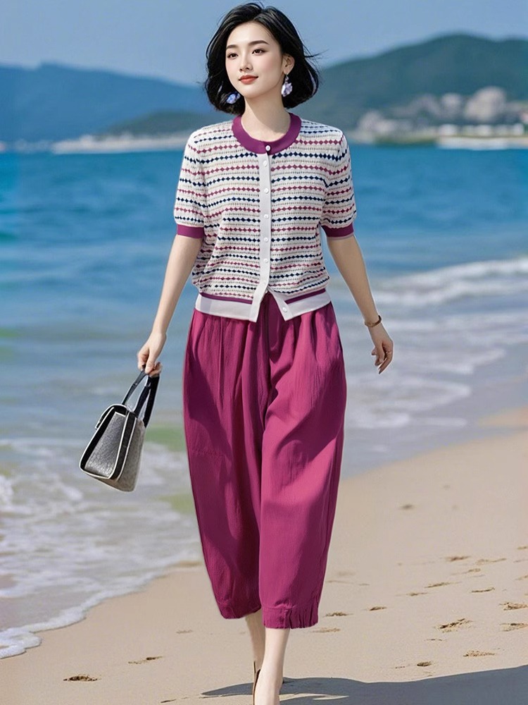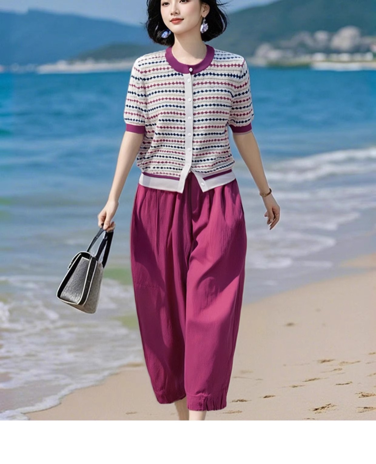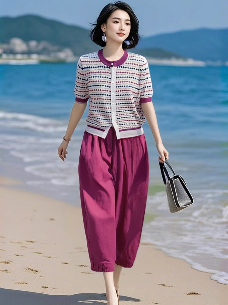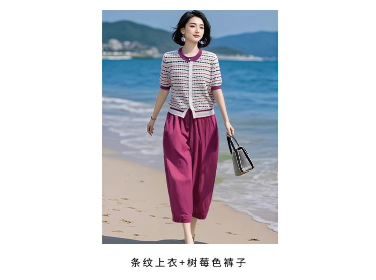 树莓色冰丝针织开衫,松紧腰哈伦裤两件套装SD-475