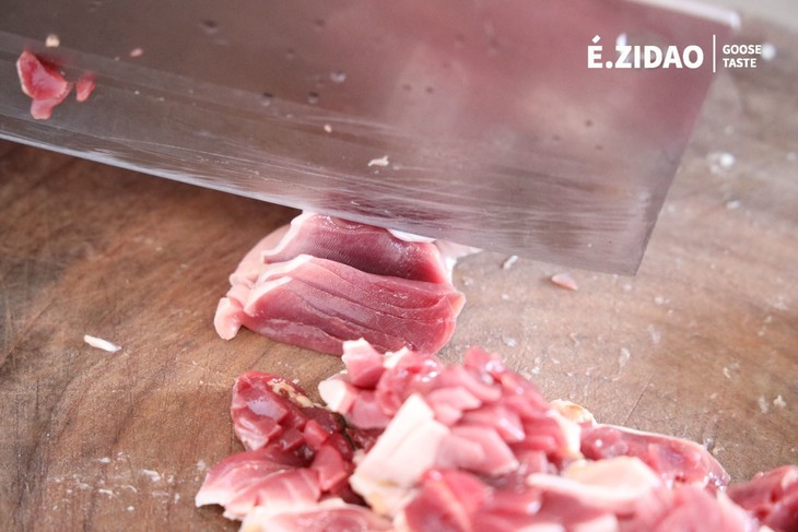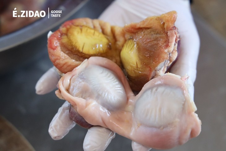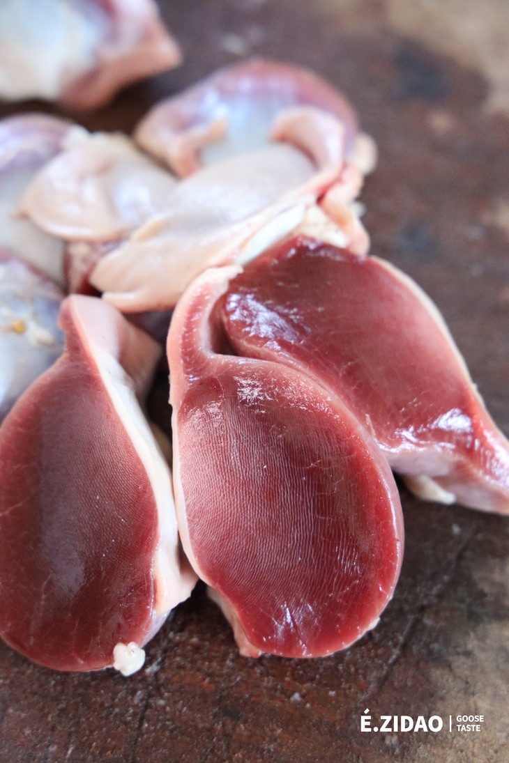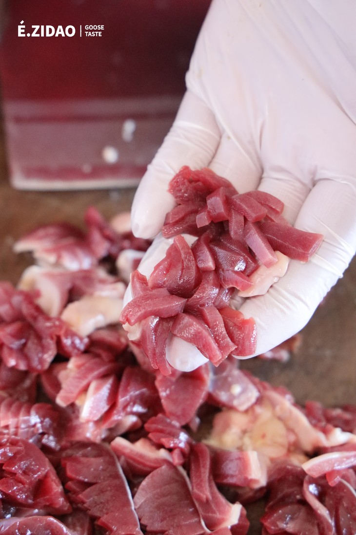 鹅杂全部是自有鹅场提供的新鲜鹅胗,不用市场冷冻货,新鲜鹅胗全部采用手工切十字花状,虽然费工费时,但是经过手工花刀的鹅胗口感才好,Q弹韧嫩,容易入味颜值高。