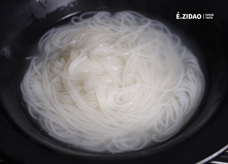 煮好的米线,倒入鹅杂料包,最后淋上油包,放入葱包,即可享用美食。