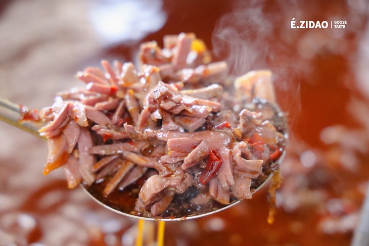 以鹅油做底,佐以重庆特色辣椒及各种香料,烧制时不用香精调味,仅靠油温慢慢烧制,用热激发出各种香料的香气,最后加入鹅杂烹煮入味。