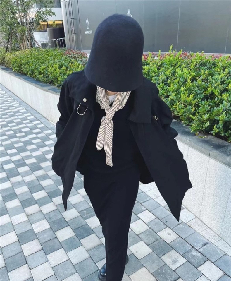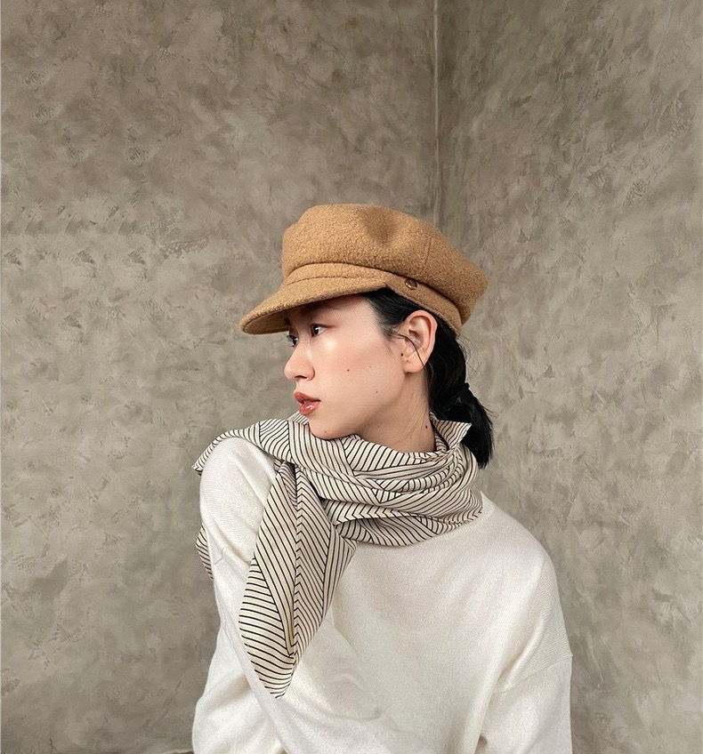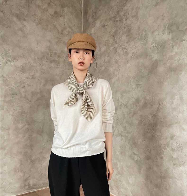 一条很好搭配的北欧几何风双绉丝巾,尺寸是90*90cm,米色底黑色条纹,随便披一下都很有高级感