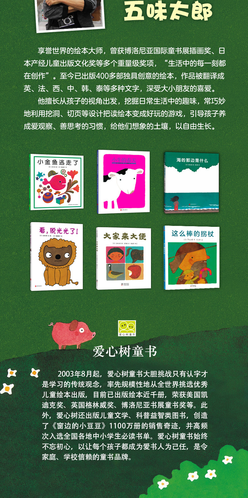 在生活中不管遇到多么微不足道的事,五味太郎都能从中获得启发。他肯定人生,积极乐观,每次和他谈话,都让我好像又回到年轻的时候。 ——日本绘本作家林明子