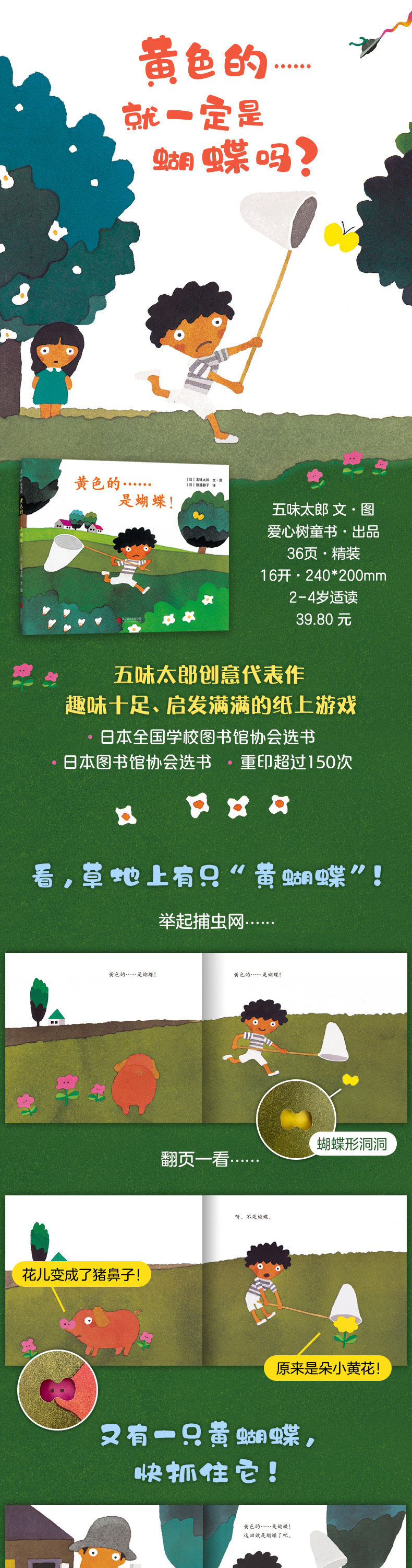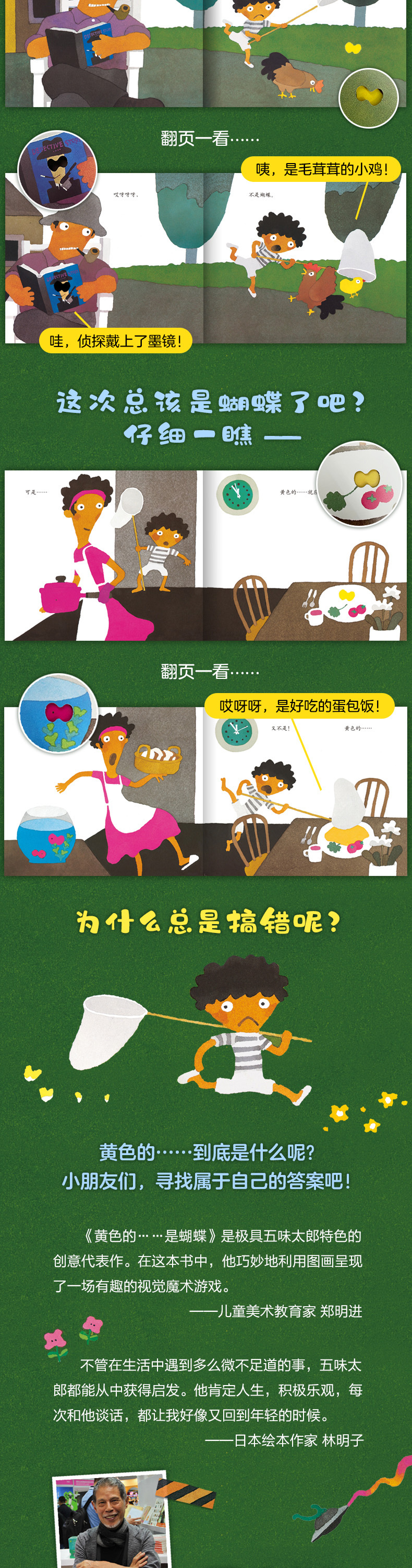 《黄色的……是蝴蝶!》是集合五味太郎特色的创意代表作。他在这本书中,充分的展现了有如魔术般的图像游戏。 ——儿童美术教育家郑明进