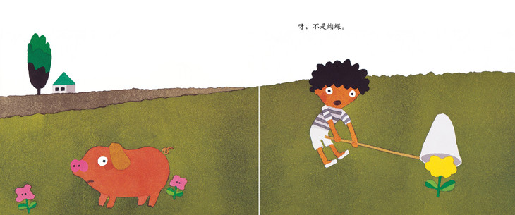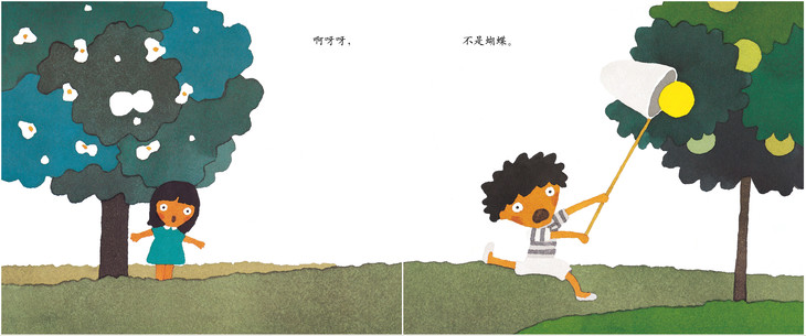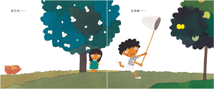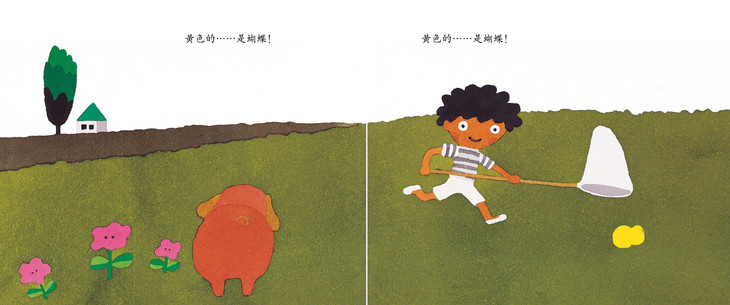 草地上有只黄蝴蝶!小男孩举起捕虫网……可翻页一看,呀,原来是一朵小黄花!快看,又有一只黄蝴蝶,快抓住它……咦,怎么是个黄气球?黄色的……一定是蝴蝶吗?翻开书,和小男孩一起追蝴蝶吧!