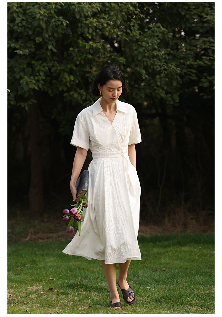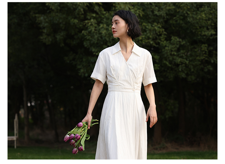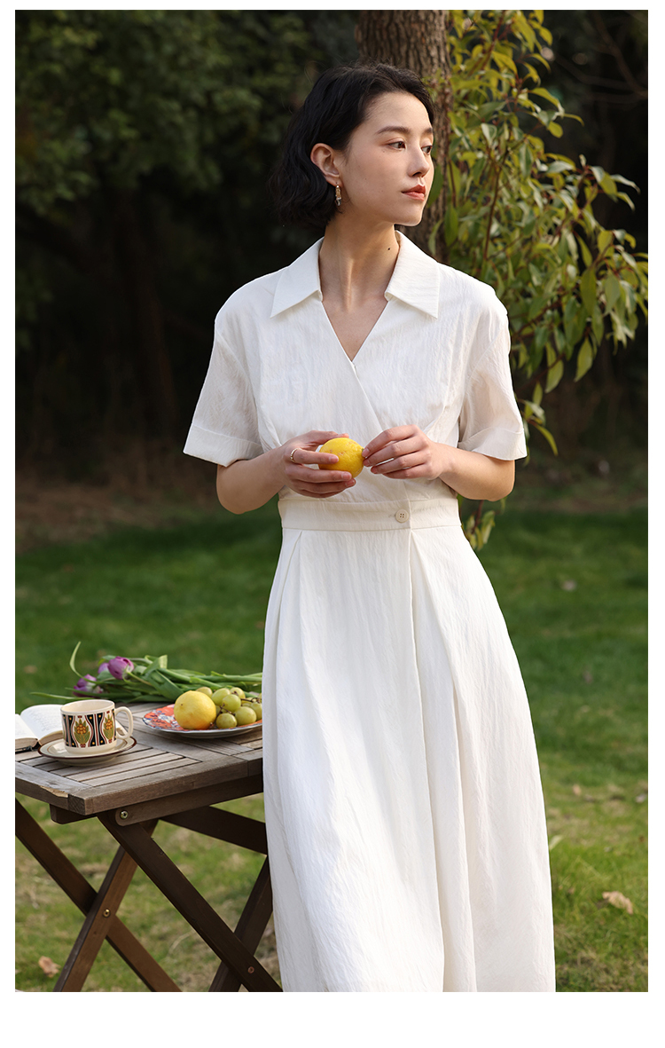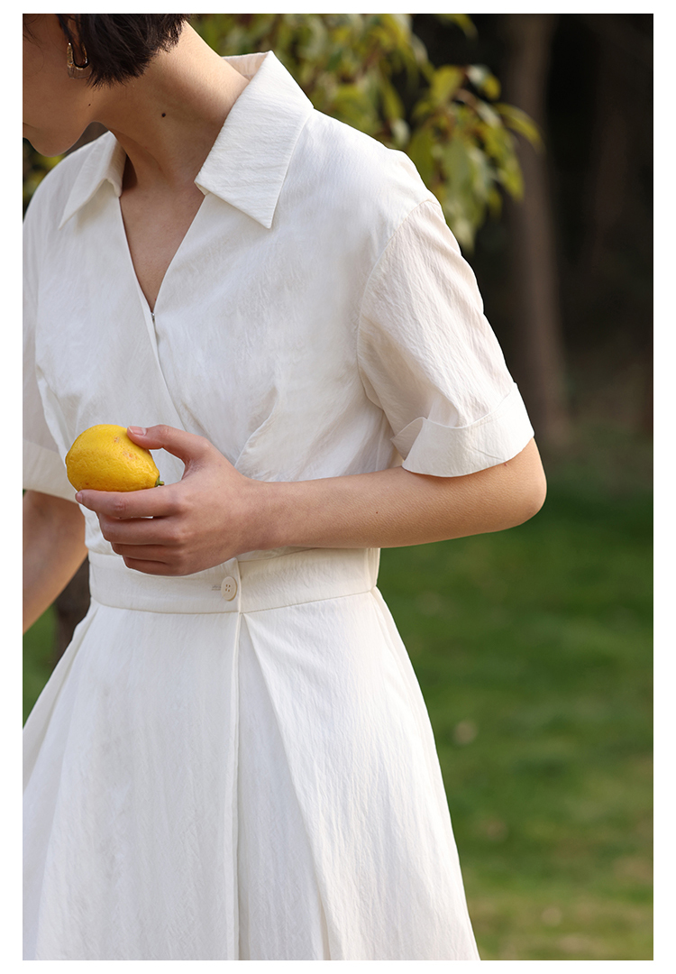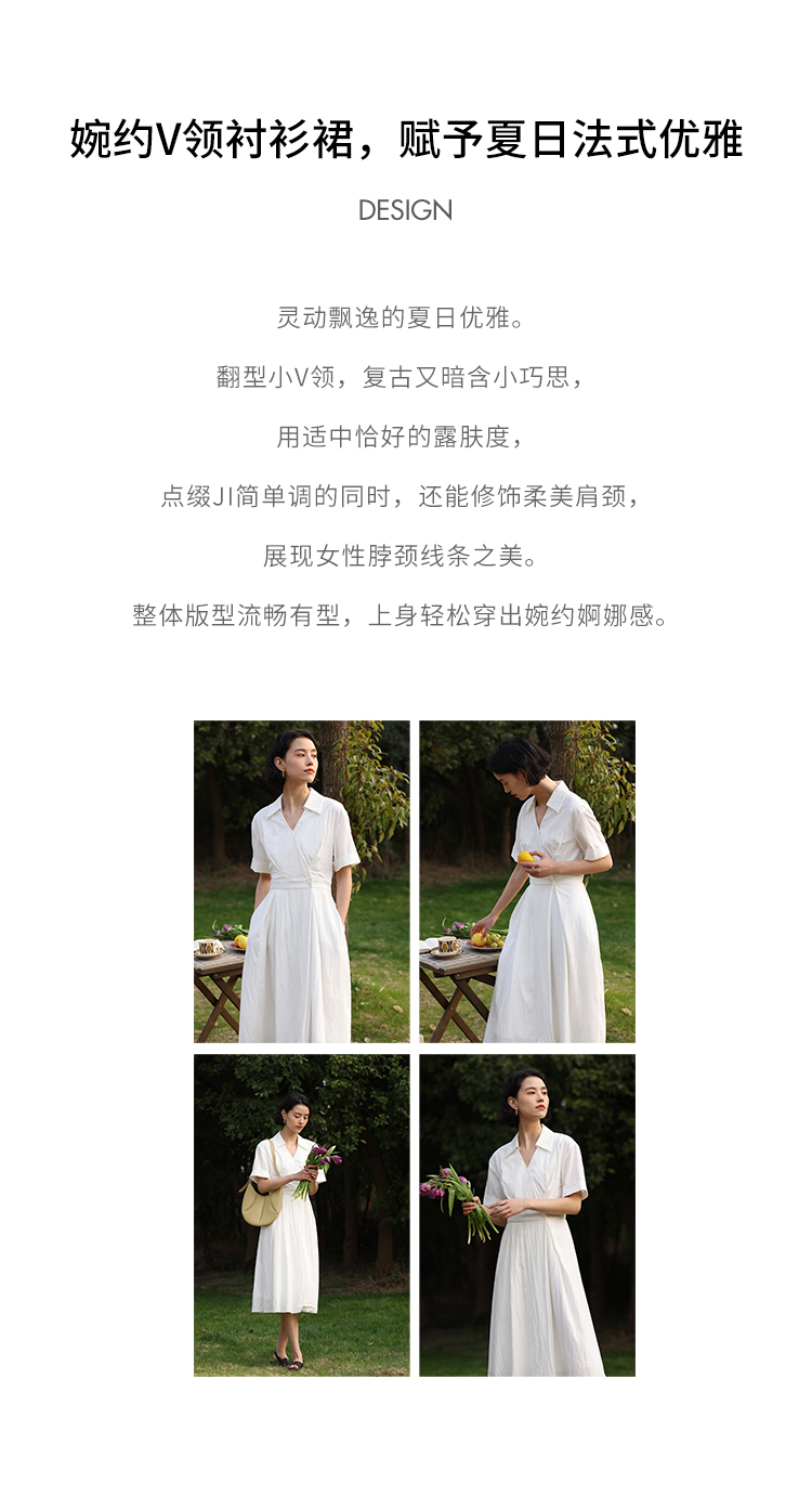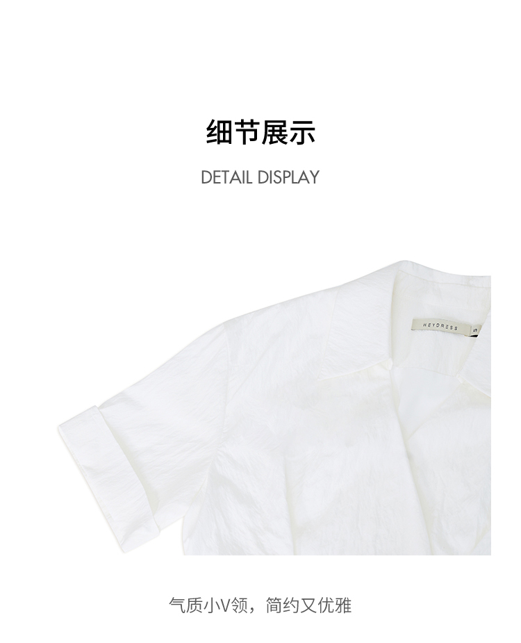 HeyDress法式衬衫连衣裙女夏季复古V领收腰白色肌理感气质初恋裙