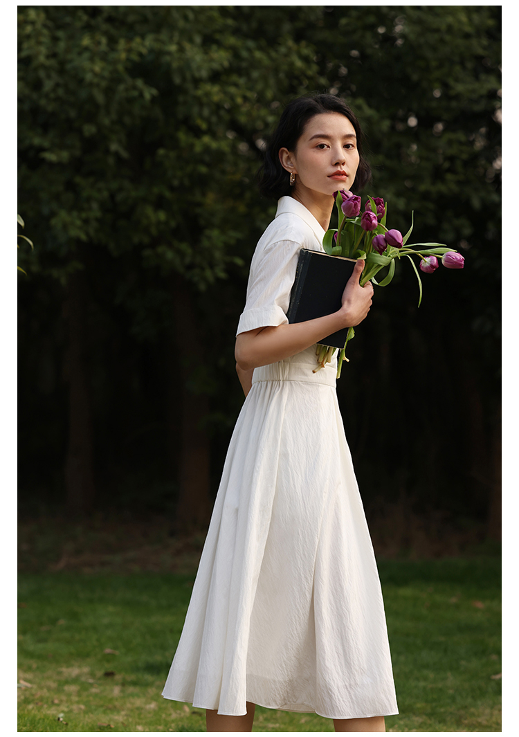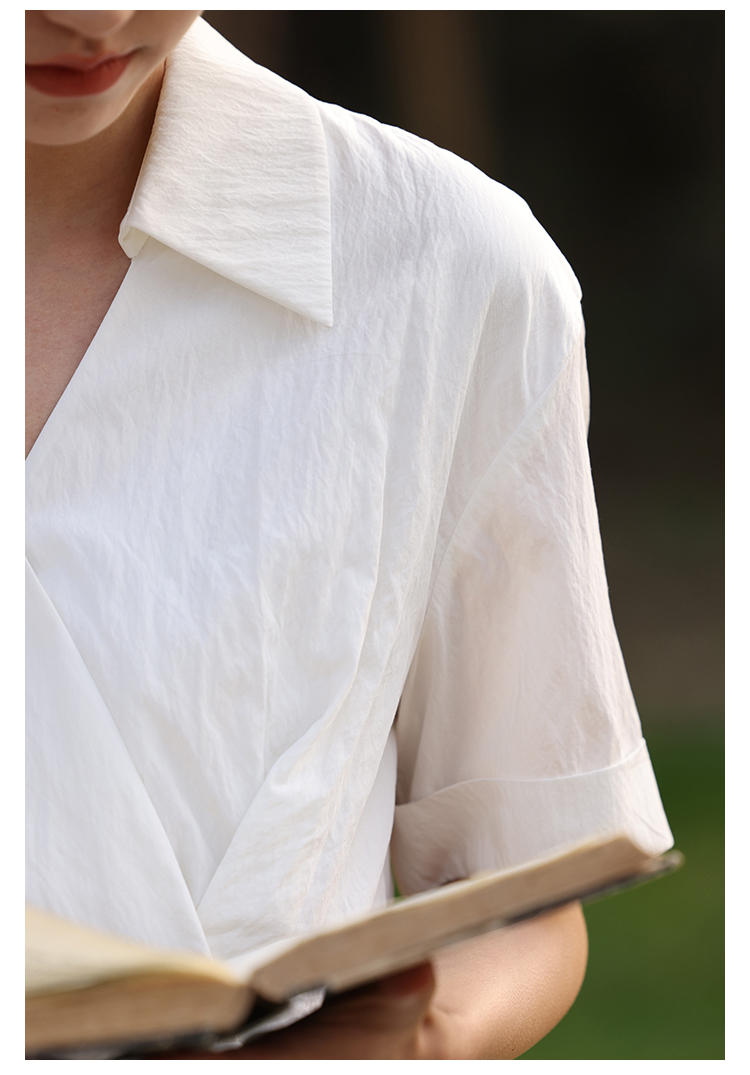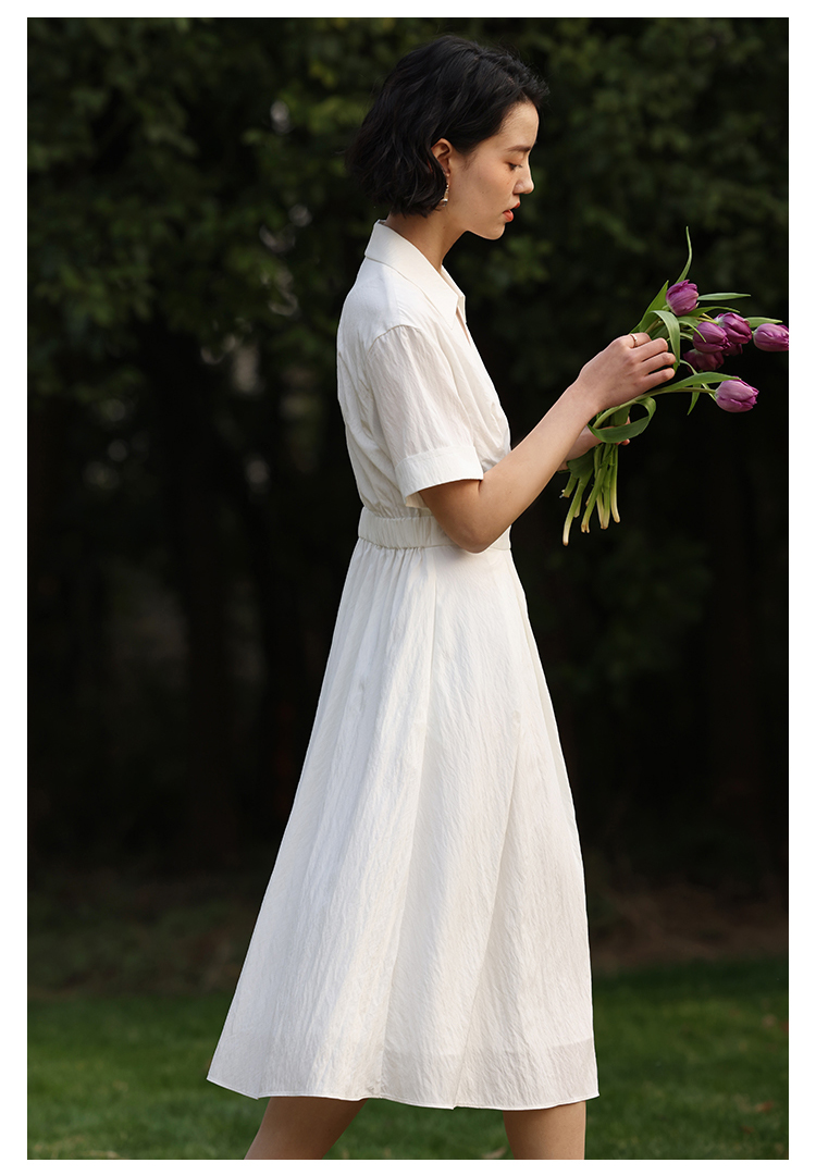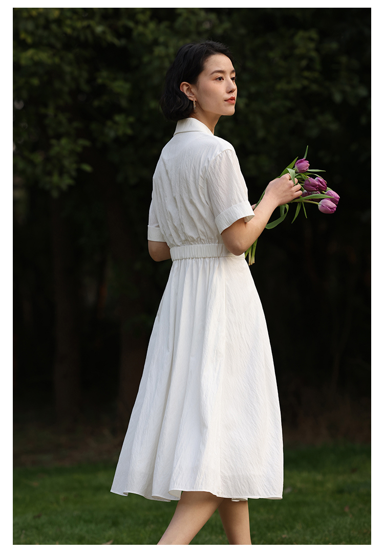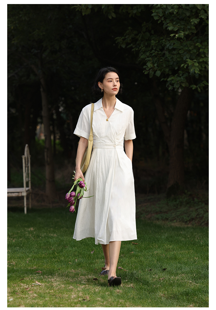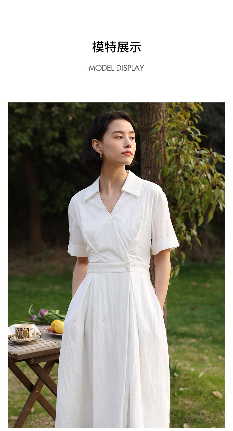 HeyDress法式衬衫连衣裙女夏季复古V领收腰白色肌理感气质初恋裙