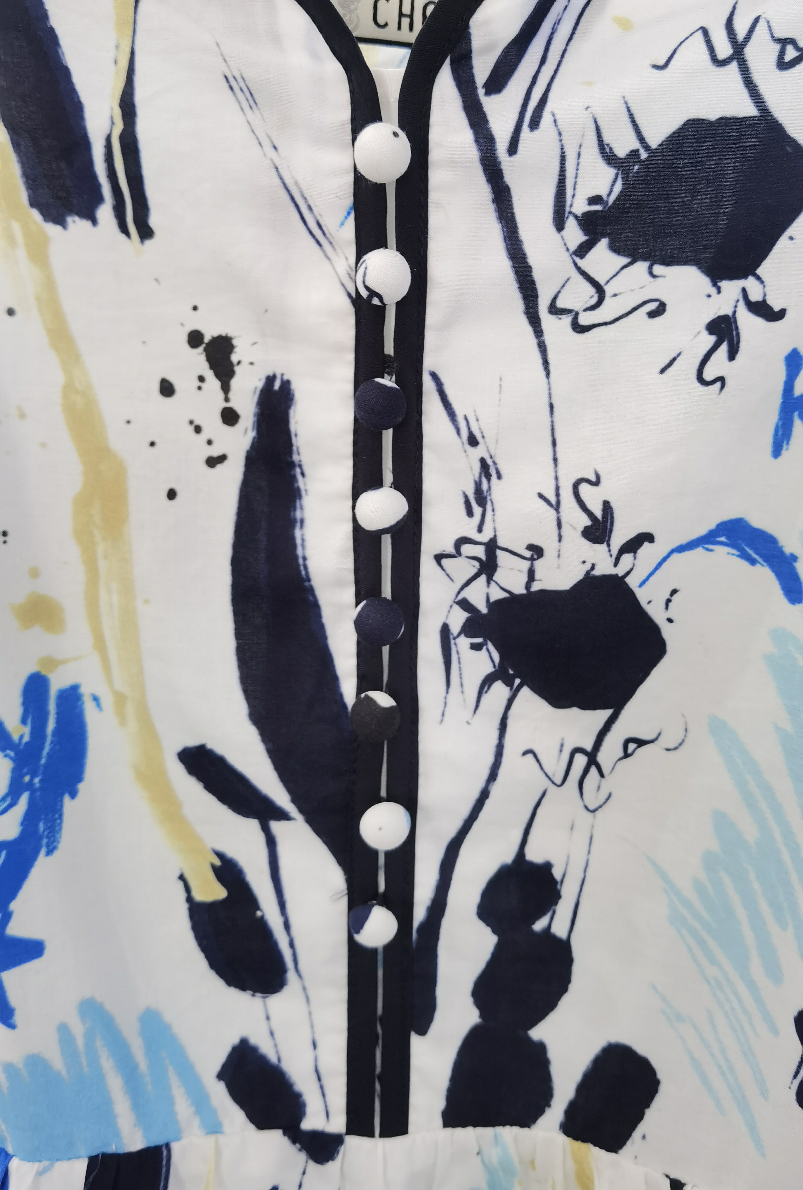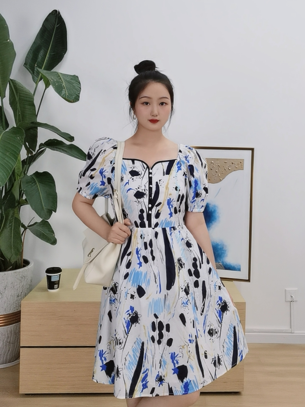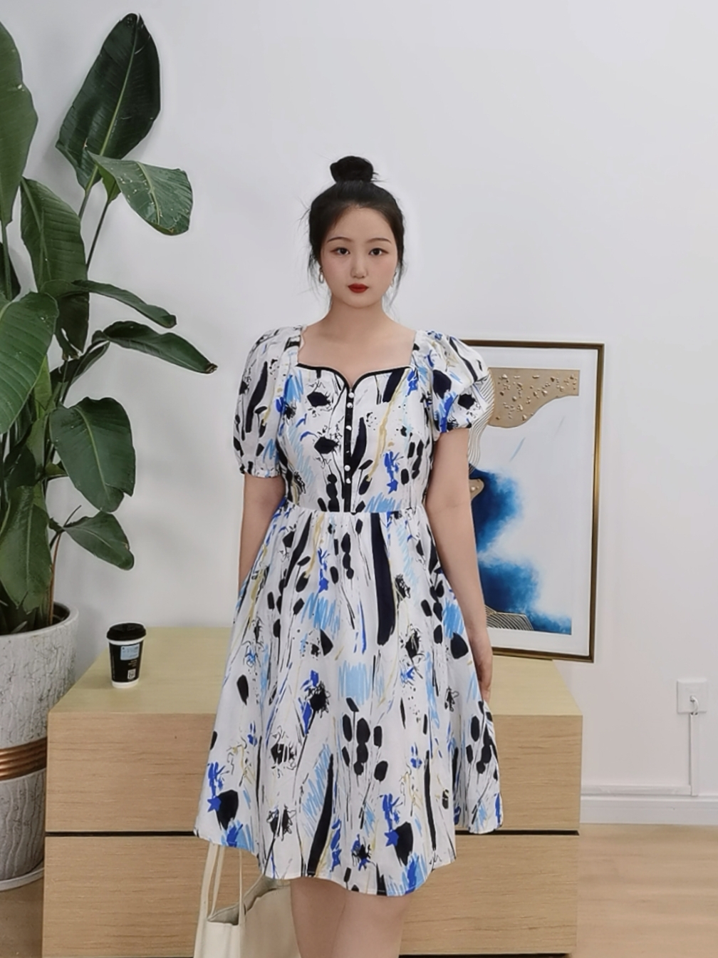 【抽象画印花裙】臣禾方领泡泡袖连衣裙K222021157