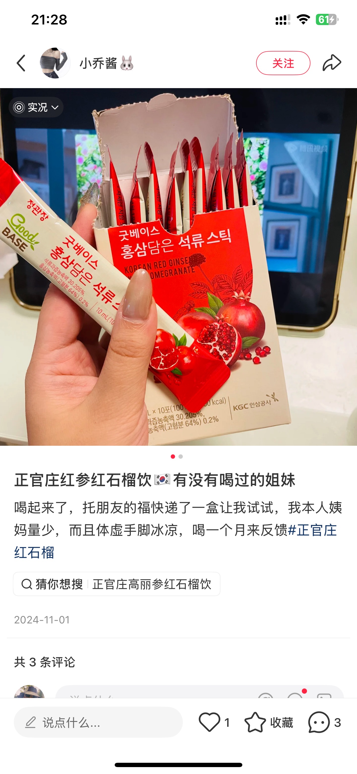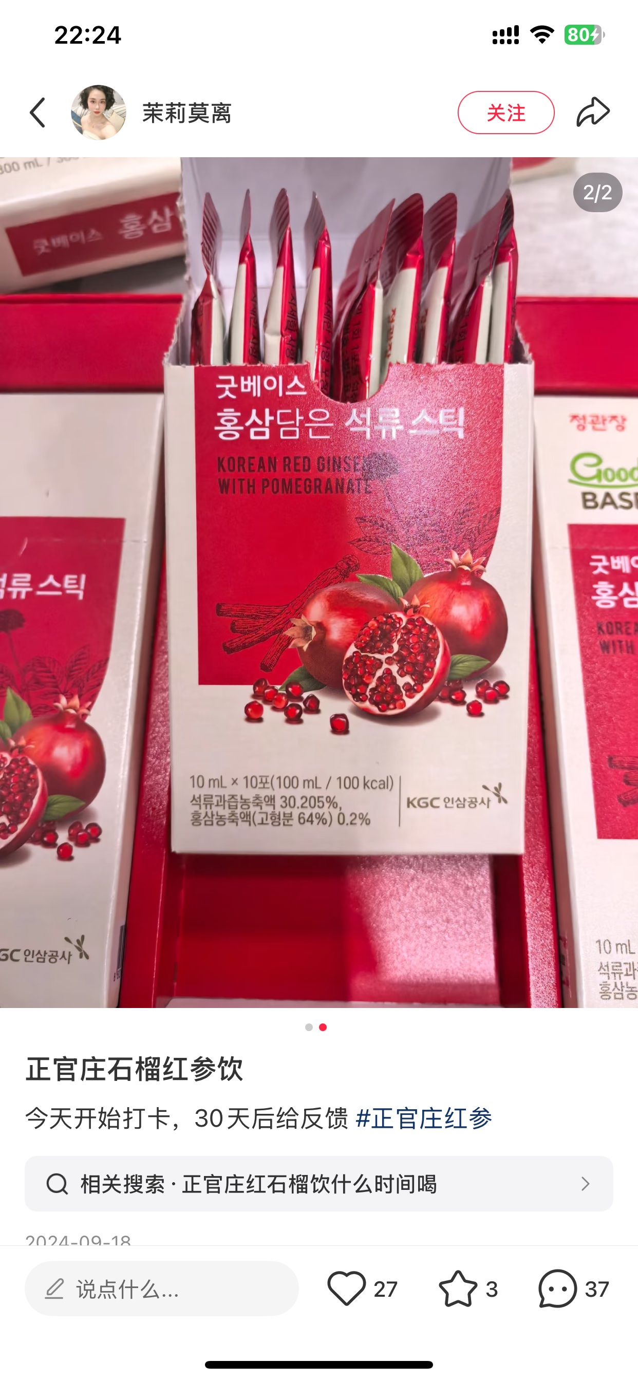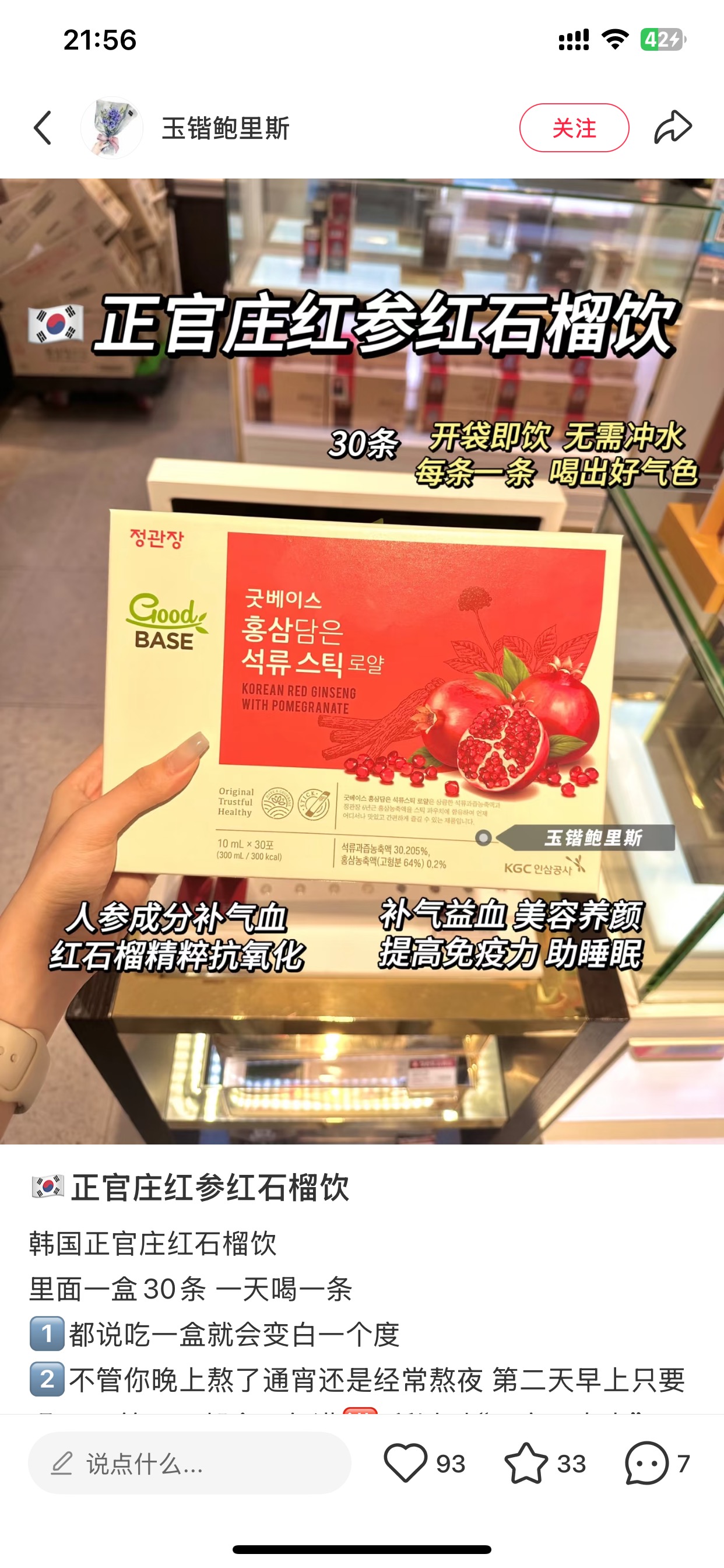 韩国人精力旺盛皮肤还好的秘诀‼️韩国明星没有人不喝它!正官庄红石榴饮, 我们是韩国本土版,跟国内在卖的不一样,我们全韩文的,用的是韩国6年高丽参,国产在卖的正官庄用的是5年内的吉林人参!不一样的!!!这个牌子多叼你们知道的啊, 几乎不降价! 韩国本土版, 都落魄成这价格了! 用的是6年的高丽参! 补气血, 抗氧化,调节内分泌,美容养颜同时, 还能增强免疫力, 助睡眠! 气血好了, 姨妈都好了