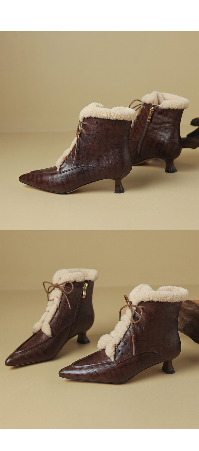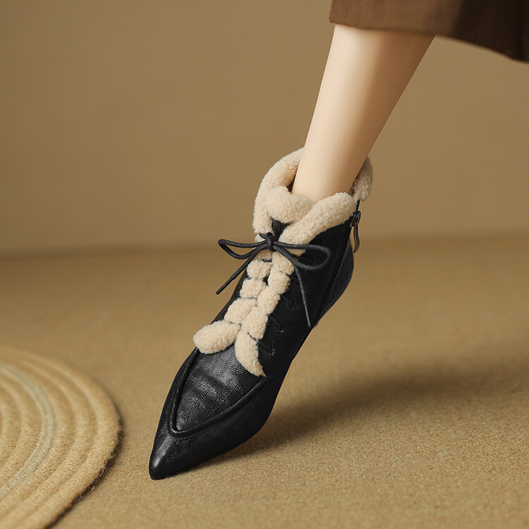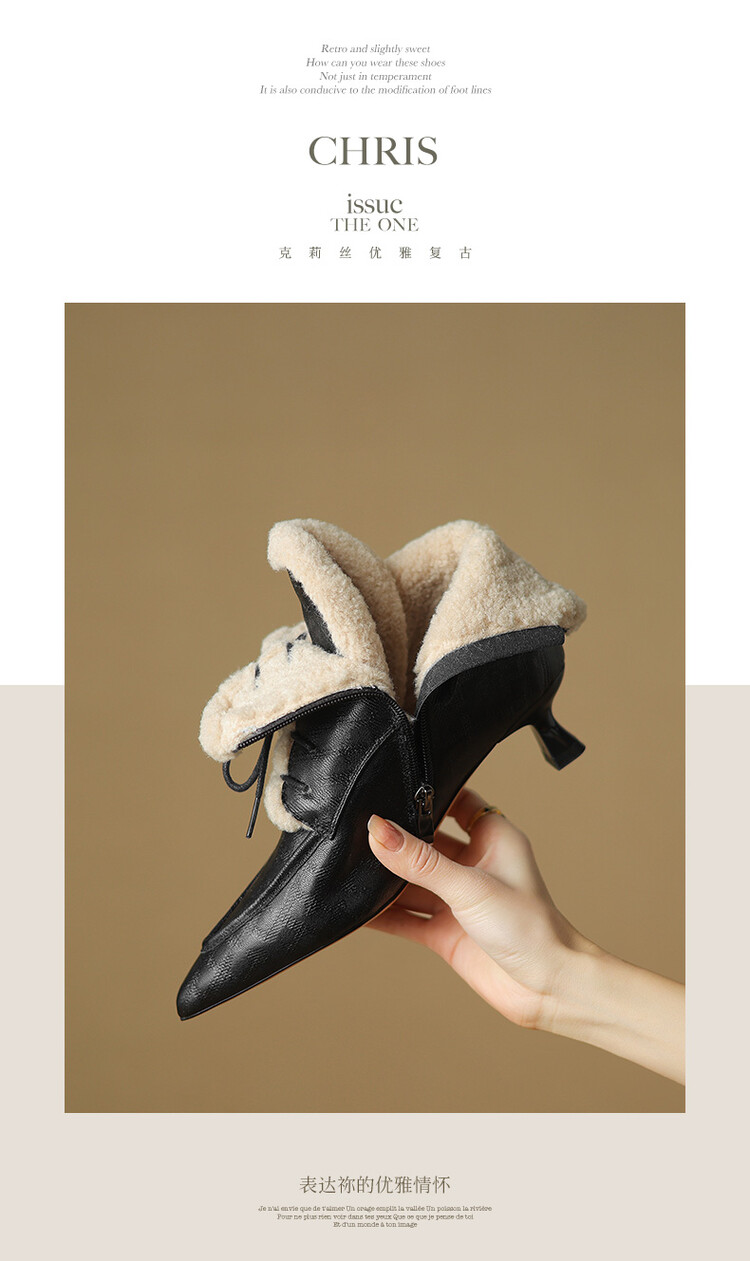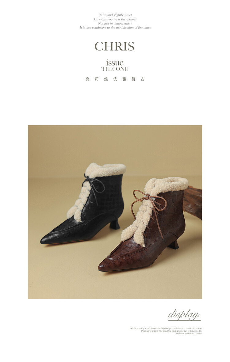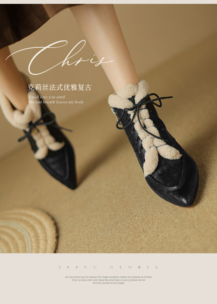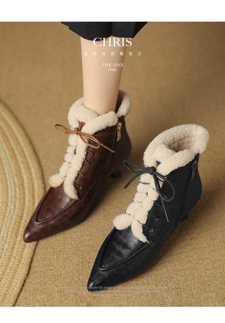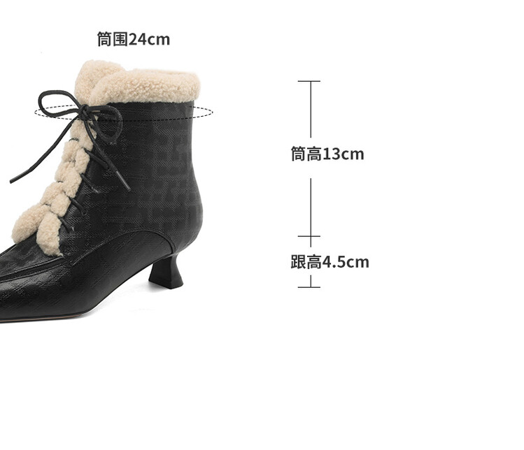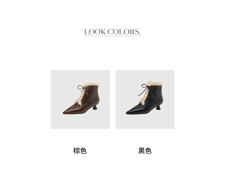 【预售5天】加厚保暖通勤小短靴冬季羊皮细低跟OL尖头真皮系带踝靴女DB&M5785M