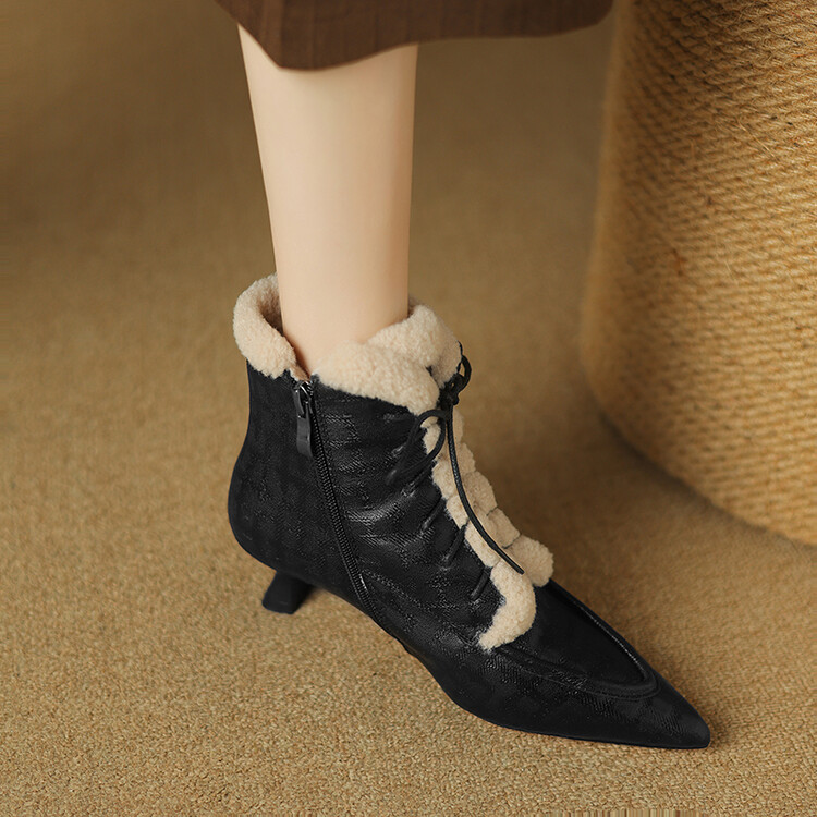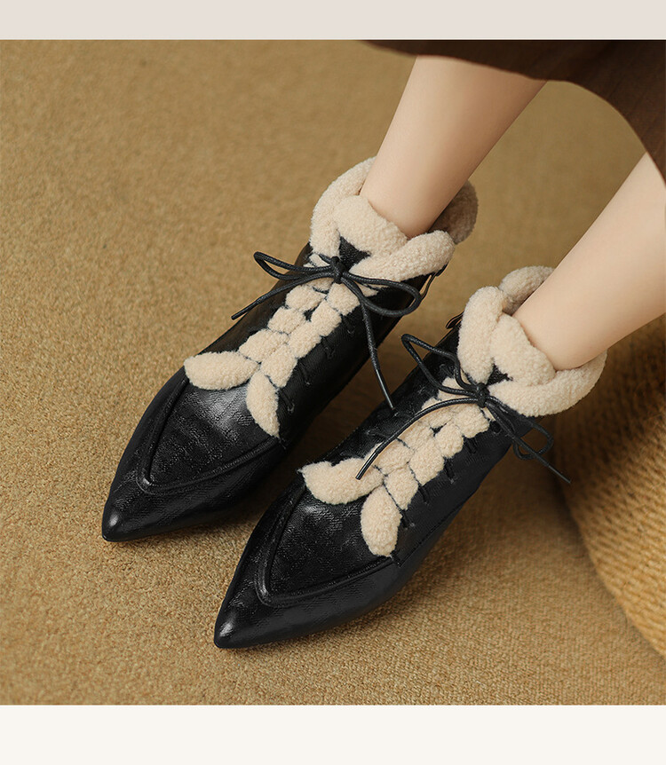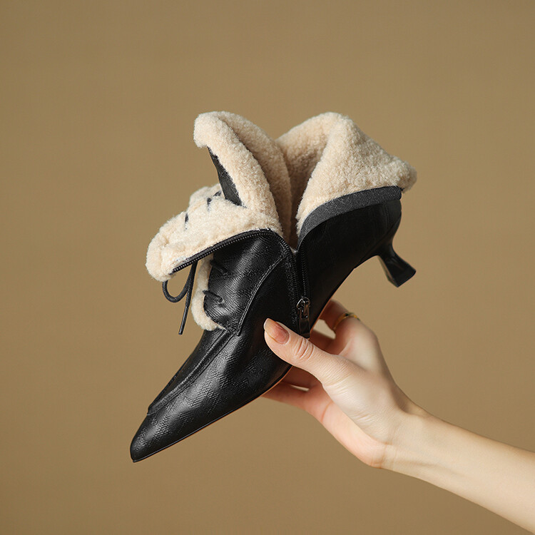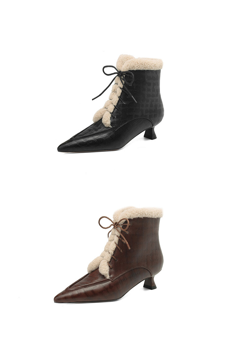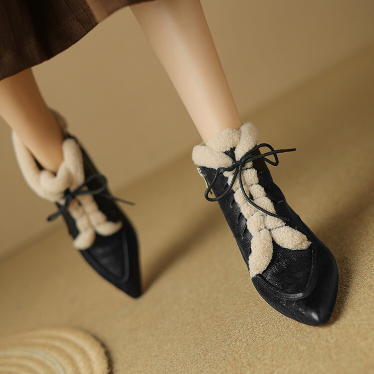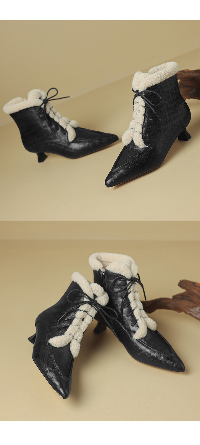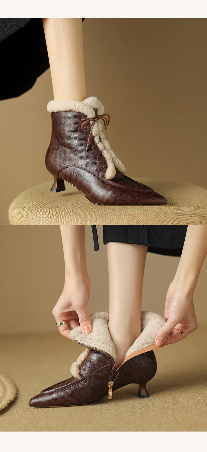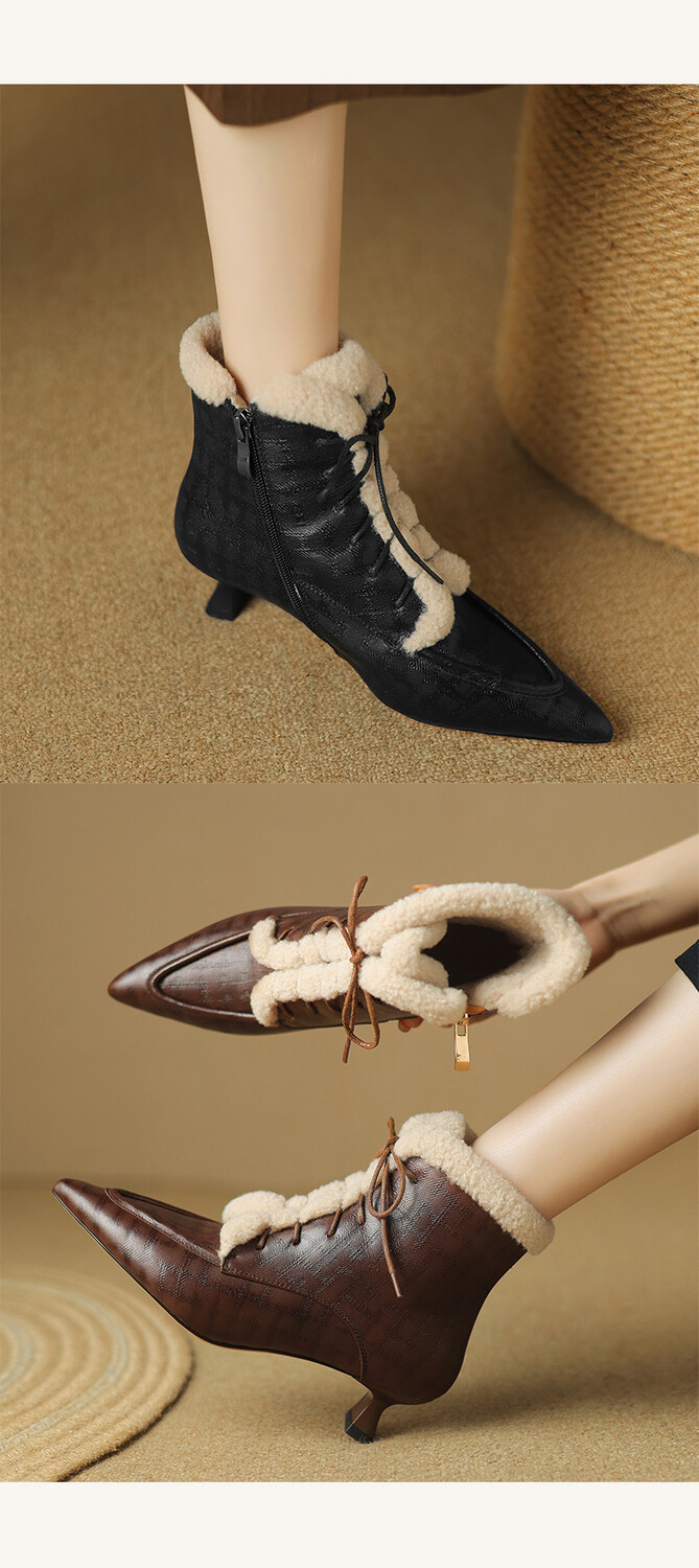 【预售5天】加厚保暖通勤小短靴冬季羊皮细低跟OL尖头真皮系带踝靴女DB&M5785M