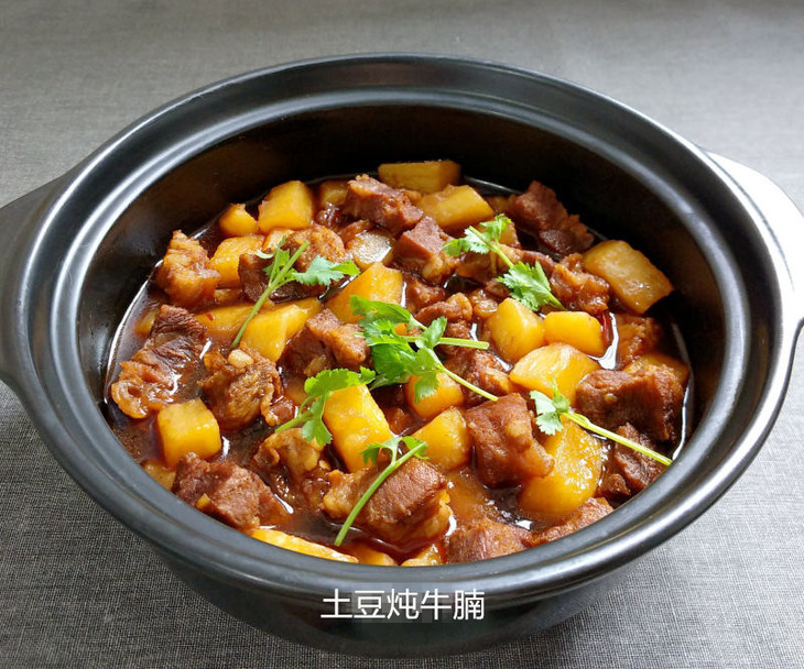 牛腩炖土豆:这道菜非常好吃,牛肉味道浓郁,土豆软化入味,牛腩里炖出的牛油味香浓。土豆炖牛腩这道菜要做的好吃,最关键的是要选用牛腩肉。
