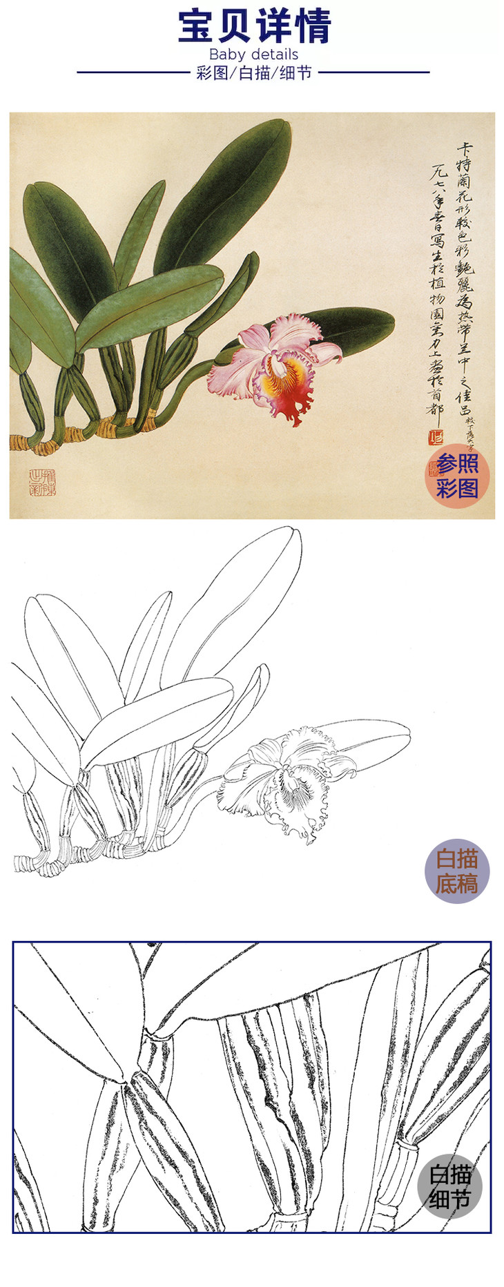 俞致贞工笔花鸟白描底稿-兰花《卡特兰》-斗方小品册页-JV13
