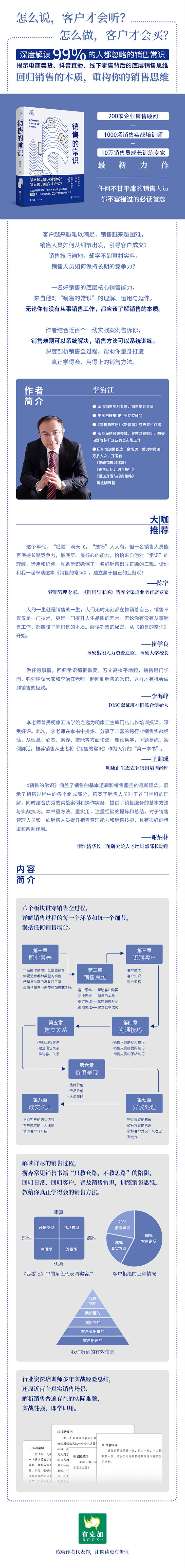 做任何事情,回归常识都很重要。万丈高楼平地起,销售是门学问,强烈建议大家和李治江老师一起回到销售的常识,这样才有机会做到销售的极致。